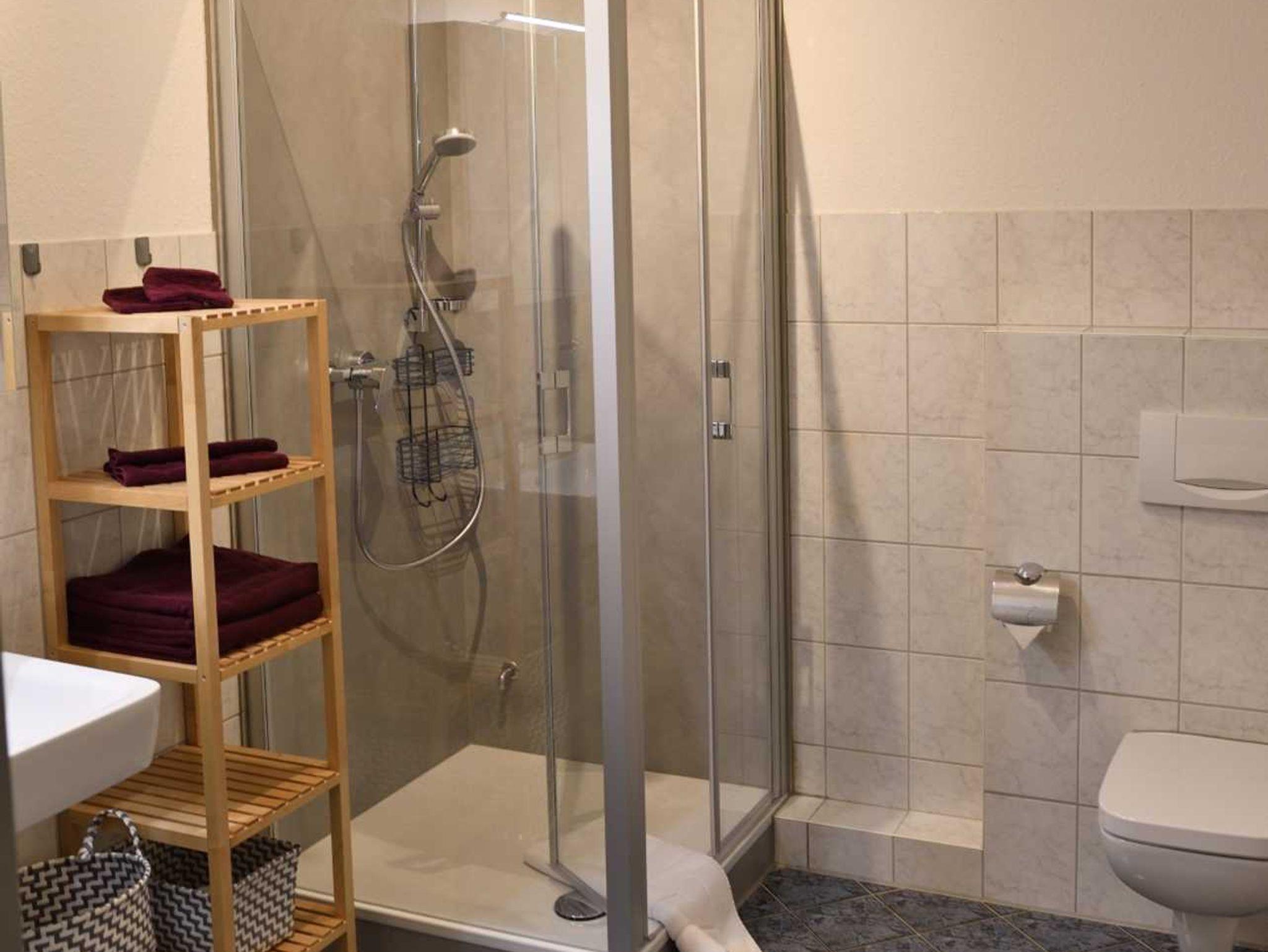einem Doppelbett (180×200 cm) und einem Badezimmer mit Dusche.