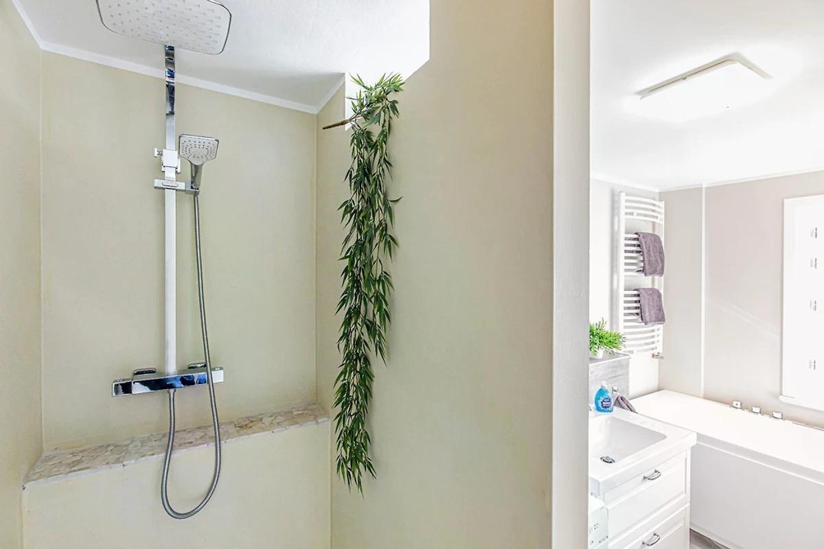 Im Badezimmer ist eine große Dusche, ein Waschtisch, eine Waschmaschine und eine luxus Whirlpool Badewanne mit Whirl- Air- und Farblichttherapie in der man so richtig entspannen kann.