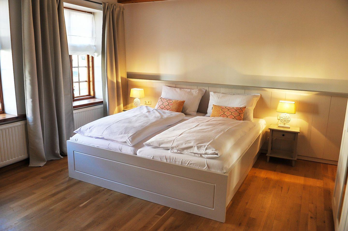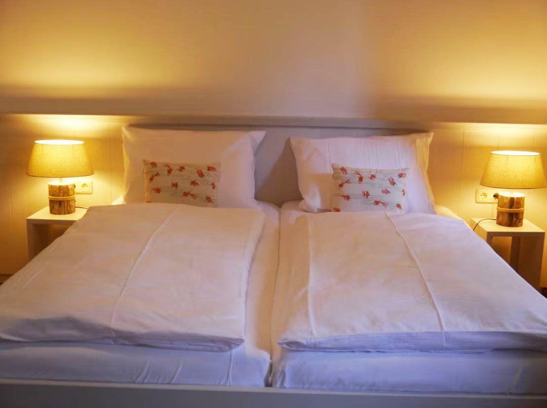 In den beiden Schlafzimmern erwarten Sie gemütliche Doppelbetten (2x90x200 cm) mit offenem Fußende. Beide Räume bieten ausreichend Stauraum durch Kleiderschränke und Verdunklungsmöglichkeiten, damit Sie erholsame Nächte verbringen können.