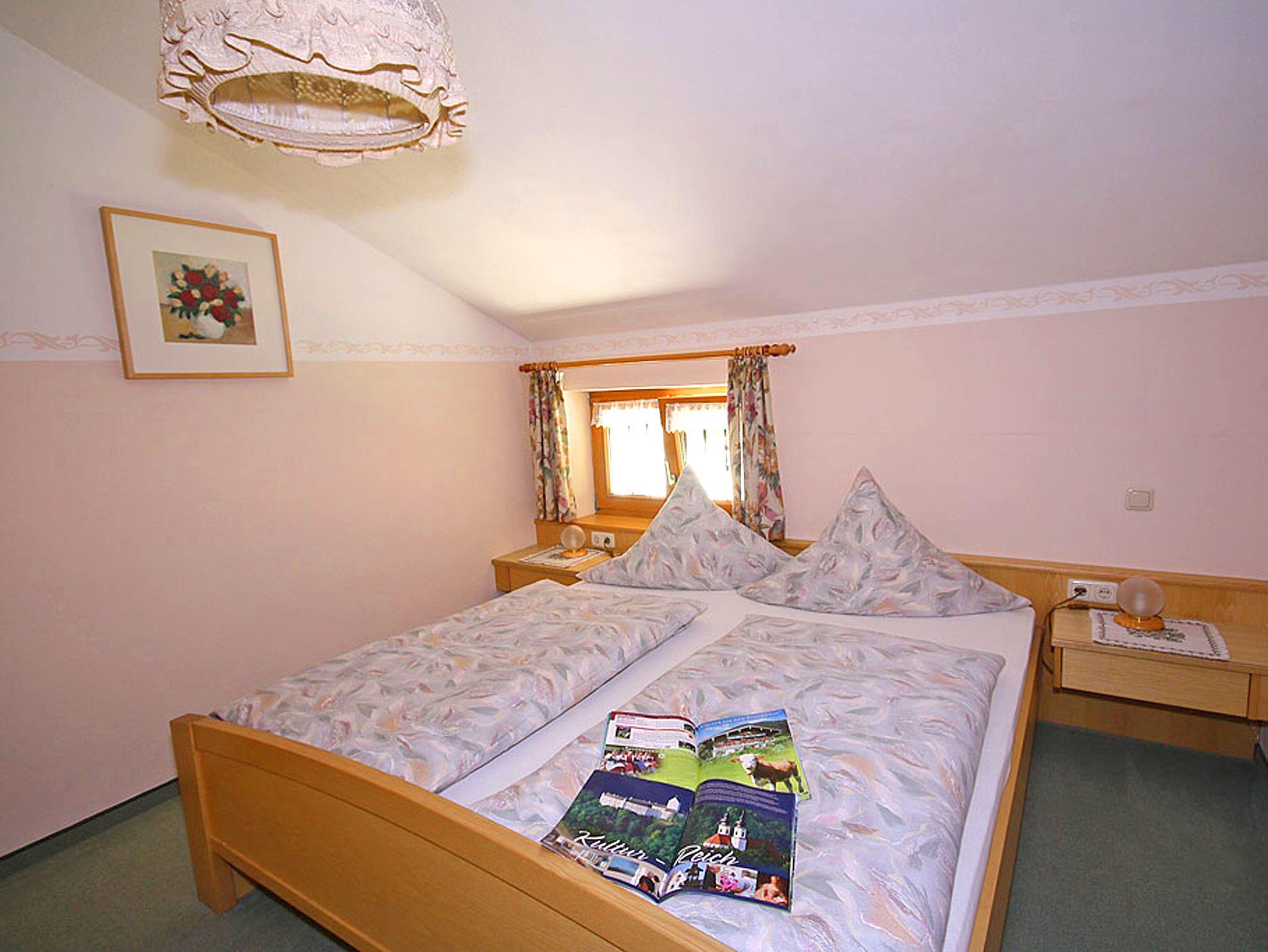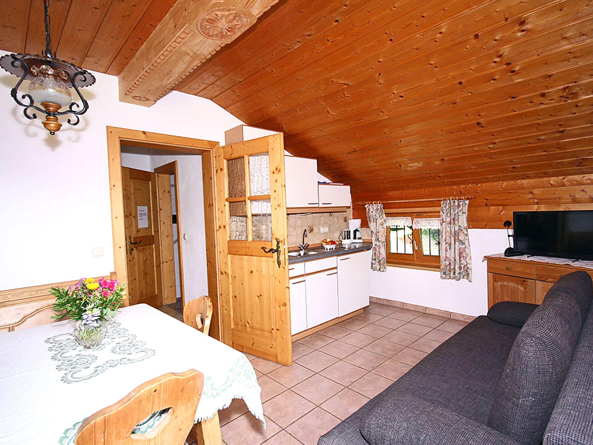 Unsere gemütliche 36 qm Dachgeschoss-Ferienwohnung Bergblick bietet Ihnen ein separates Schlafzimmer mit Doppelbett. Wohnküche mit ausziehbaren Schlafsofa, Flachbild-SAT-TV, Küchenzeile mit Herd/Backofen, Kühlschrank, Toaster, Wasserkocher und Essecke, von der Sie einen wunderbaren Blick auf den Zahmer Kaiser genießen können. Von der Wohnküche aus, erreichen Sie den Südbalkon mit Balkonmöbel, um zu Entspannen und mit herrlichem Ausblick. Badezimmer mit Dusche/WC und Fön. Diele mit Garderobe. Bettwäsche und Handtücher sind inklusive. Leider können wir keine Haustiere und Hunde aufnehmen.