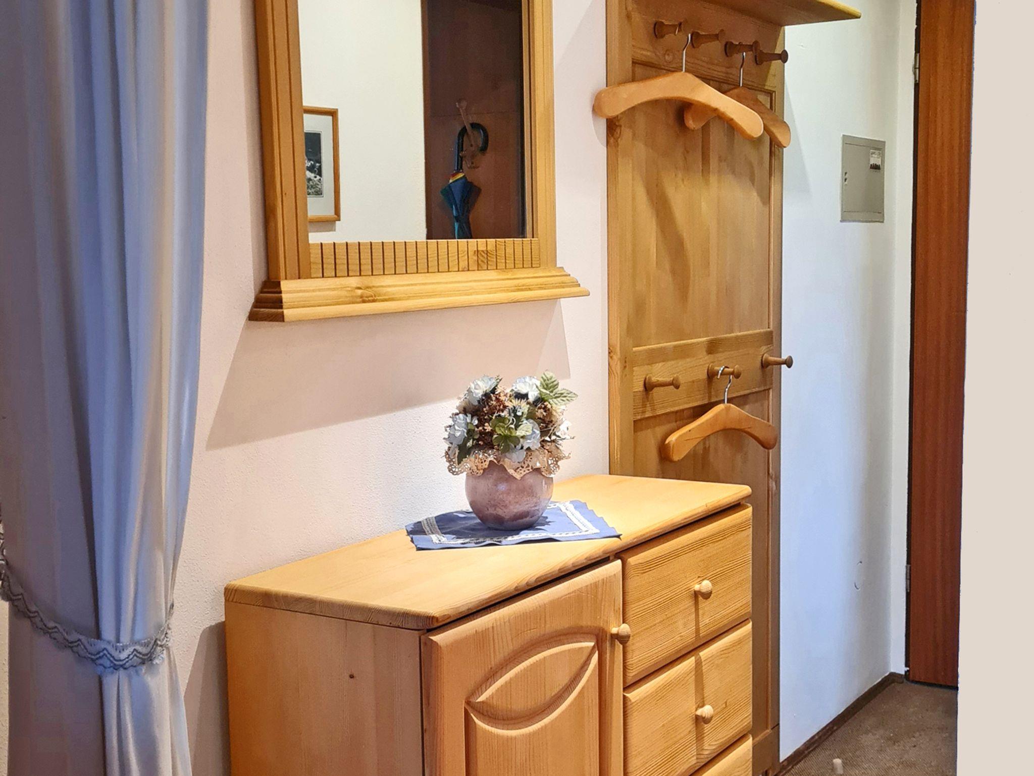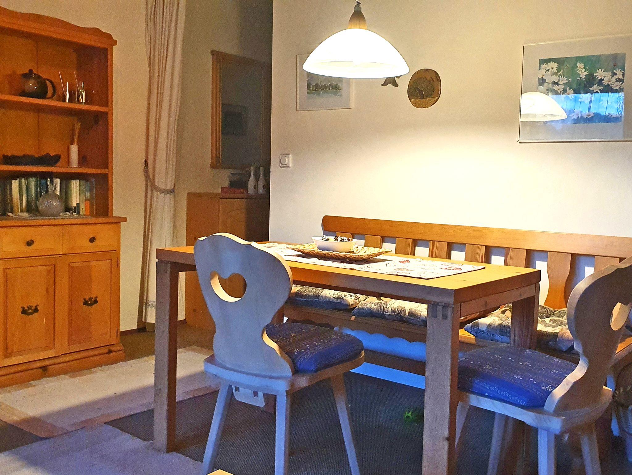 Unsere charmante Nichtraucher-Ferienwohnung im gemütlichen alpenländischen Stil empfängt Sie mit viel Holz, warmen Farben und einer liebevoll zusammengestellten, komplett ausgestatteten Einrichtung. Hier finden Sie alles, was Sie für entspannte und erholsame Urlaubstage benötigen. Die Wohnung verfügt über eine einladende Diele mit Garderobe. Das separate Schlafzimmer mit einem komfortablen Doppelbett (1,80 × 2,00 m) sorgt für ruhige Nächte und erholsamen Schlaf. Das Badezimmer ist mit Dusche/WC sowie einem Fön ausgestattet. In der kleinen, aber bestens eingerichteten Küche stehen Ihnen ein Cerankochfeld, ein Backofen mit Mikrowellenfunktion, eine Filterkaffeemaschine sowie ein Kühlschrank mit Tiefkühlfach zur Verfügung – ideal, um sich auch im Urlaub bequem selbst zu versorgen. Der gemütliche Wohnraum lädt mit einem großzügigen Essplatz, einer bequemen Couch, Smart-TV und kostenfreiem WLAN zum Verweilen ein. Ob nach einer Wanderung, einem Ausflug oder für einen entspannten Abend – hier fühlt man sich sofort wohl. Ein echtes Highlight ist der großzügige Eckbalkon mit Süd- und Ost-Ausrichtung. Von hier aus genießen Sie einen herrlichen Blick auf die umliegende Bergwelt – perfekt für ein Frühstück in der Morgensonne oder einen stimmungsvollen Tagesausklang. Bitte beachten Sie, dass Hunde und andere Haustiere in der Wohnung nicht gestattet sind.