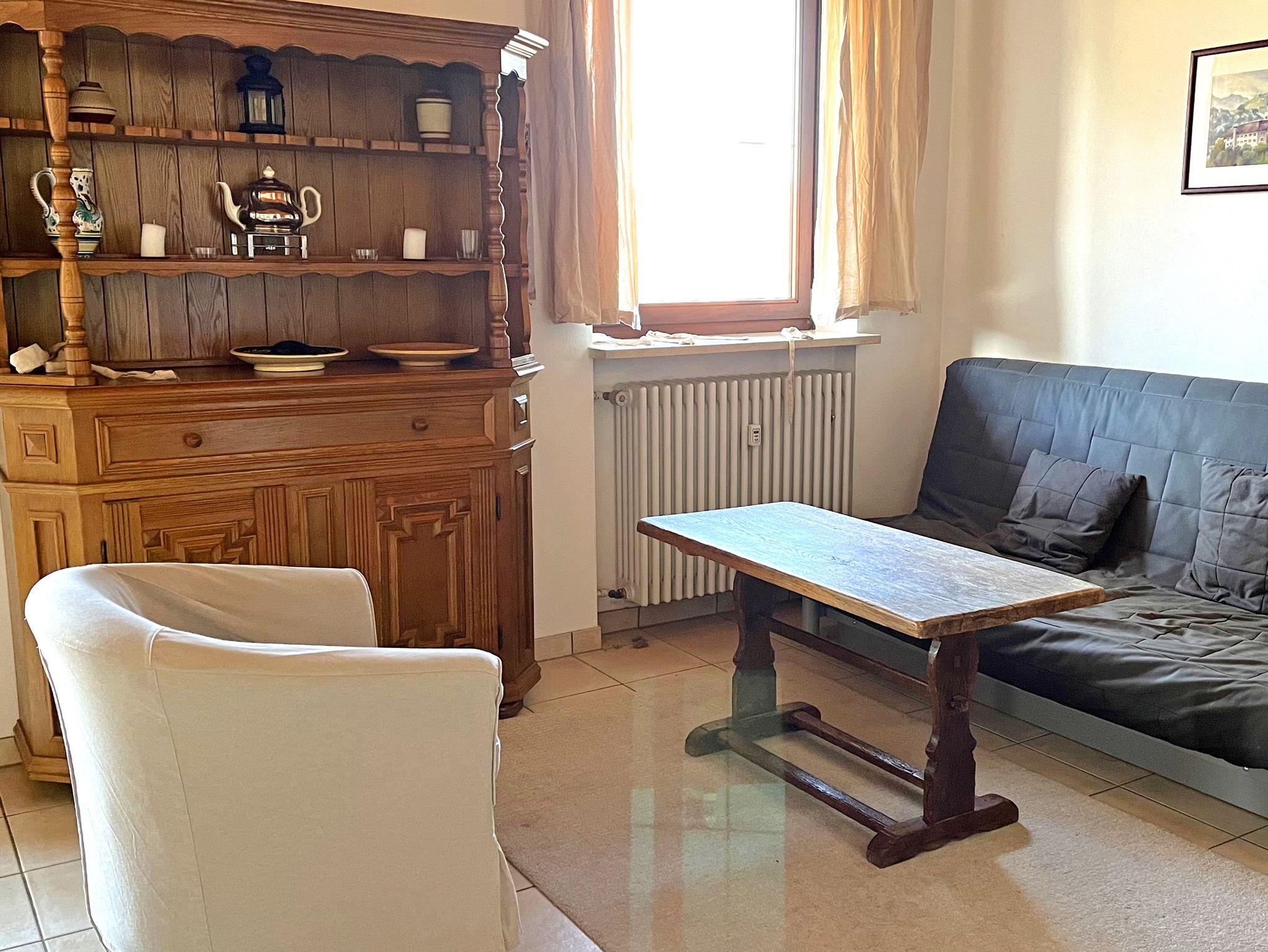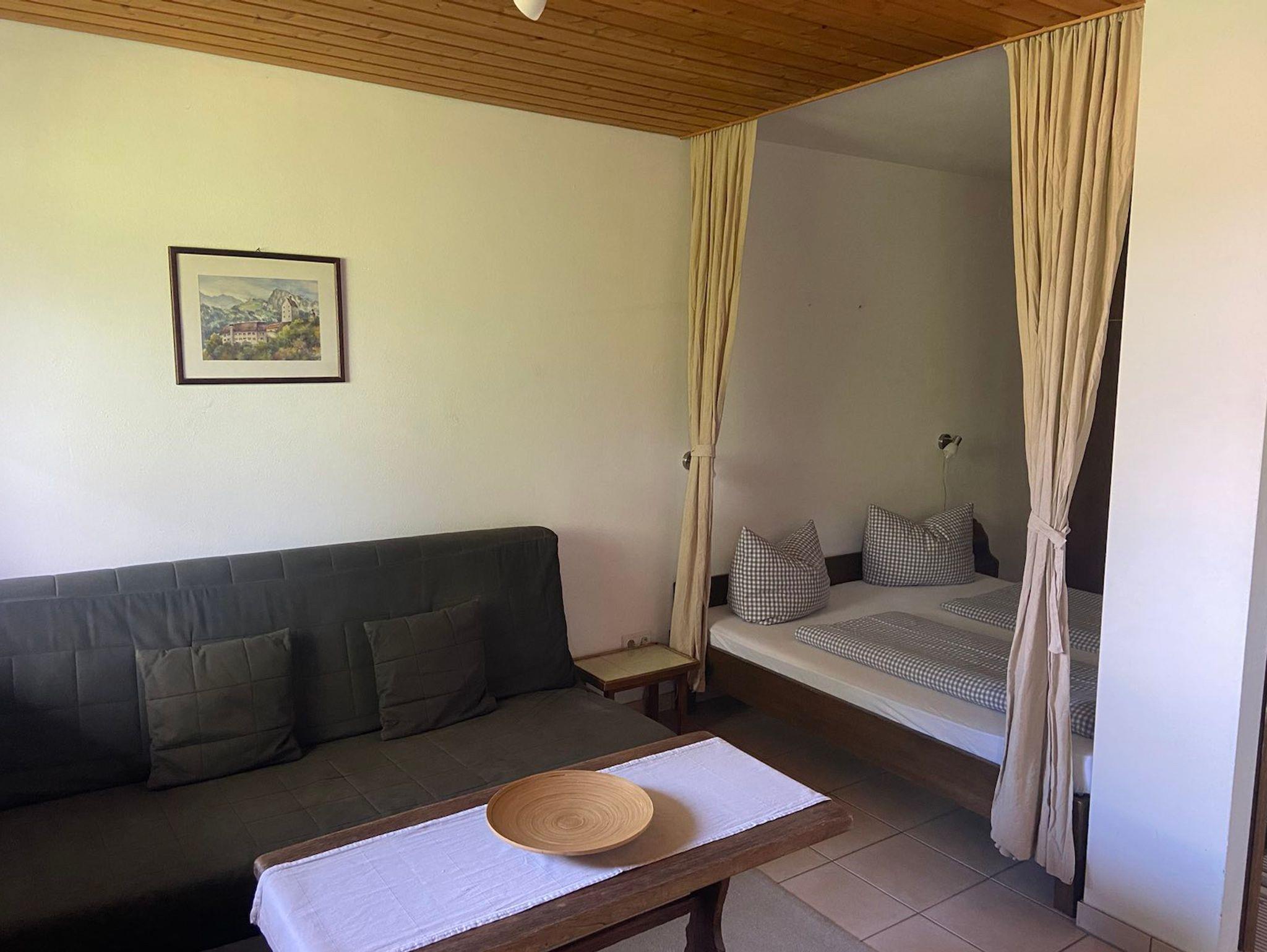 Gemütliche, helle 40 qm Ferienwohnung Wohn-/Schlafzimmer mit kleiner Küche, Geschirrspüler, Essecke, Kabel-TV, Internet über Kabelverbindung (kein W-LAN), CD-Radio, Schlafcouch und Doppelbett. Badezimmer mit Badewanne/Dusche und WC. 6 m langer Westbalkon mit Blick auf Schloss Hohenaschau und Zellerhorn. Gerne können Sie gegen Aufpreis einen Hund mitbringen.