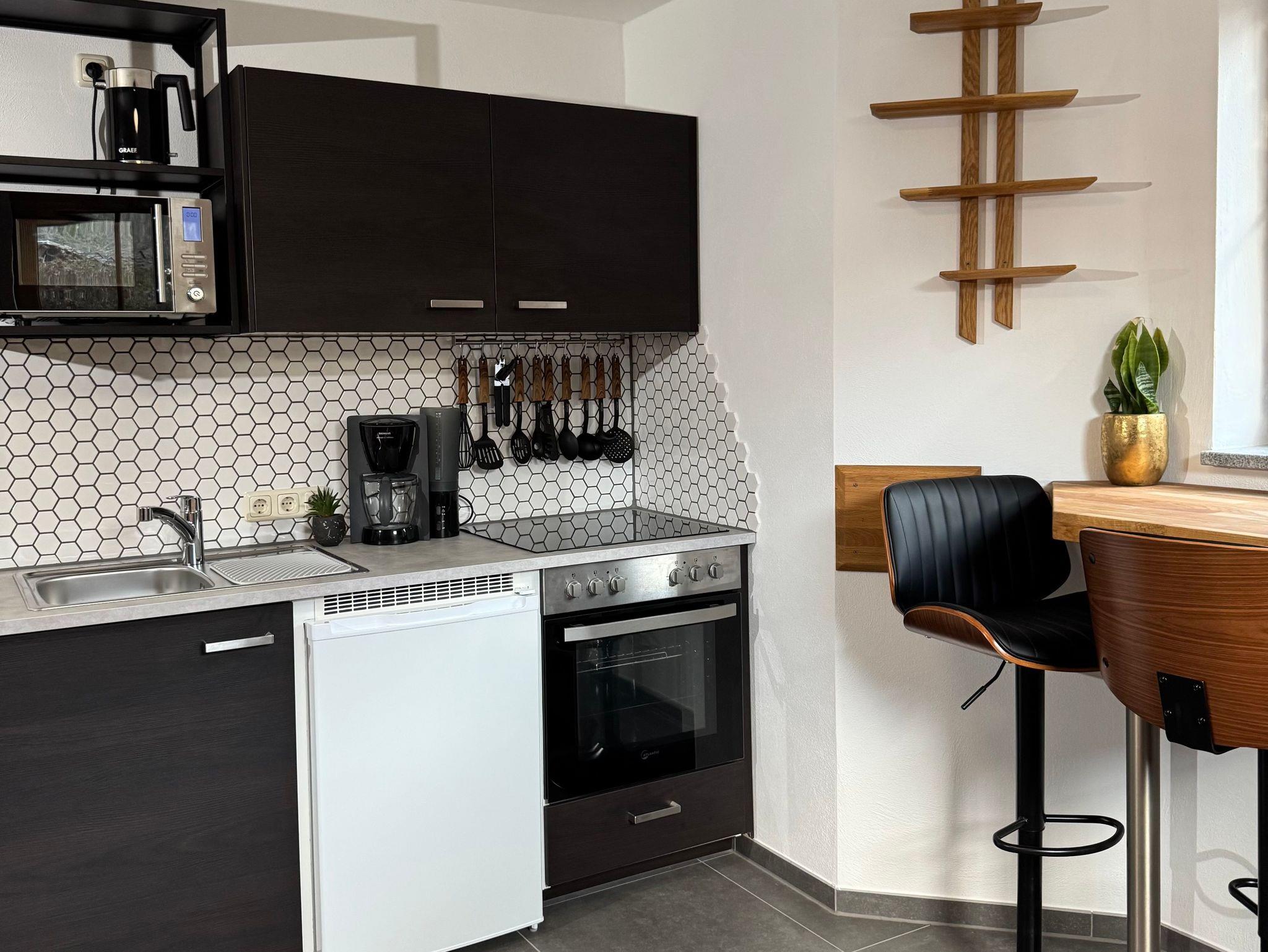 Diese gemütliche Unterkunft bietet Platz für bis zu vier Personen mit einem Doppelbett und einem Hochbett. Die gut ausgestattete Küchenzeile enthält einen Backofen, Herd, Kaffeemaschine, Wasserkocher, Kühlschrank und Toaster.