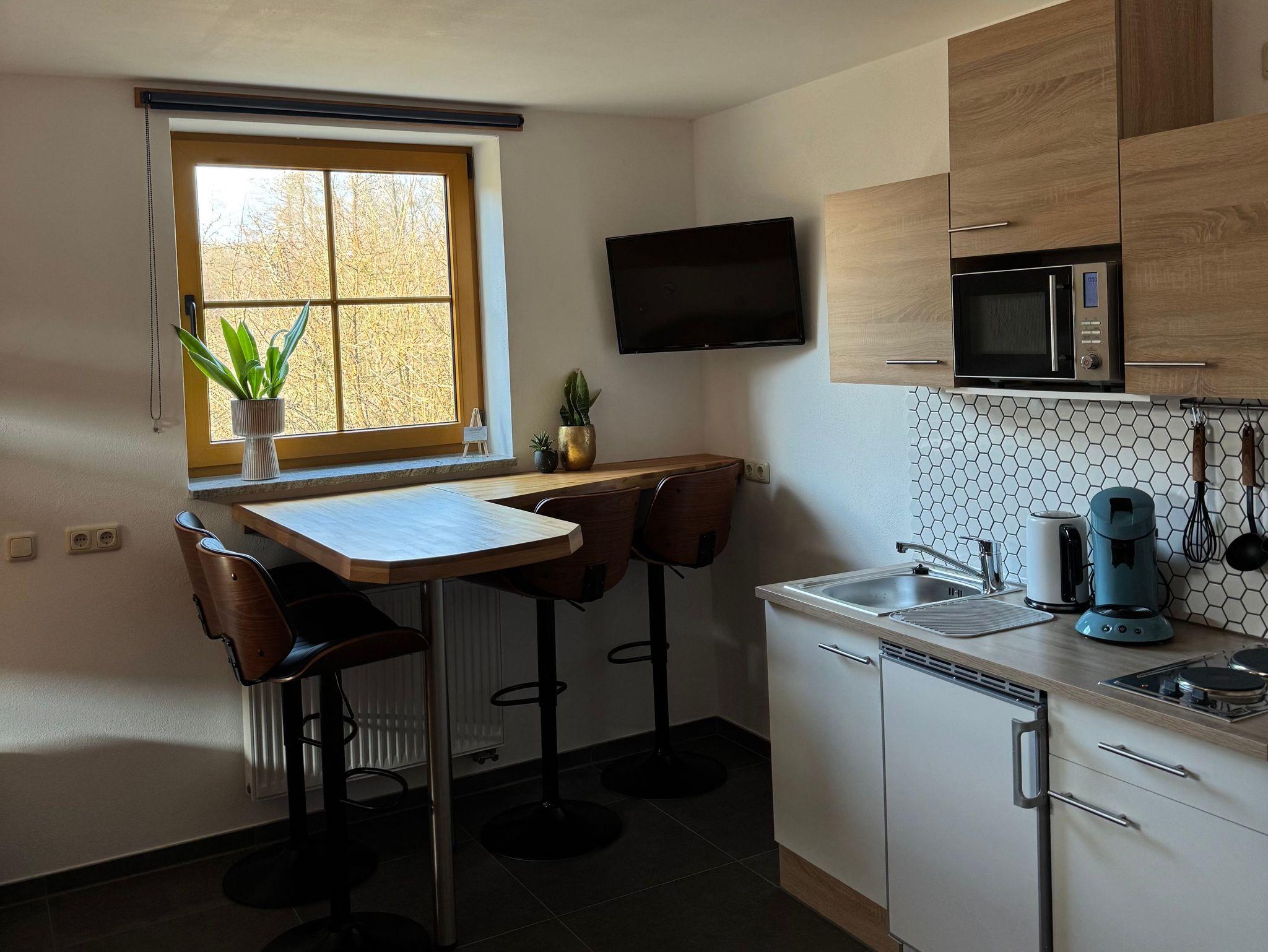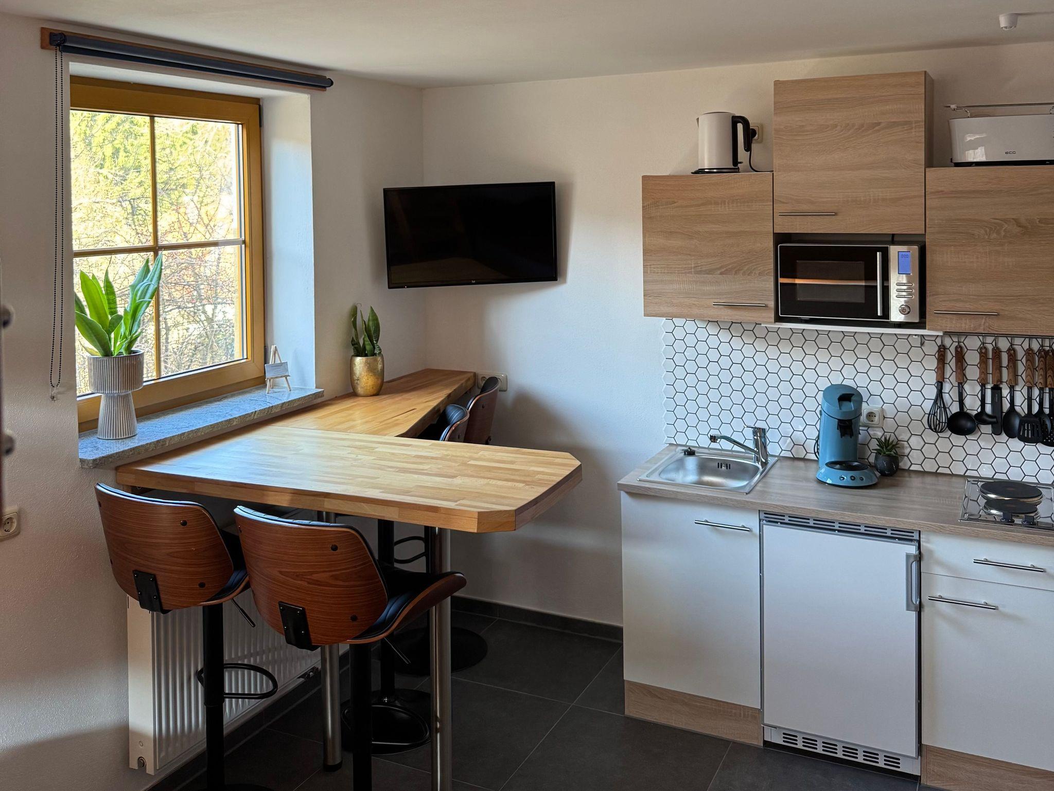 Die Küchenzeile ist mit einem Kochfeld, Wasserkocher, Kaffeemaschine und Toaster ausgestattet, ideal für selbsterstellte Mahlzeiten. Gemütliche Sitzgelegenheiten laden zum Verweilen ein.