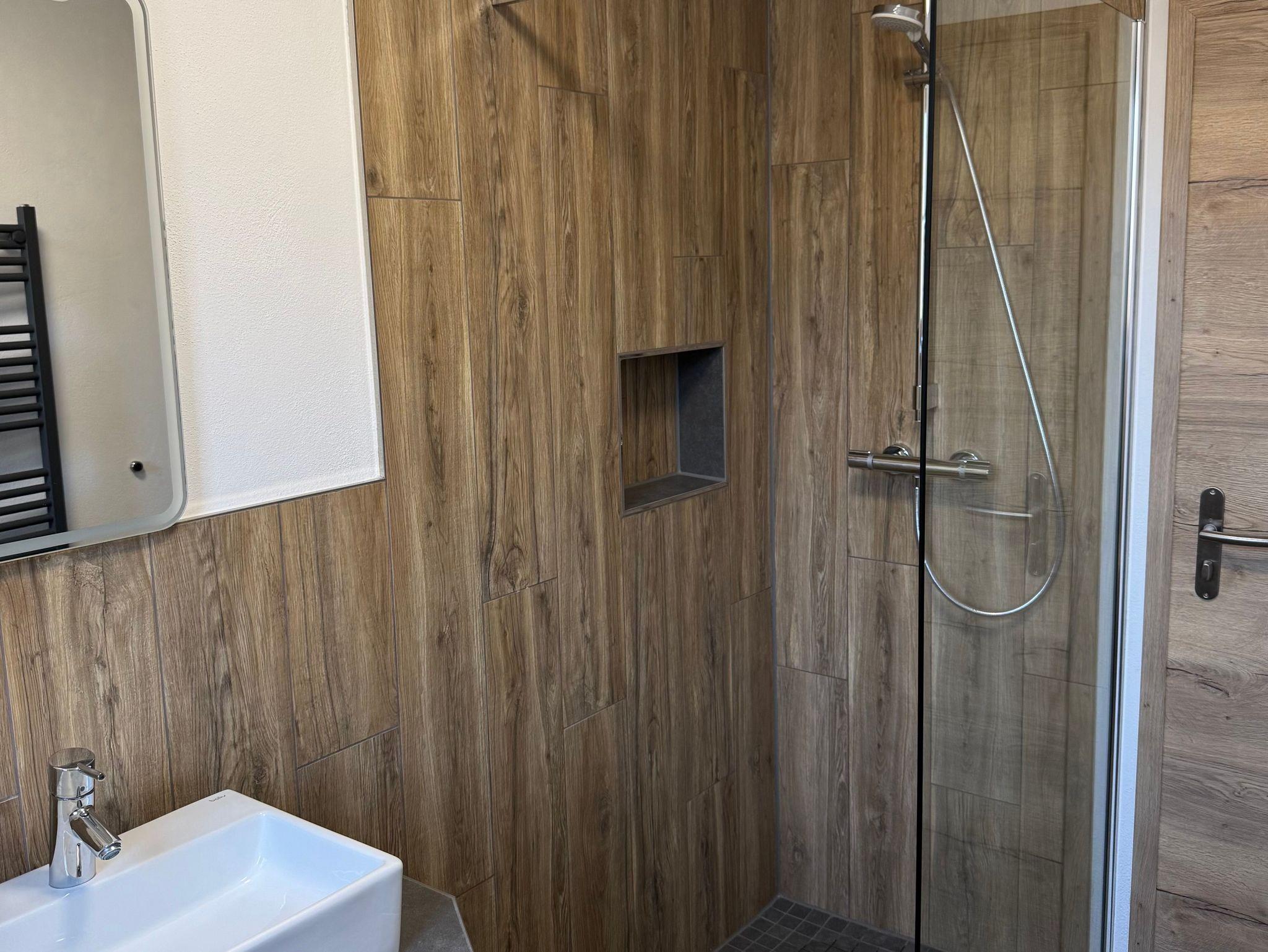 Das moderne Badezimmer verfügt über eine begehbare Dusche, WC, Fön und frische Handtücher. Mit einem separaten Eingang genießen Sie zusätzliche Privatsphäre.