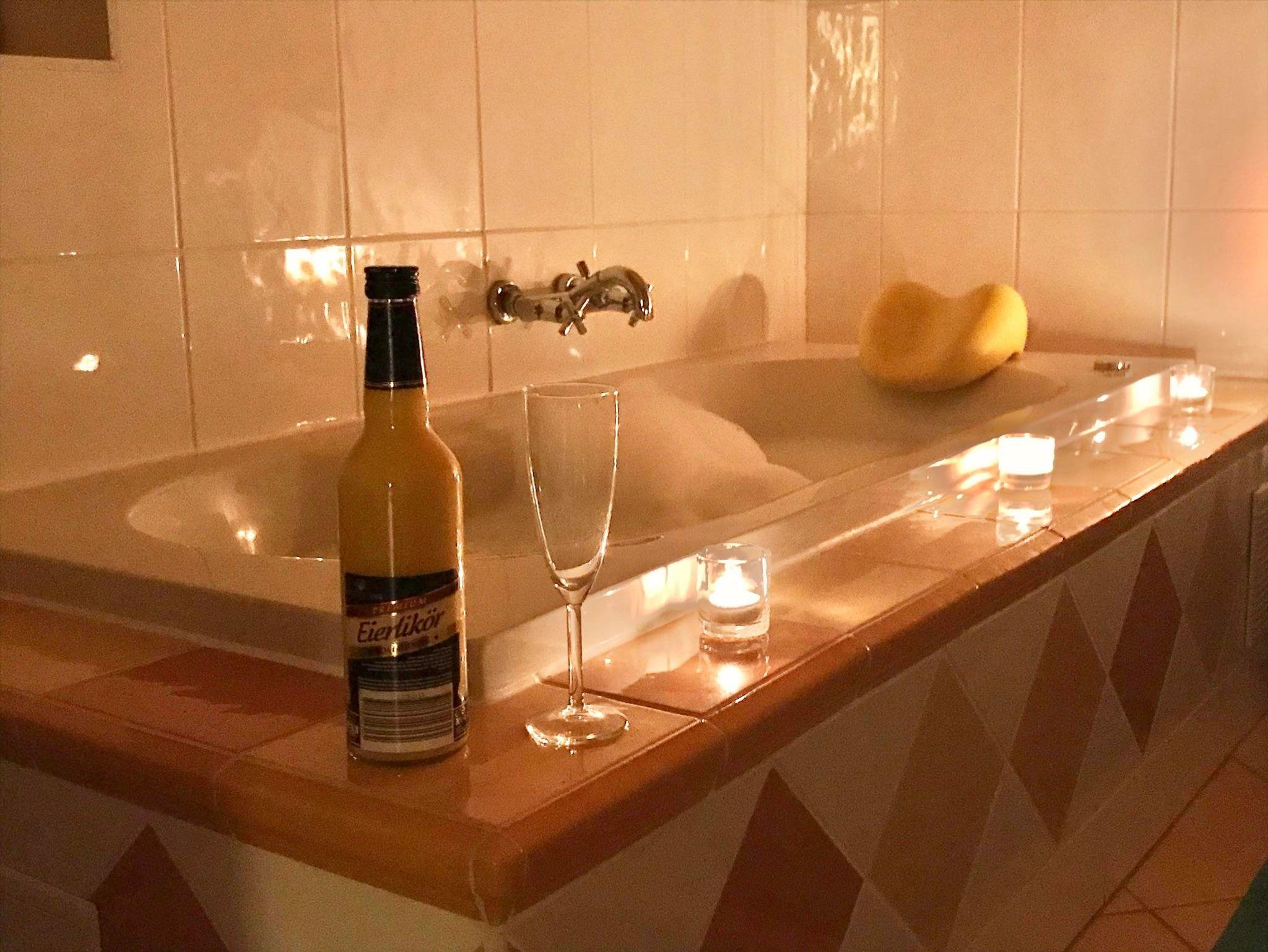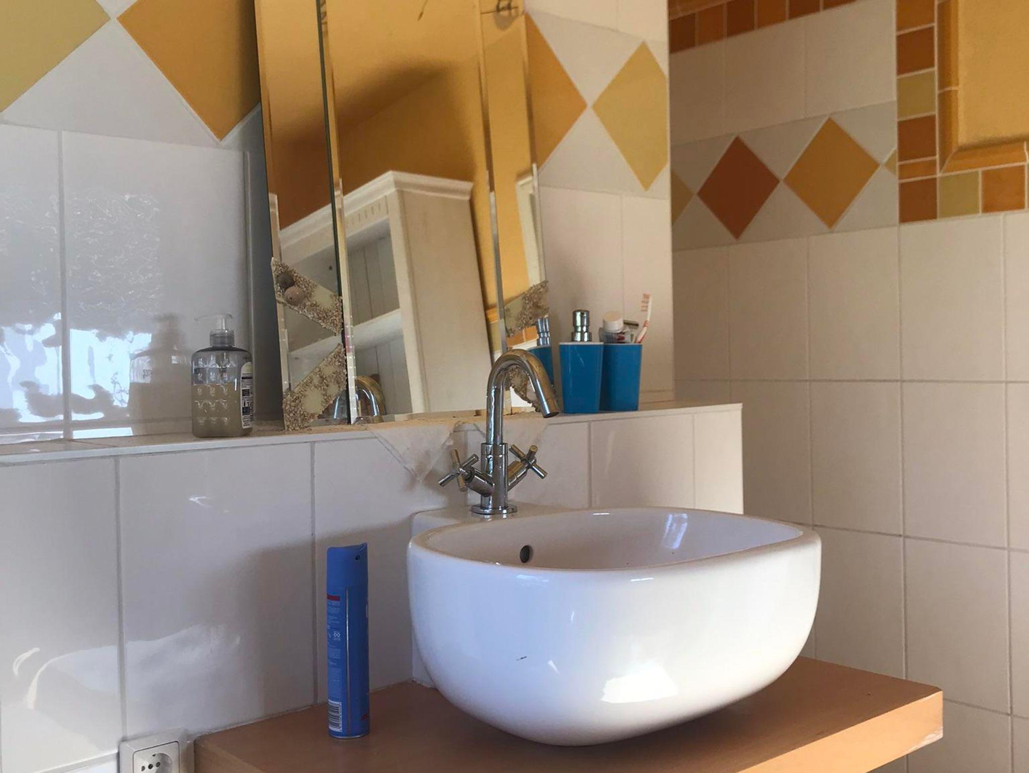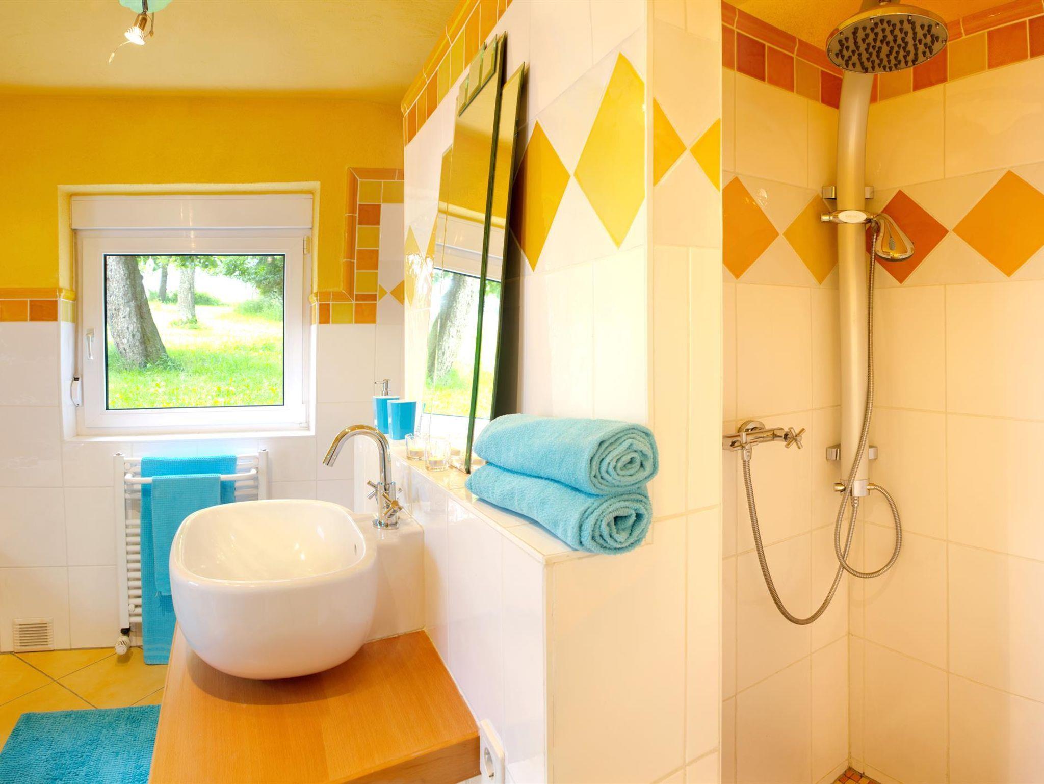 Das große und komfortabel ausgestattete Badezimmer wurde liebevoll im mediterranen Stil gestaltet. Zu seiner Ausstattung gehören eine Wirlpoolbadewanne, eine ebenerdige Regendusche, sowie ein abgeteilter WC-Bereich. Der Waschtisch greift die alte Bauerntradition auf. Eine Fussbodenheizung spendet wohlige Wärme.