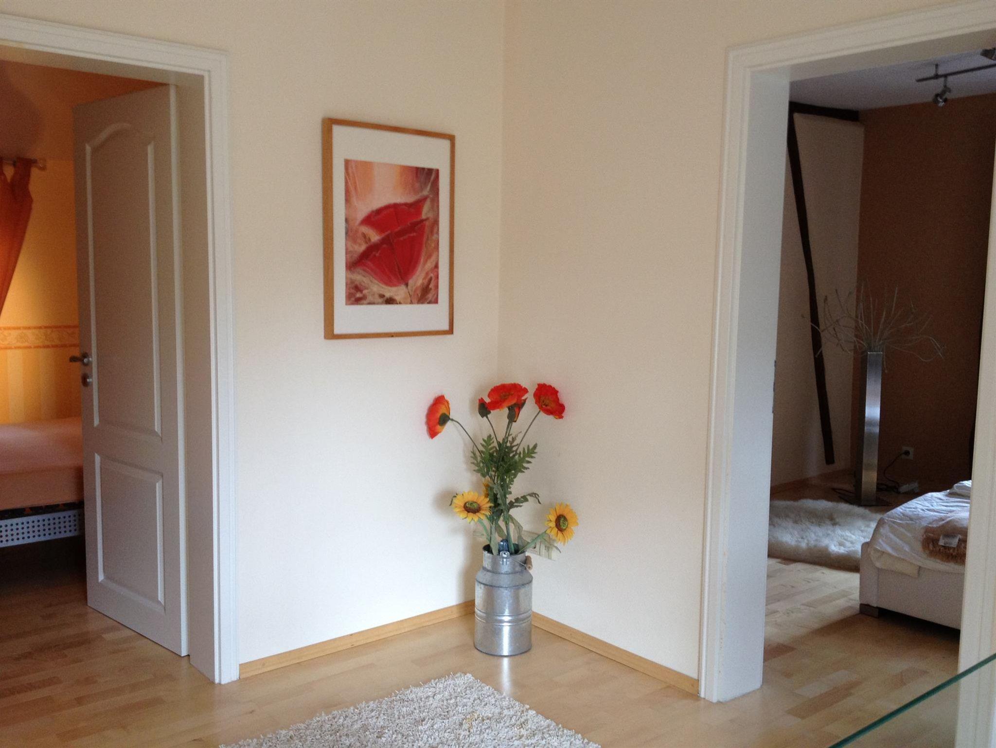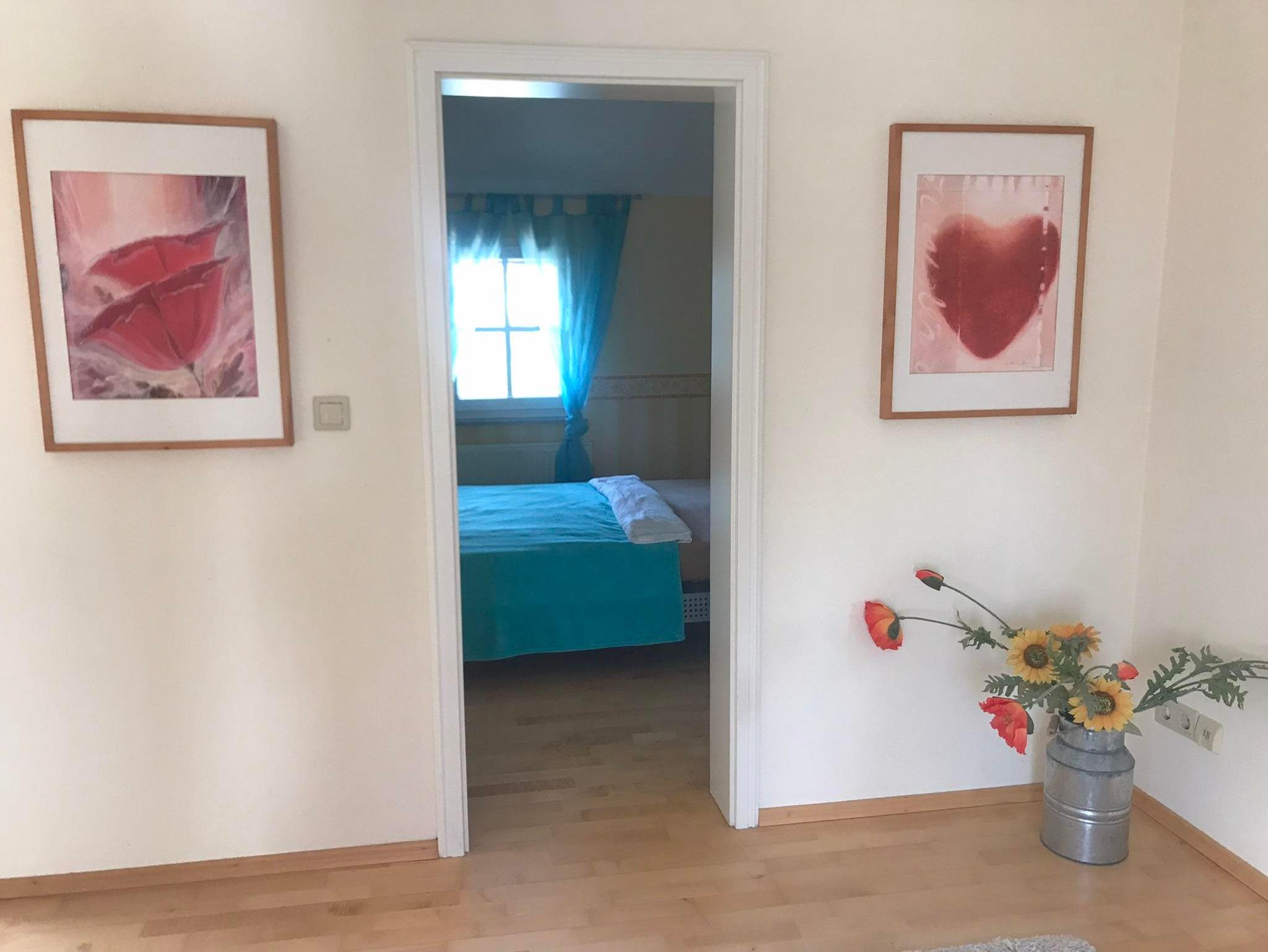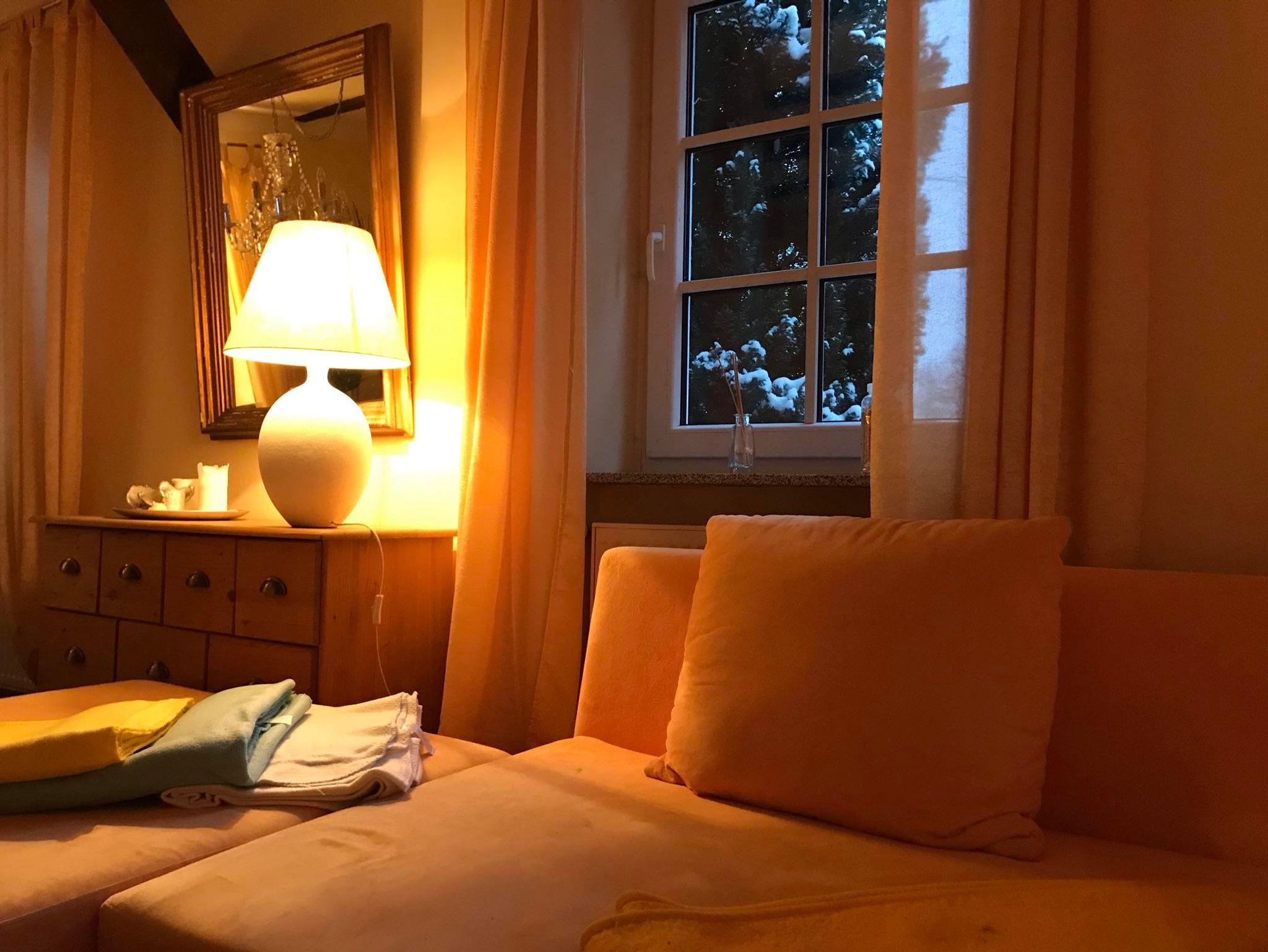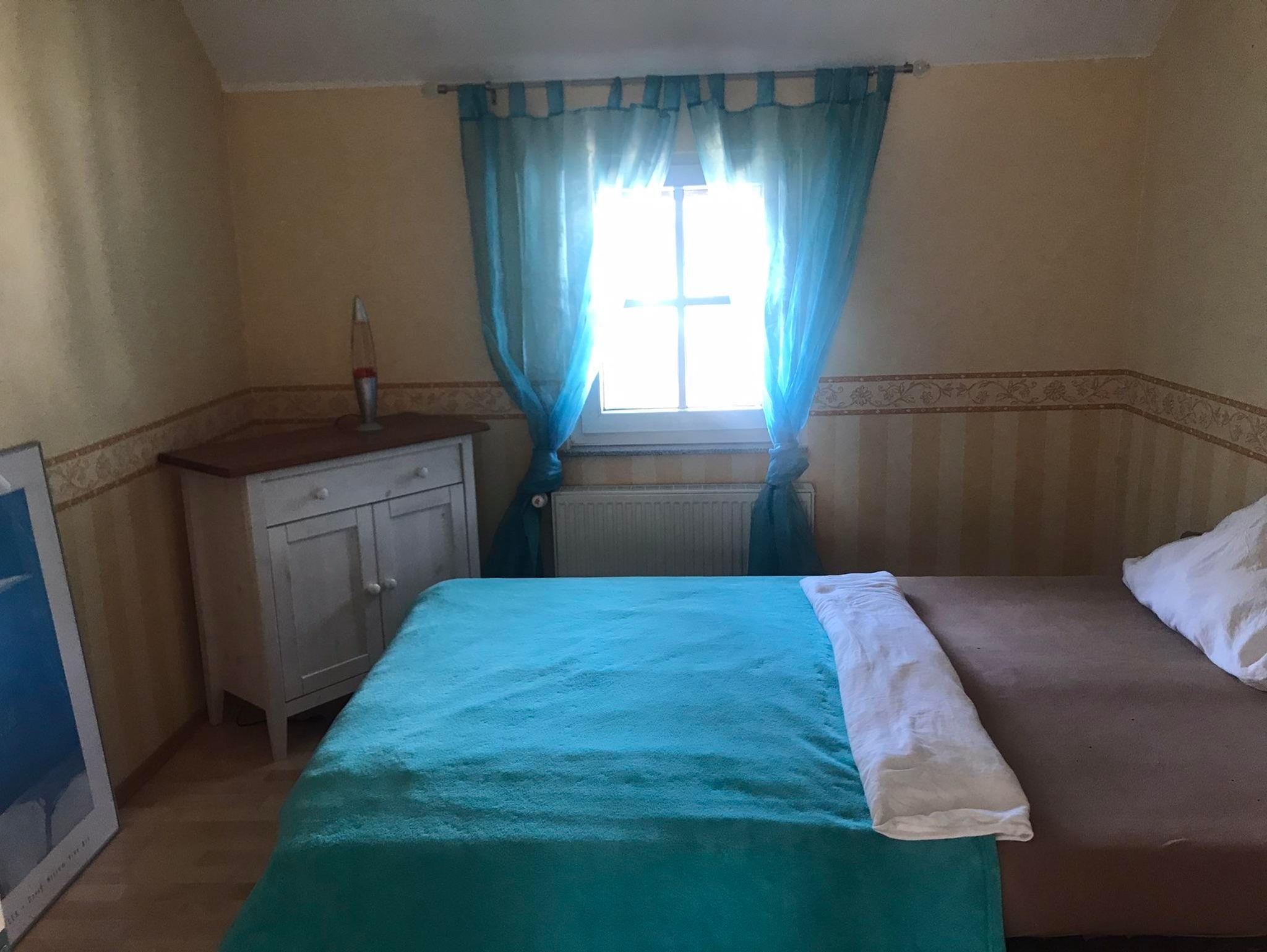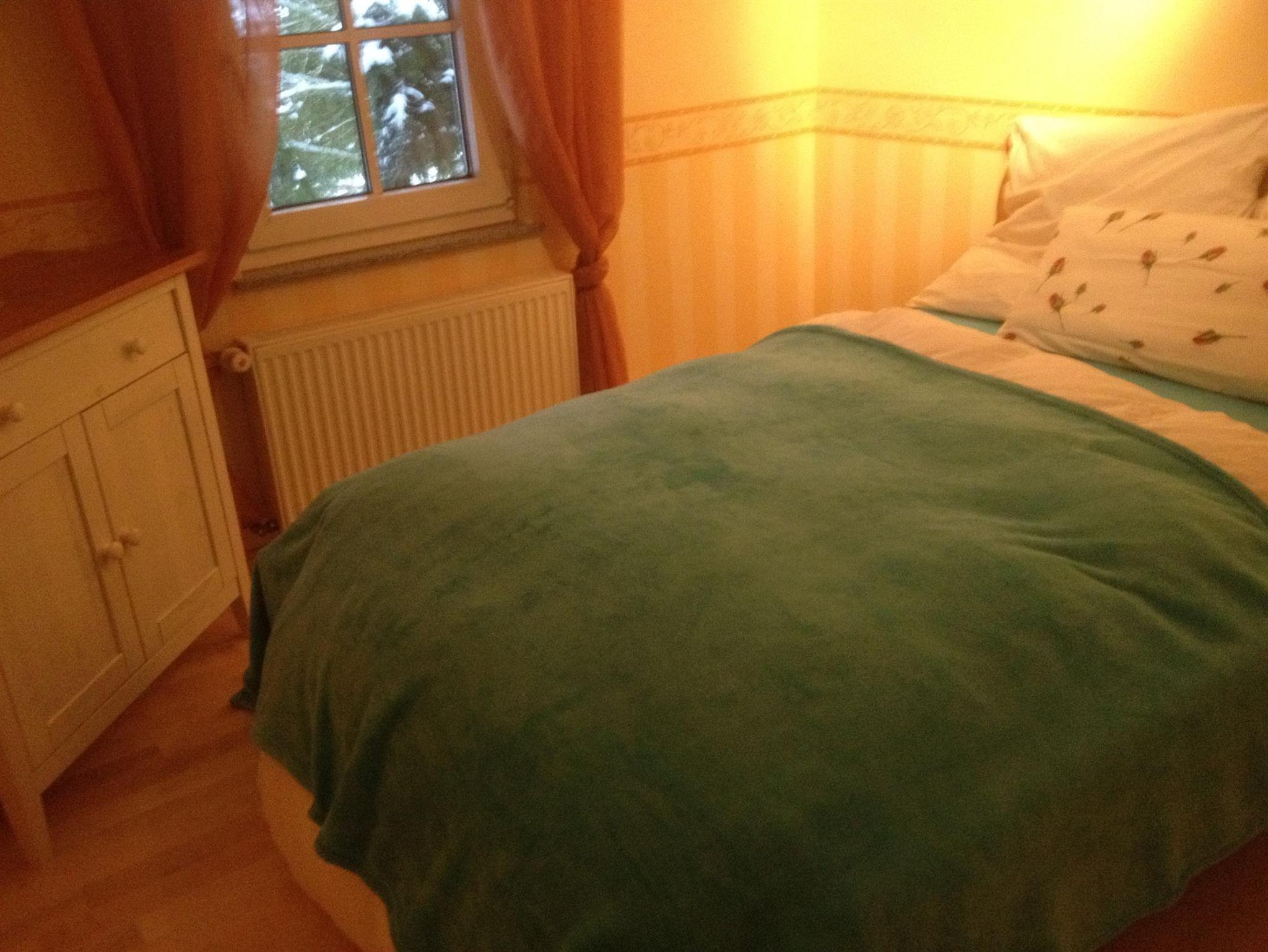 Ein weiteres Gästezimmer mit Doppelbett befindet sich ebenso im oberen Stockwerk. Bei Bedarf und auf Anfrage kann ein weiteres zusätzliches Gästezimmer ausgestattet mit einem gemütlichem schmiedeeisernem Bettsofa sowohl als zusätzliches Einzelschlafzimmer als auch als Ruhe- und Rückzugsraum genutzt werden.