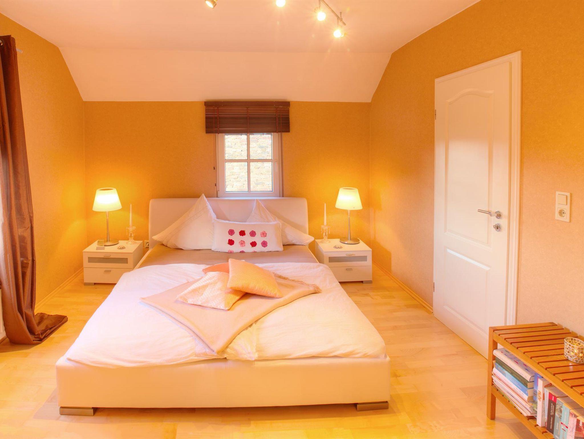 Das behagliche Schlafzimmer im oberen Geschoss ist mit einem großen Doppelbett ausgestattet, unmittelbar daran grenzt ein Ankleidezimmer, das sich auch sehr gut als eigenständiges Baby-/Kleinkindzimmer nutzen lässt.