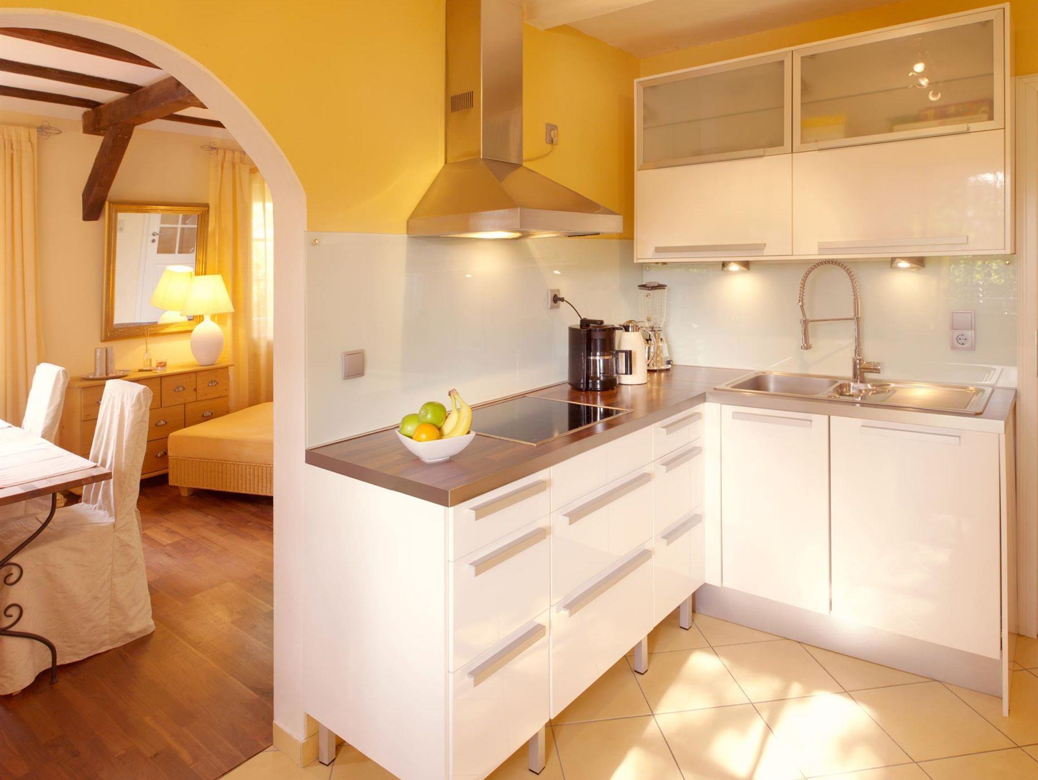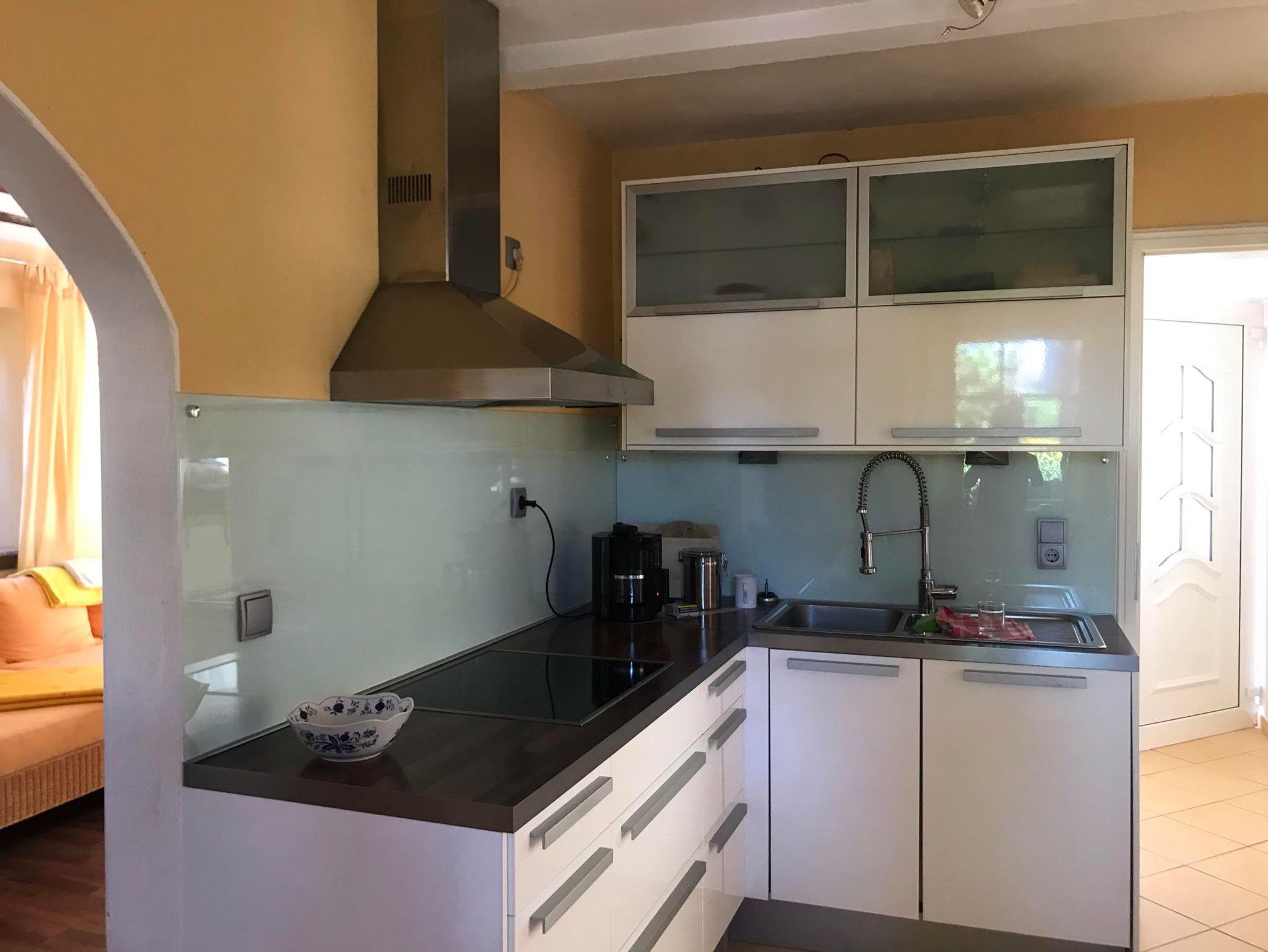 Die moderne und funktionale Kücheneinheit fügt sich harmonisch in die alte Architektur des Bauernhauses ein.