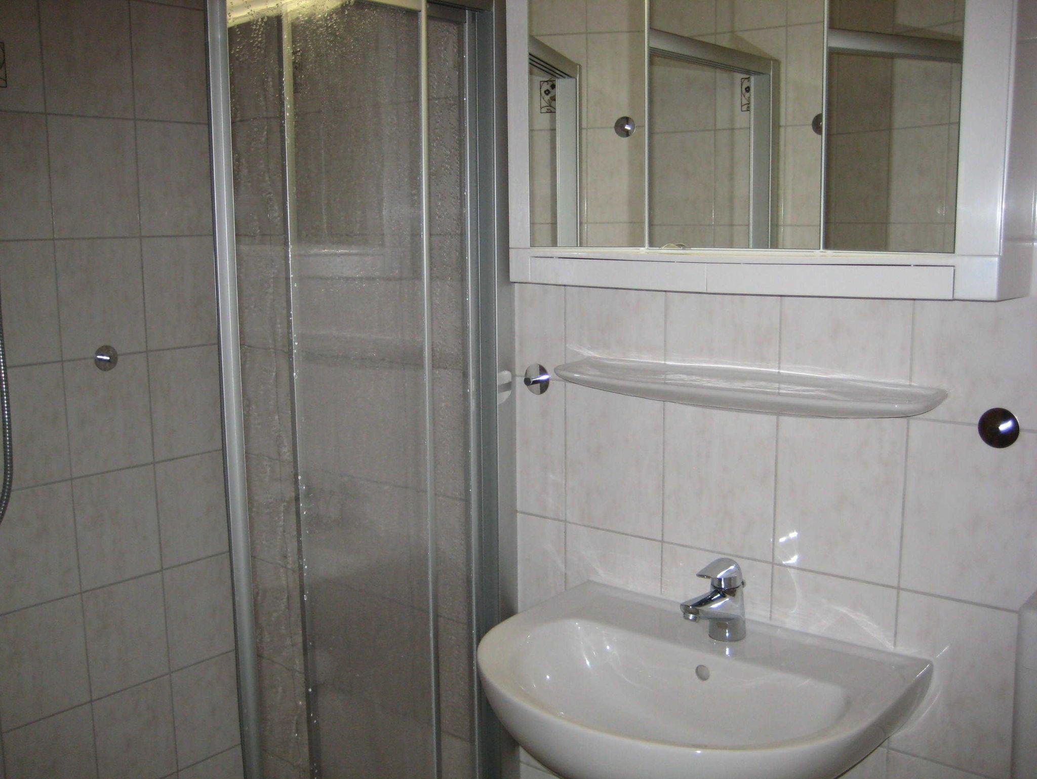 • Duschbad/WC ohne Stolperkanten durchgefliest. Nur wegen der Schiebetüren gibt es eine niedrige Schiene davor. Keine zusätzlichen Haltegriffe, normale Toilettenhöhe.