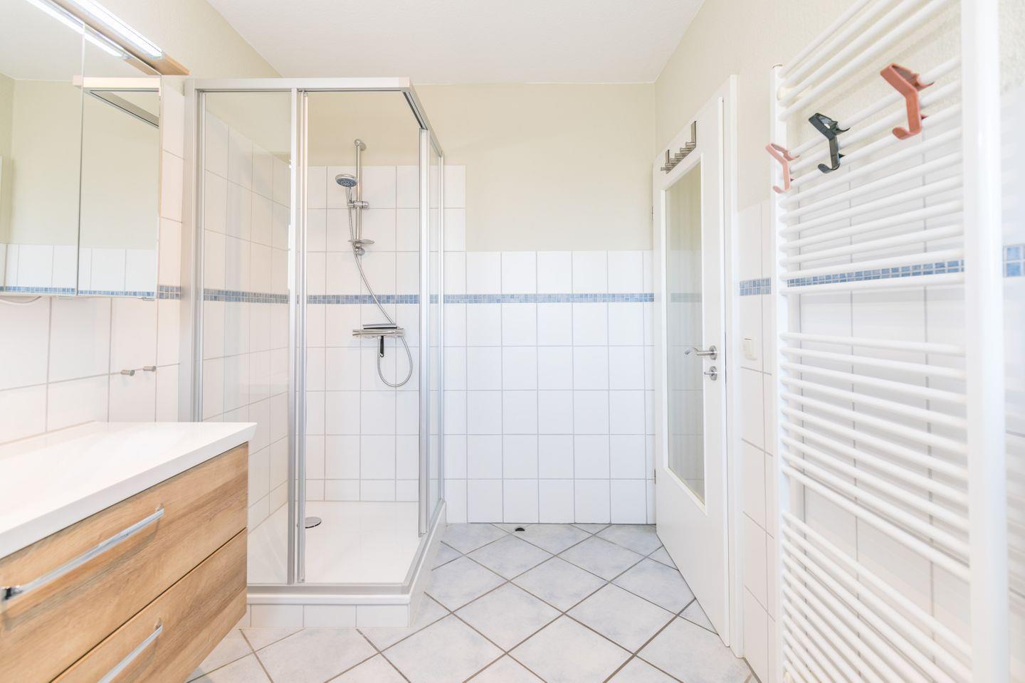 Dusche, WC, Waschbecken mit Unterschrank, Handtuchheizung, Fenster mit Plissee, Haartrockner, Spiegel