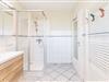 Dusche, Waschbecken und WC, Fenster mit Plissee
