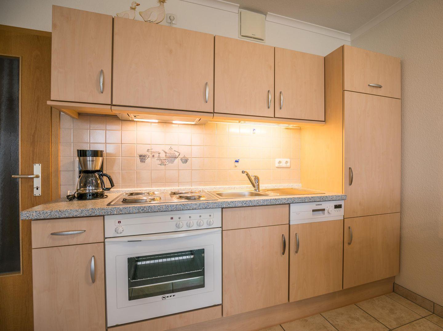 Herd mit 4 Kochplatten und Backofen, Geschirrspüler, Dunstabzugshaube, Kühlschrank mit Gefrierfach, Kaffeemaschine, Flötenkessel, Eierkocher, Toaster