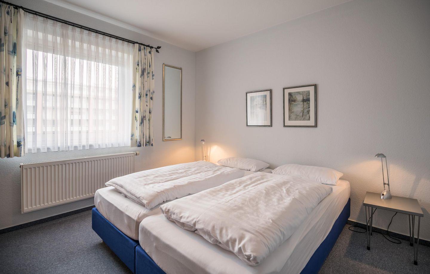 Zwei Hotelbetten ( je 200cm x 90cm x 50cm), großer Kleiderschrank mit Spiegel, 2. separater Spiegel, Verdunkelungsjalousie und Vorhang