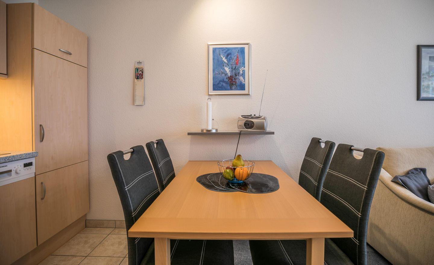 Sofa mit Schlaffunktion (Liegefläche 200cm x 140cm x 43cm), 2 Sessel, Couchtisch, Kofferbock mit Garderobe und Spiegel, Kabel-TV, Radio, Esstisch mit 4 Stühlen, möblierter Südbalkon, Doppelgardinen, Teppichboden