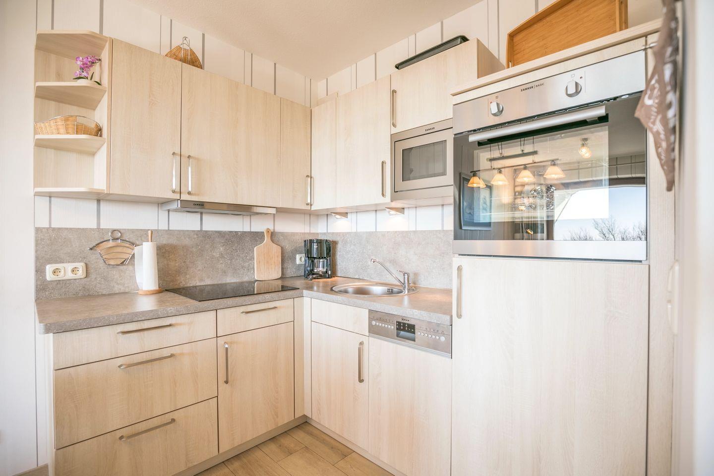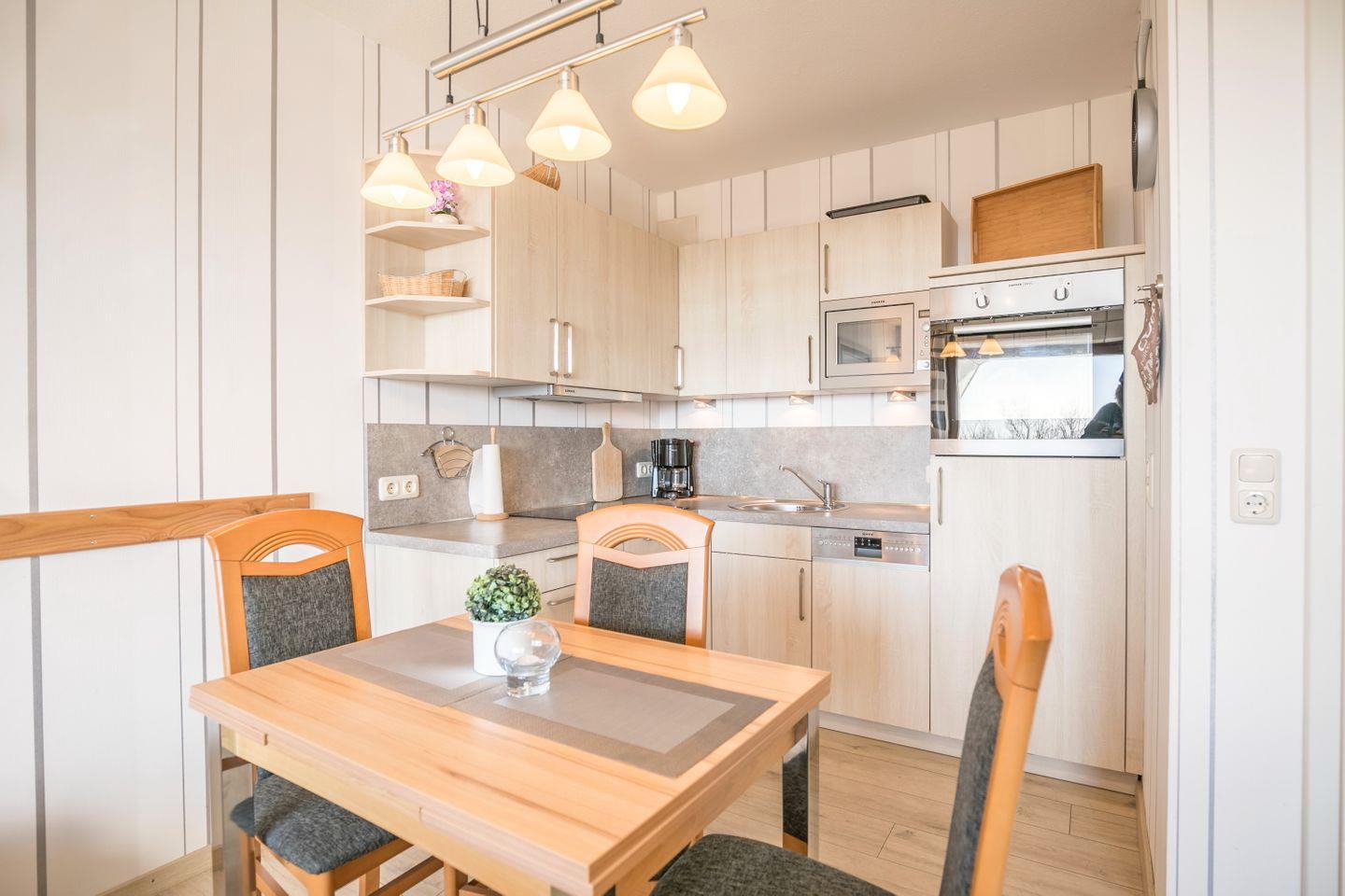 Herd mit Ceranfeld, Backofen, Kühlschrank mit Gefrierfach, Geschirrspüler, Mikrowelle, Wasserkocher, Toaster, Kaffeemaschine, Tisch mit 4 Stühlen