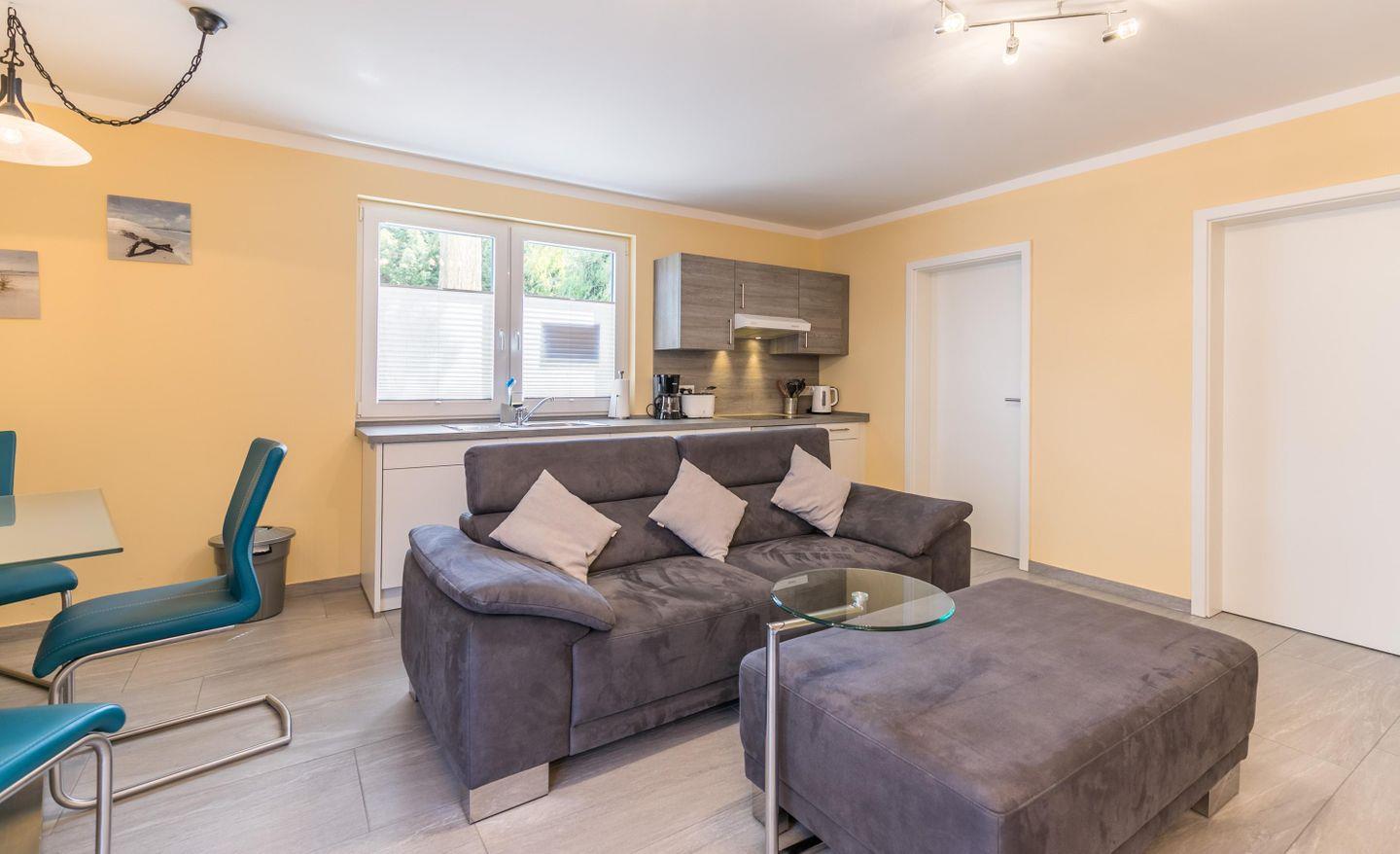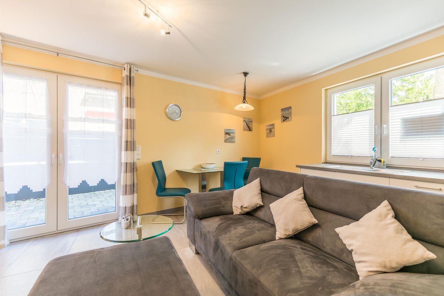 In der charmanten kleinen Unterkunft ist das Herzstück der Wohnraum mit dem lauschigen großen Sofa und der Fernsehecke. Eine moderne Küchenzeile befindet sich ebenfalls in dem kombinierten Wohn-Küchen - und Essbereich. Von hier aus haben Sie Zugang zur kleinen Terrasse.