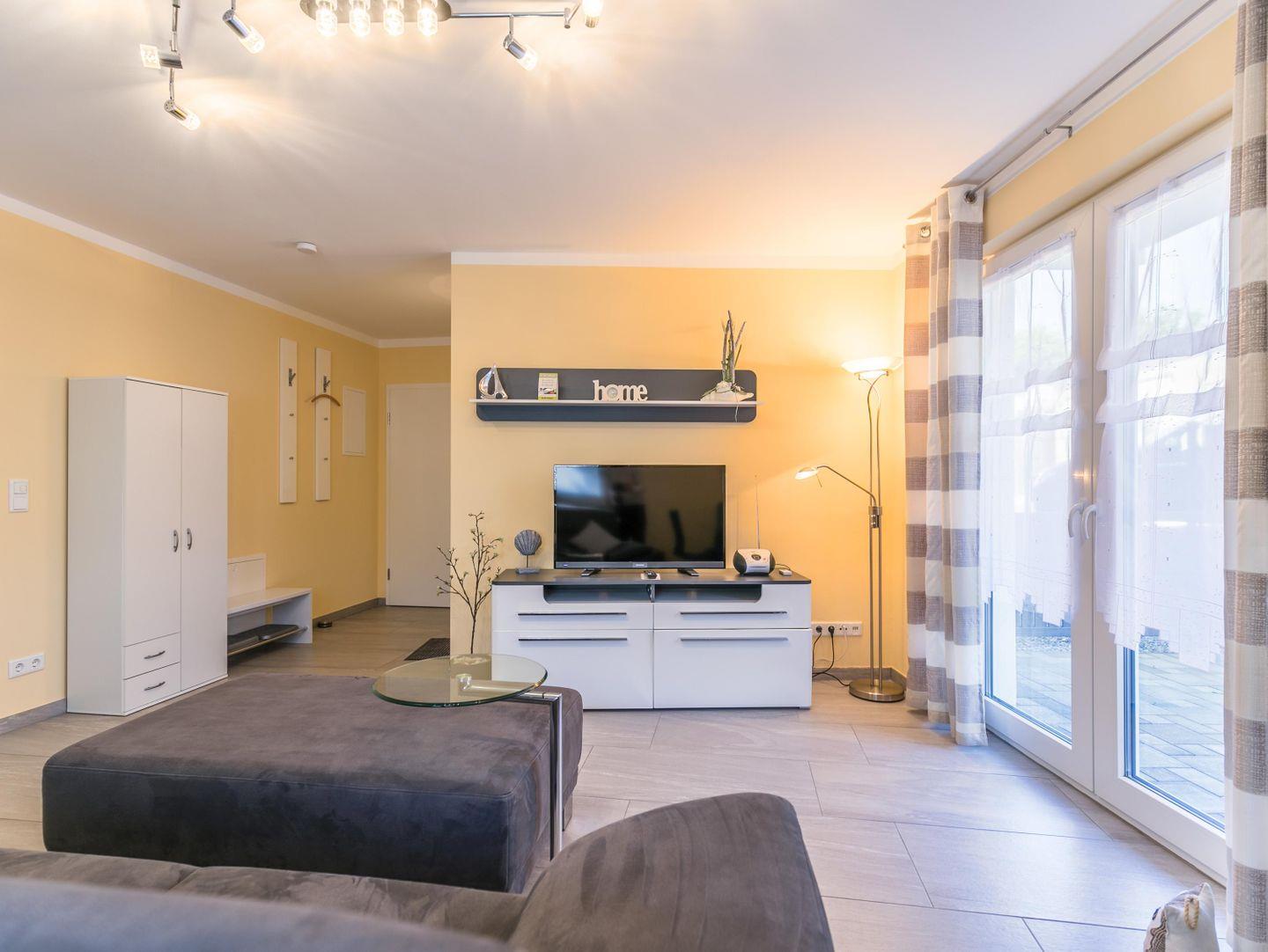 Sofa, großer Hocker, Fernsehwand, Flachbild-TV, Deckenfluter, Kühlschrank mit Gefrierfach, Backofen, Geschirrspüler, Ceranfeld, Wasserkocher, Toaster, Kaffeemaschine, Dunstabzug, Tisch+ Stühle, Zugang zur Terrasse