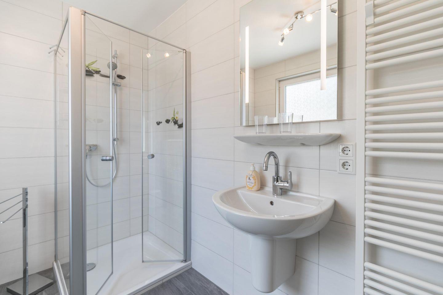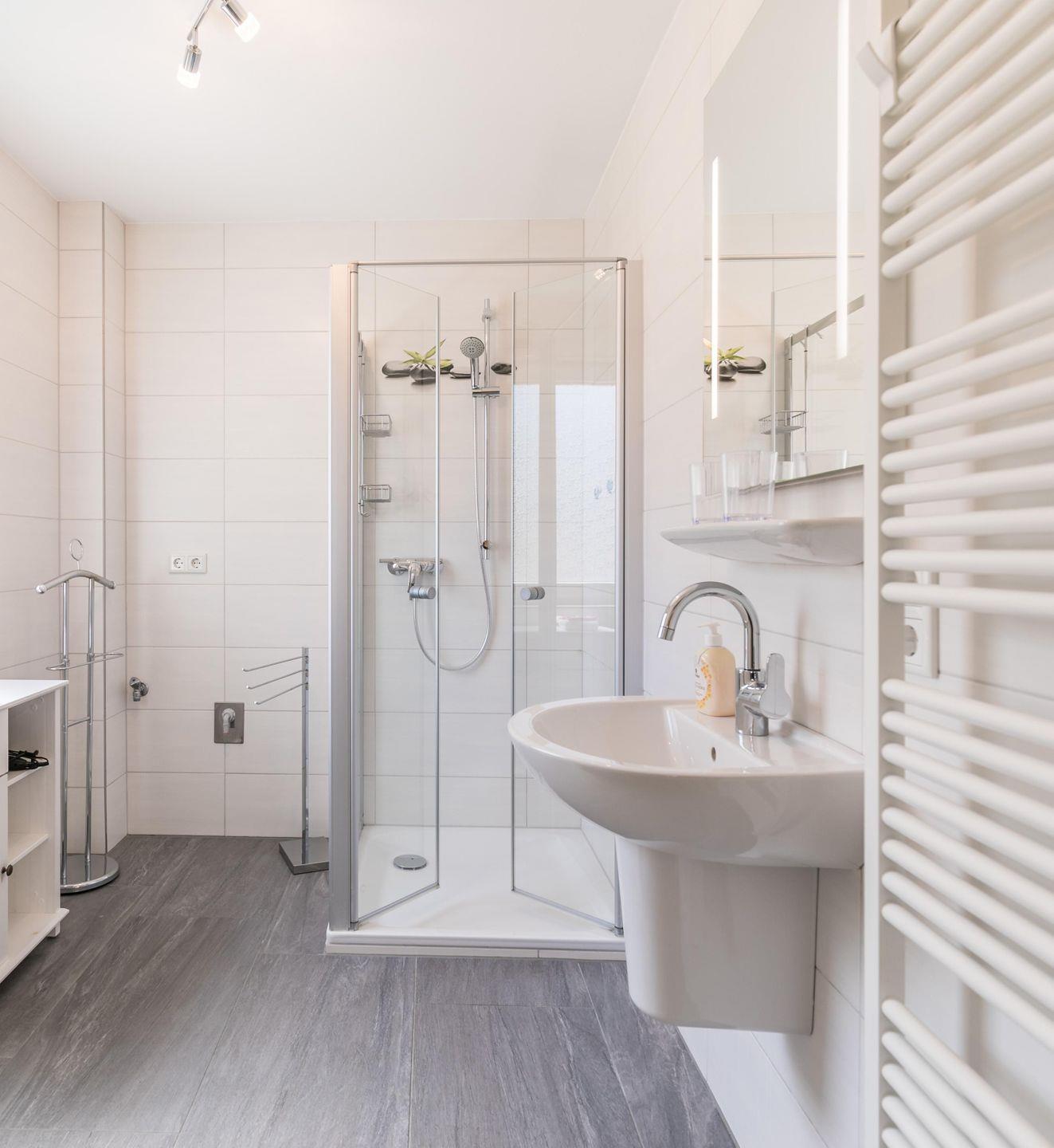 Dusche, WC, Spiegel, Waschbecken, Fenster, Handtuchwärmer, Herrendiener