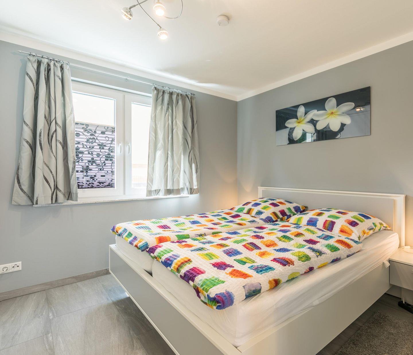 Das Schlafzimmer ist behaglich eingerichtet, das Doppelbett mit Komforthöhe und ein Flachbild-TV in der großen Schrankwand tragen zur Gemütlichkeit bei.