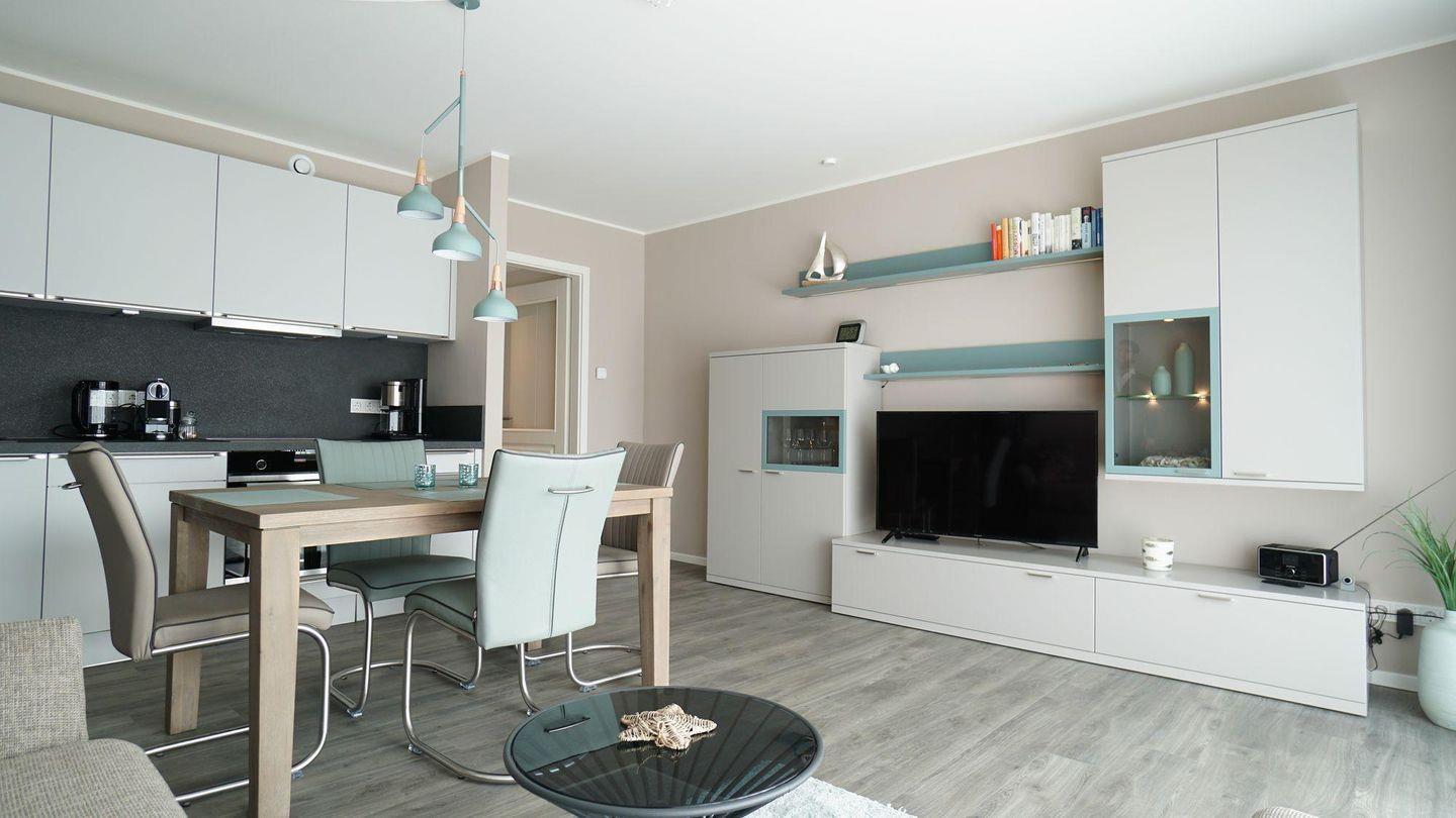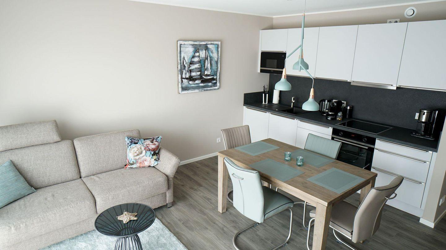 In den Wohnbereich integriert sind eine modern und hochwertig ausgestattete Küchenzeile sowie ein gemütlicher Essbereich zum bequemen Sitzen.