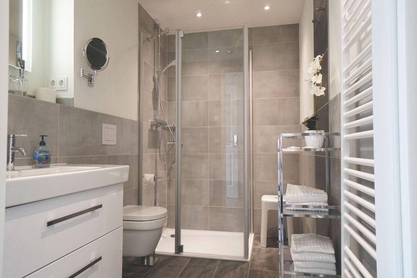 Das geflieste Bad verfügt über eine großzügige bodengleiche verglaste Dusche, eine Handtuchheizung, ein WC, ein Waschbecken mit Unterschrank, einen beleuchteten Wandspiegel und zusätzlich einen ausziehbarer Kosmetikspiegel sowie über einen Fön und einen Sitzhocker.