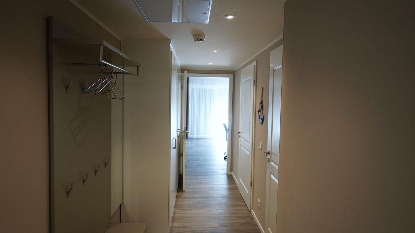 Im Flur befinden sich eine Flurgarderobe mit einer kleinen Sitzbank und einem Spiegel, ein Schrank mit Safe, Staubsauger, Bügelbrett, Bügeleisen und Besen.