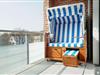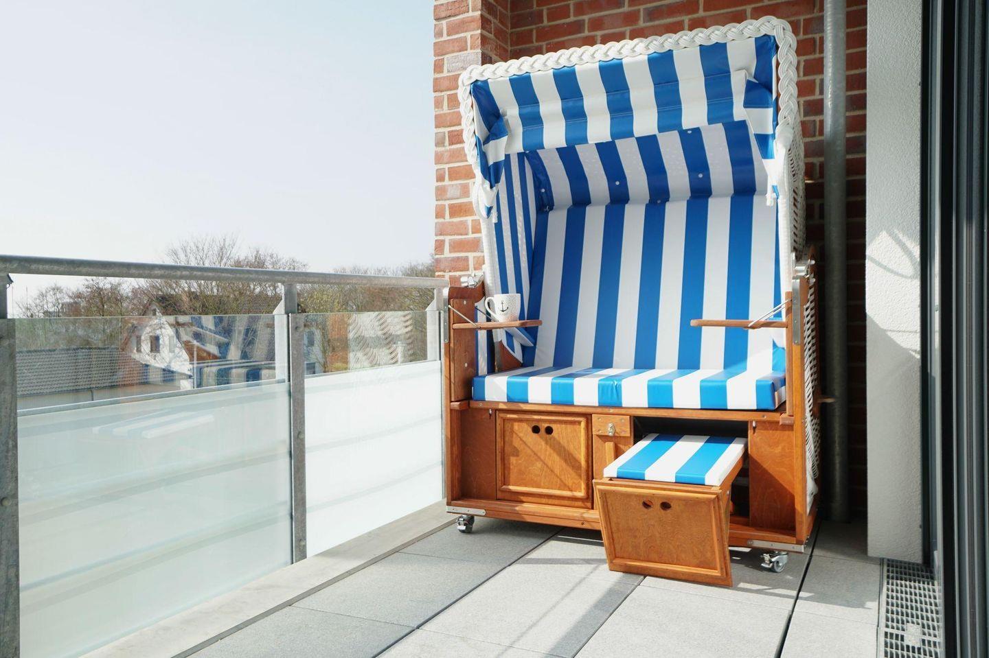 Der Balkon ist seewärts nach Süden gelegen und lädt zum Aufenthalt an der frischen Nordseeluft und zum Sonnenbad ein. Er ist ausgerüstet mit bequemen Balkonmöbeln und Strandkorb sowie zusätzlich mit einem Handwäschetrockner mit Wandhalter.