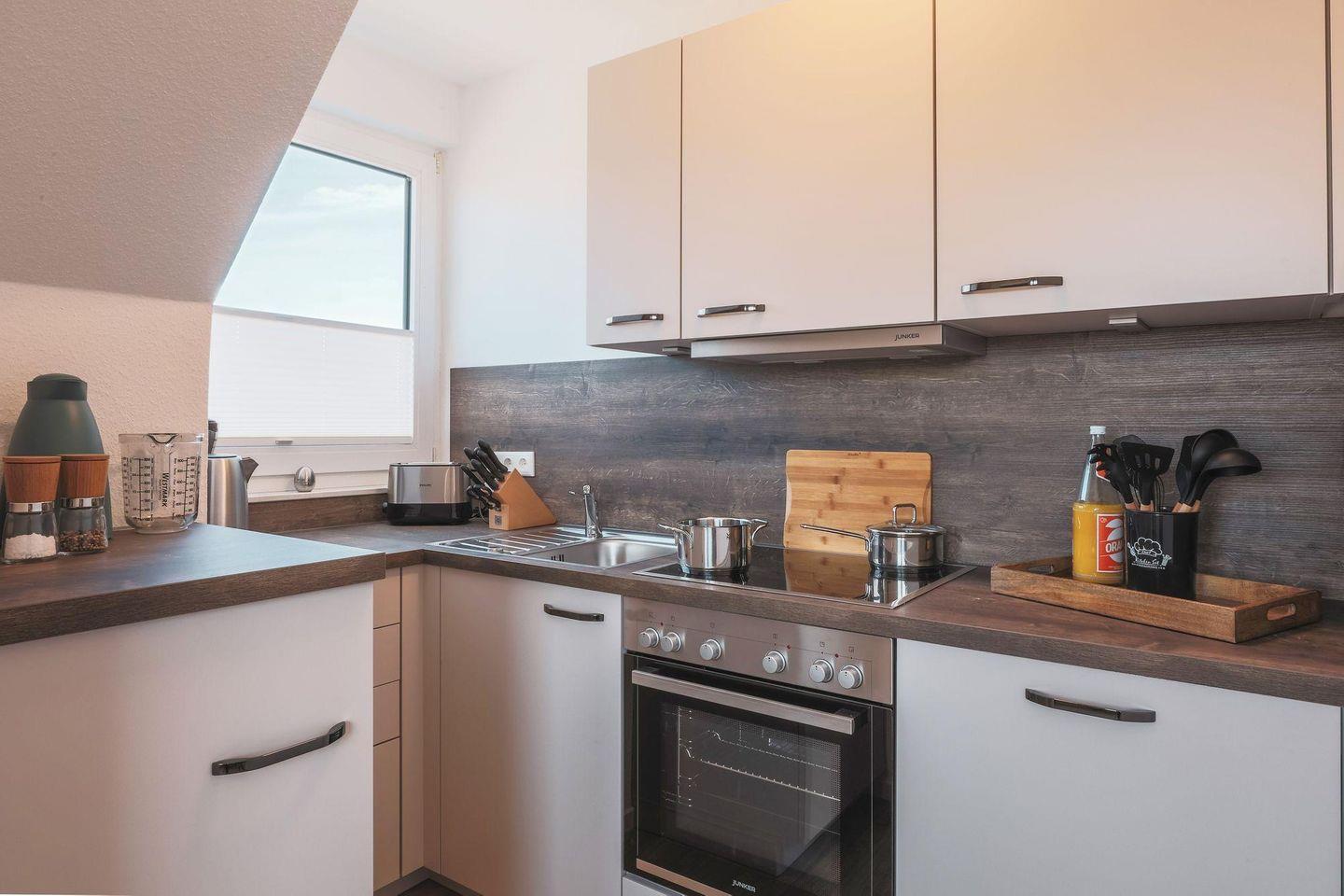 Ein modernes Tageslichtbad bietet eine komfortable Dusche mit niedrigem Einstieg. Das Herzstück der Wohnung ist das gemütliche Wohnzimmer mit einer angrenzenden, separaten Küche. Hier finden Sie eine Spülmaschine, ein Cerankochfeld, eine Filterkaffeemaschine und einen Kühlschrank, der mit einem Gefrierfach ausgestattet ist. Ein schöner Essbereich, eine kuschelige Couchgarnitur und ein großer TV-Flatscreen vervollständigen den Wohnbereich. Von hier gelangen Sie auf einen Südbalkon mit Ausblick über die Dächer von Büsum und mit hochwertigen Balkonmöbeln ausgestattet. Hier können Sie bei einem Glas Wein entspannte Abende mit Ihren Liebsten genießen.