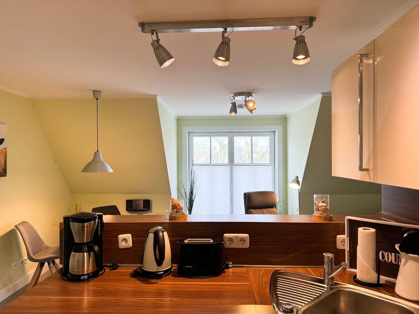 Küche: Backofen, Induktionsherd mit Cerankochfeld, Mikrowelle, Geschirrspüler, Kühlschrank mit Gefrierfach, Kaffeemaschine, Wasserkocher, Toaster