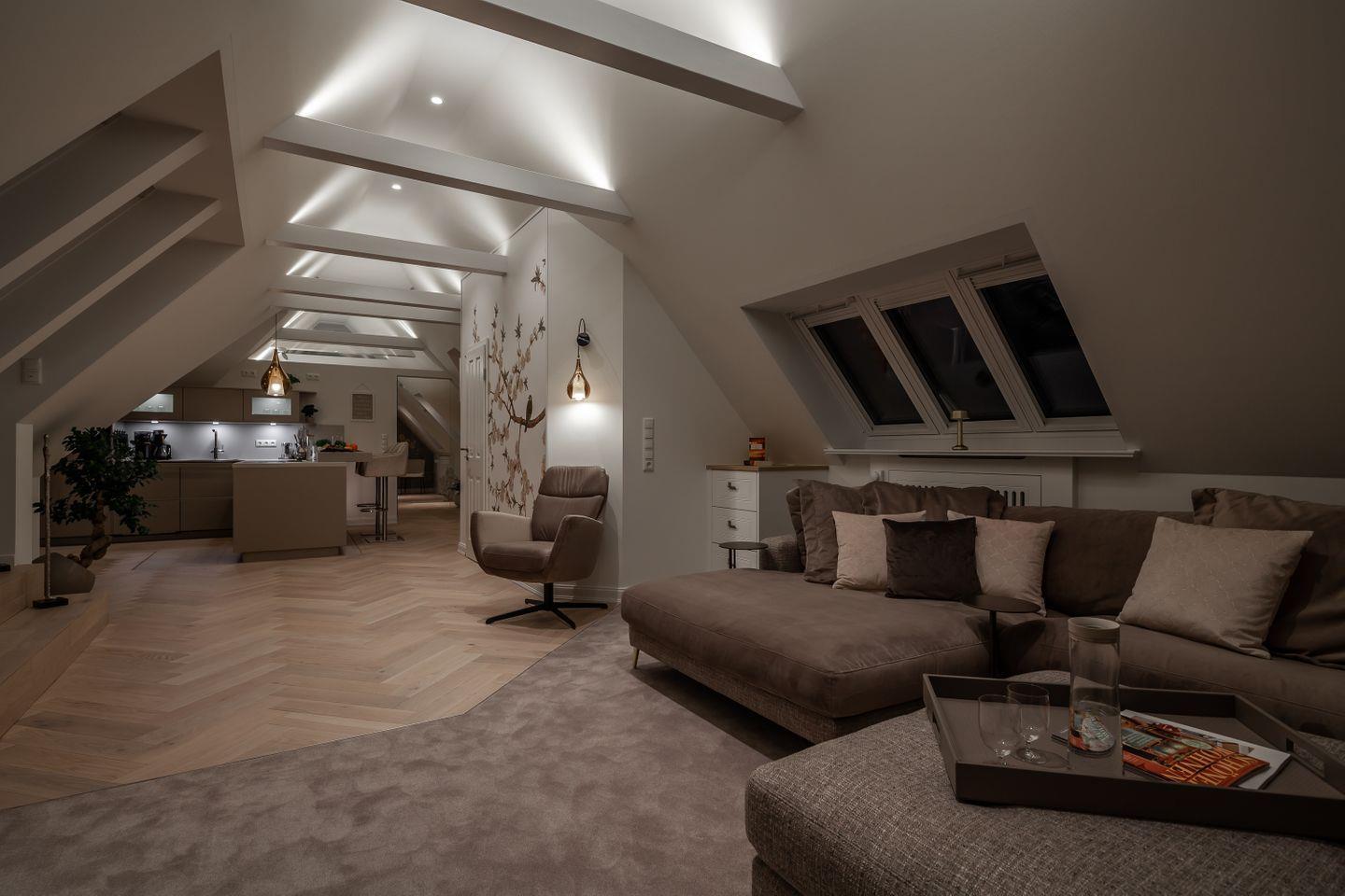 Zwei behagliche Schlafzimmer mit Boxspringbetten sind als echte Rückzugsorte gedacht; das Master verfügt über Ankleidezimmer und Bad en suite. Im Wohnbereich lädt das großzügige Sofa von Walter Knoll zu langen Gesprächen und leiser Musik ein, getragen von einem stimmungsvollen Lichtkonzept. Die Designbäder setzen mit bodengleichen Duschen, großformatigen Spiegeln mit integrierten TVs und Pflegeprodukten von Thalgo die luxuriöse Linie fort.