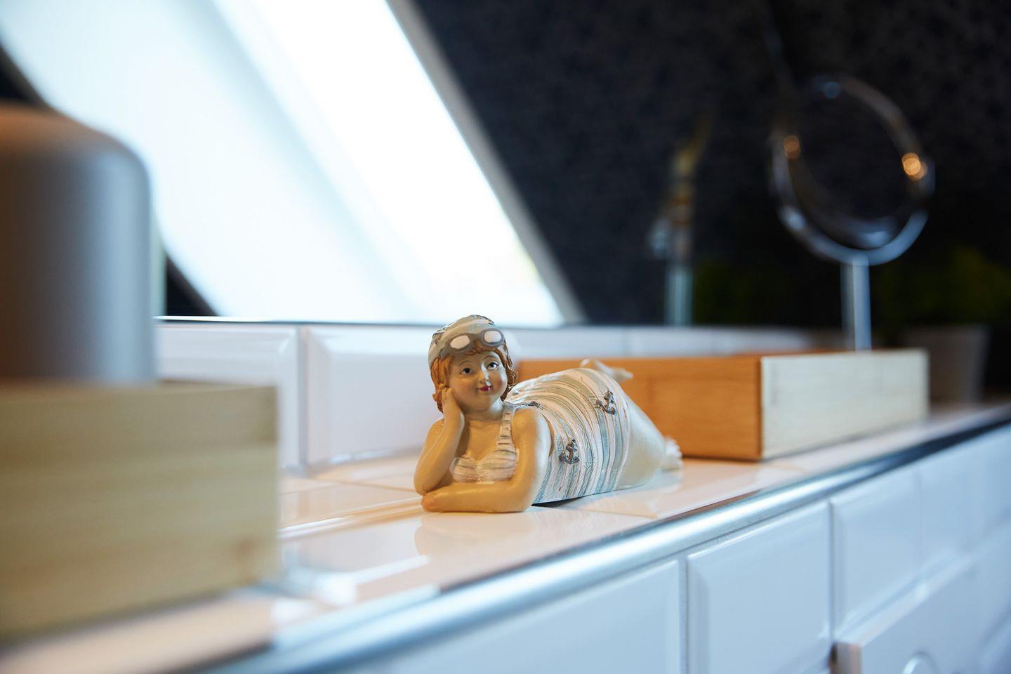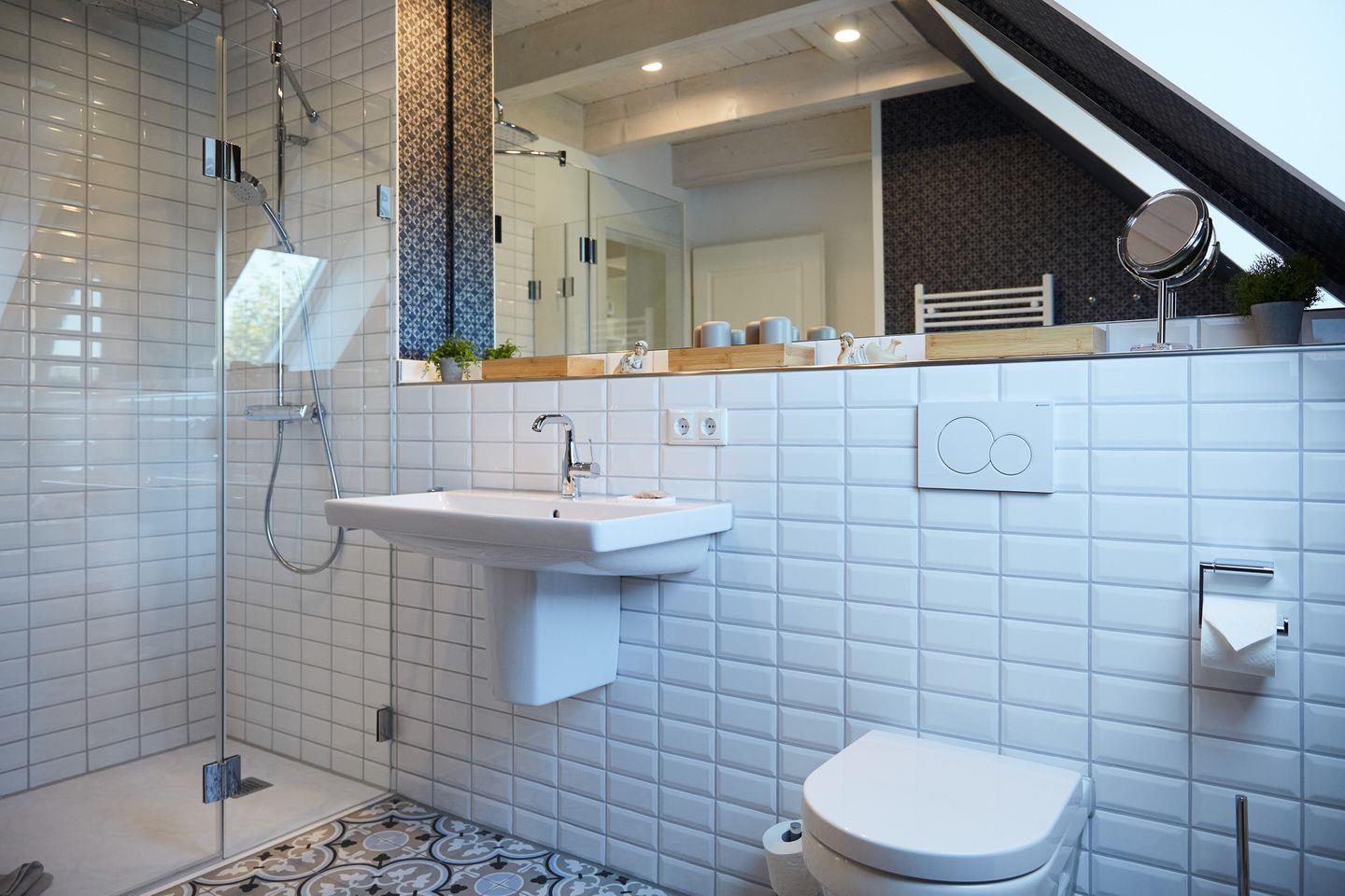Das luxuriöse Badezimmer verfügt über eine große ebenerdige Dusche, einen Handtuchheizkörper sowie einen Föhn. Wie in der gesamten Wohnung, fällt auch hier die liebevolle Dekoration auf.