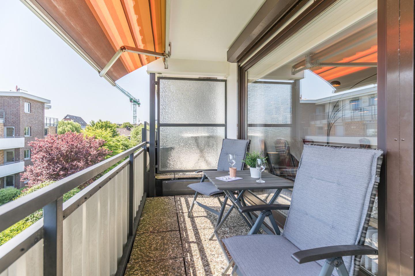 überdachter Balkon (Loggia) mit Balkonmöbel und mechanischer Markise, Garderobe, Fahrradständer (ohne Dach, nicht abschließbar),