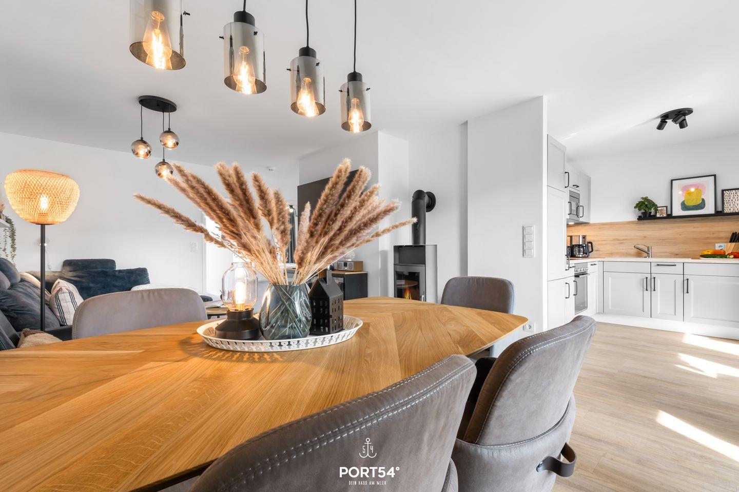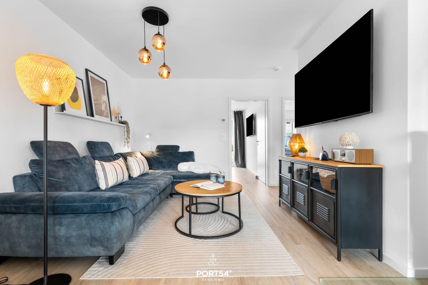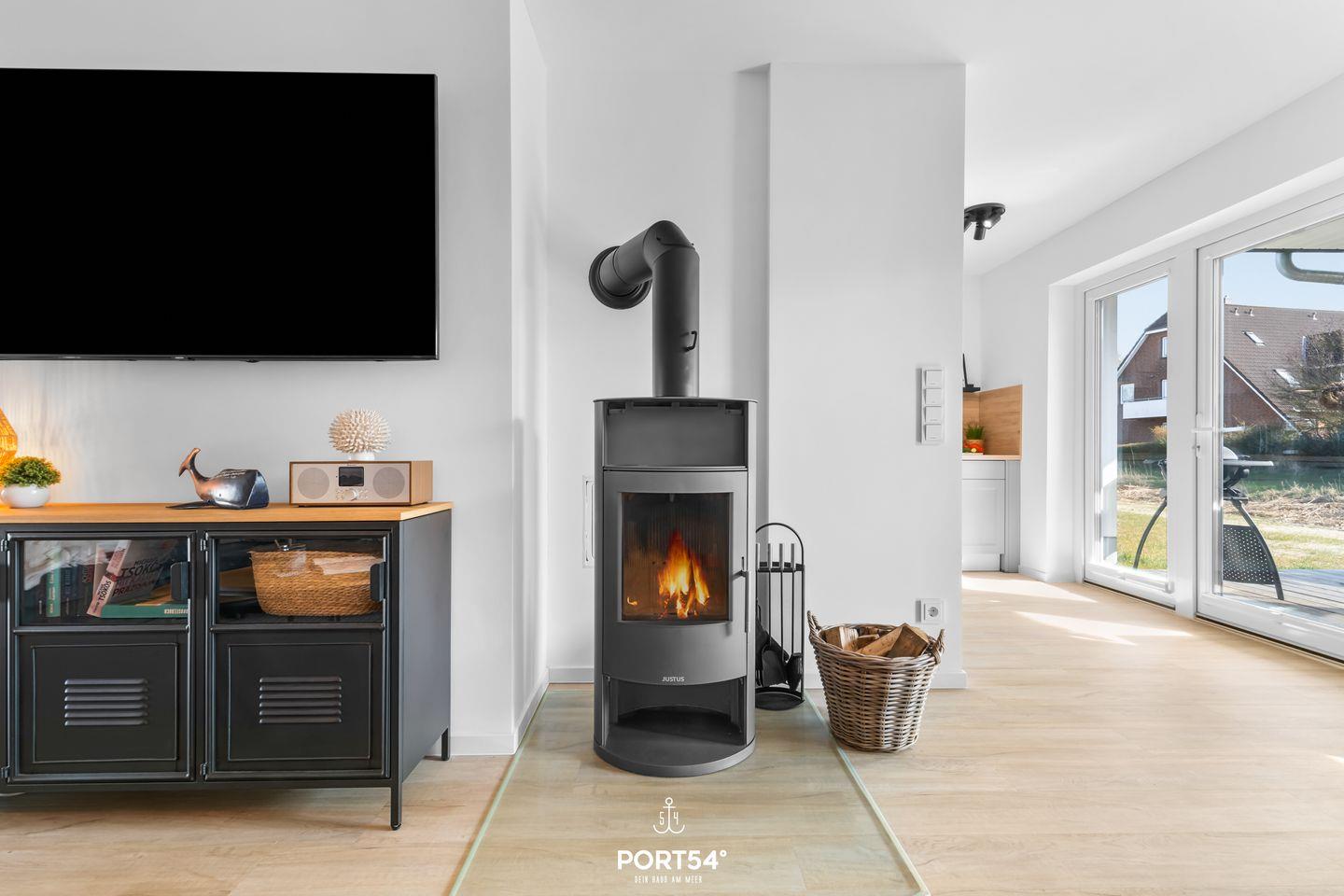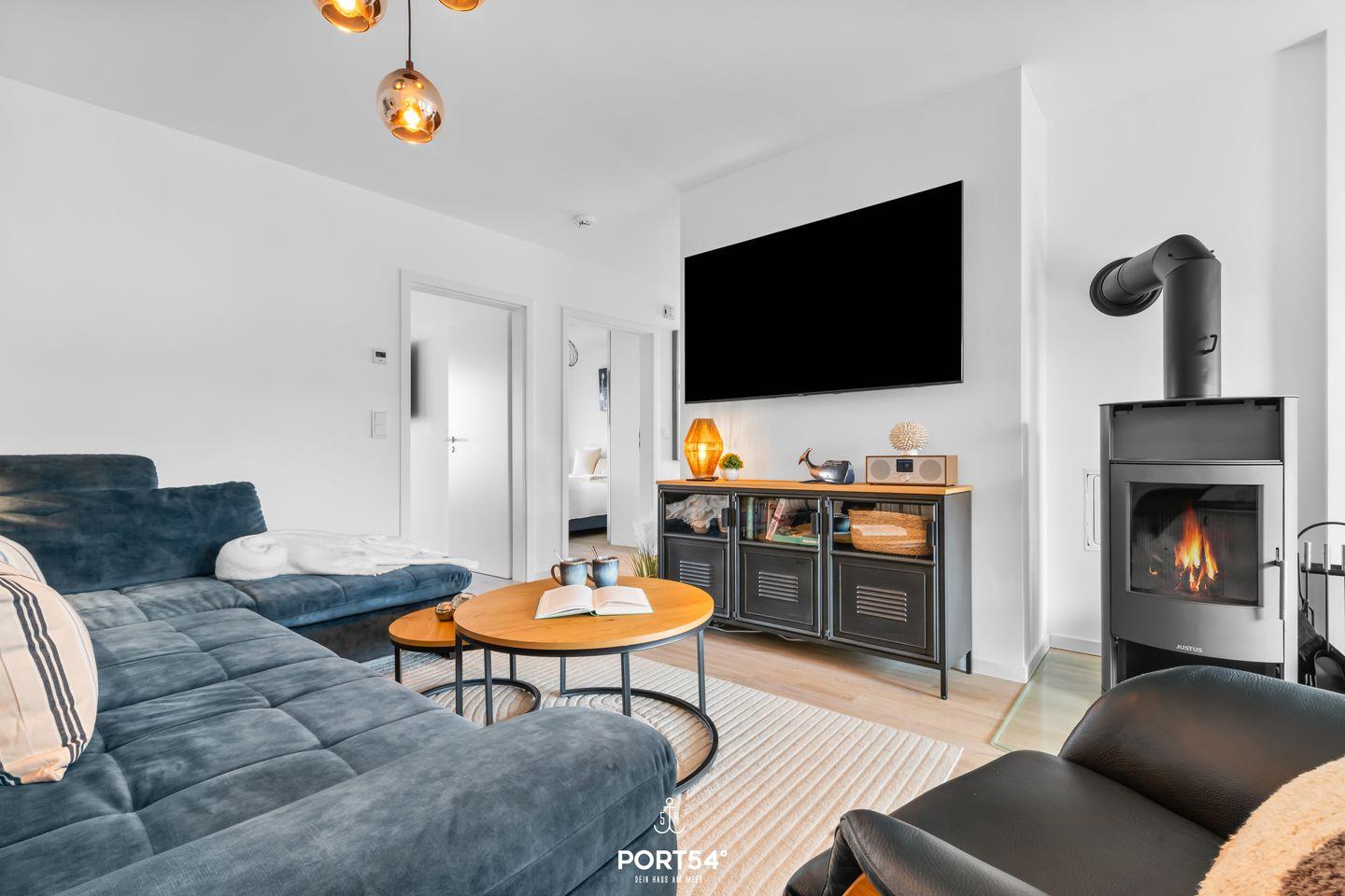 Moderne Ferienwohnung 'Beach Break' in Büsum mit Kamin, Terrasse und Badewanne für entspannte Nordseeurlaubsmomente.