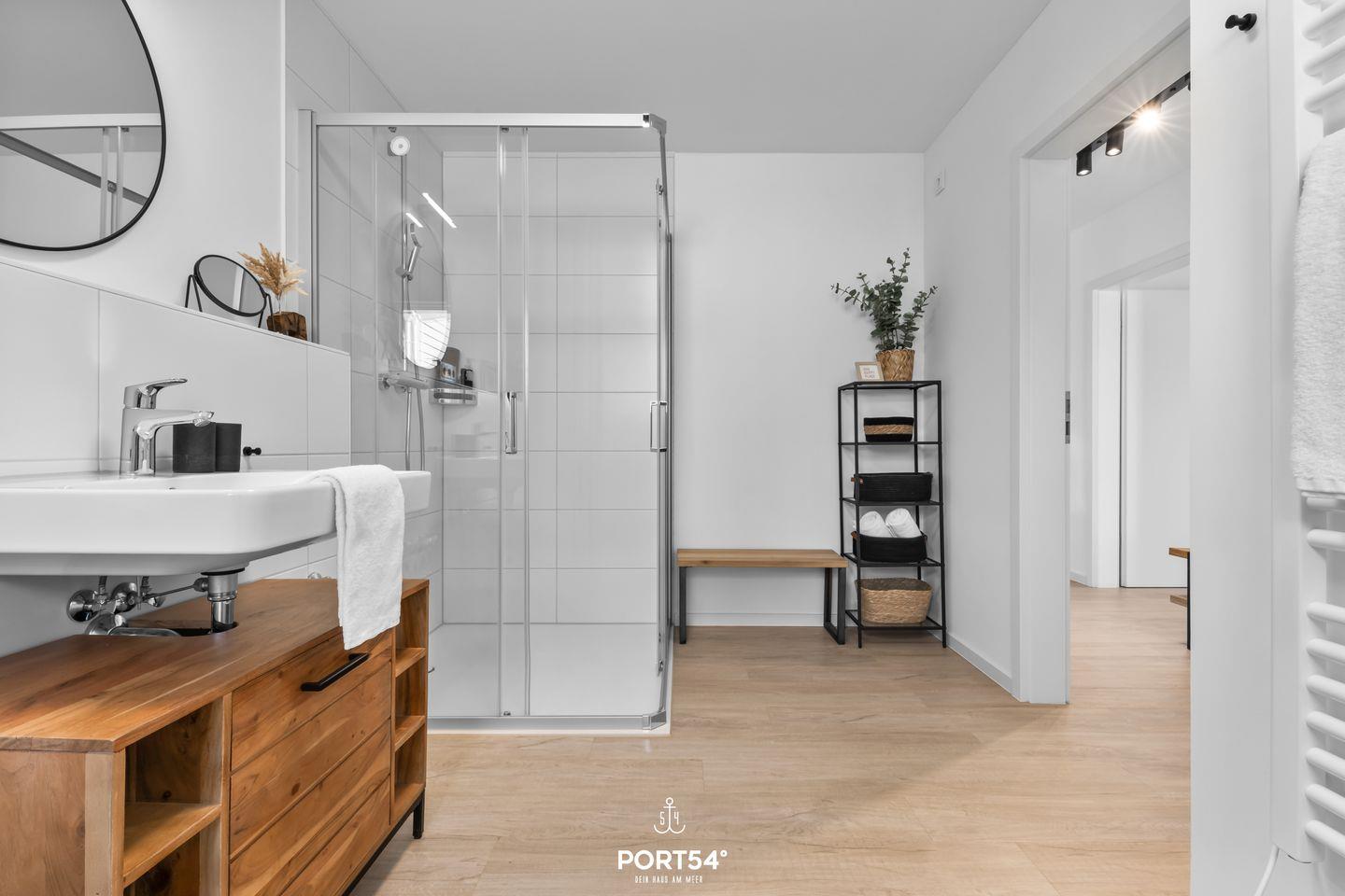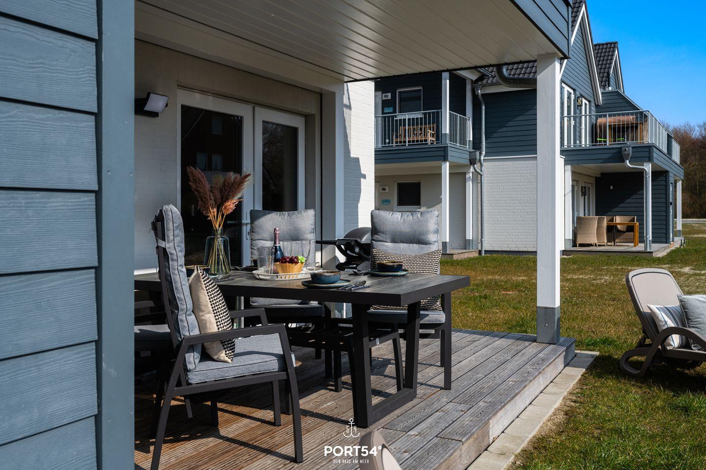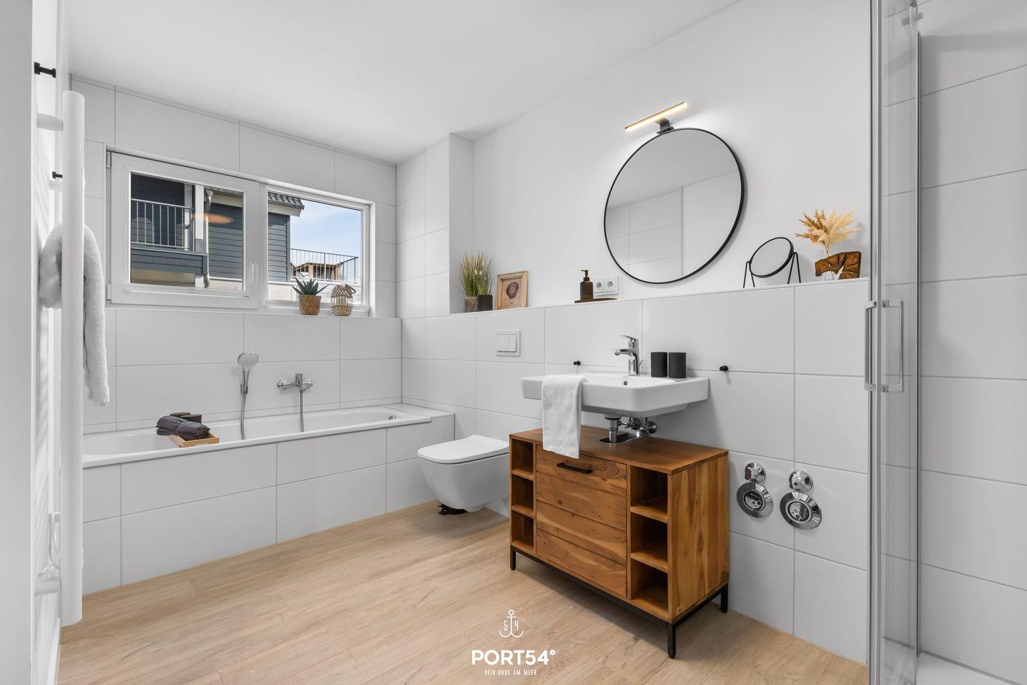 Das moderne Tageslichtbad punktet mit einer großen, ebenerdigen Dusche und einer Badewanne für zusätzliche Entspannung. Ein Handtuchtrockner und ein Föhn runden die Ausstattung des Bades ab. Auf der überdachten Terrasse können Sie einen Blick ins Grüne genießen. Diese ist mit hochwertigen Gartenmöbeln für bis zu 6 Personen und zwei bequemen Gartenliegen ausgestattet. Hier können Sie die frische Nordseeluft in vollen Zügen genießen und gemütliche Grillabende an lauen Sommerabenden mit dem vorhandenen Weber-Elektrogrill veranstalten.