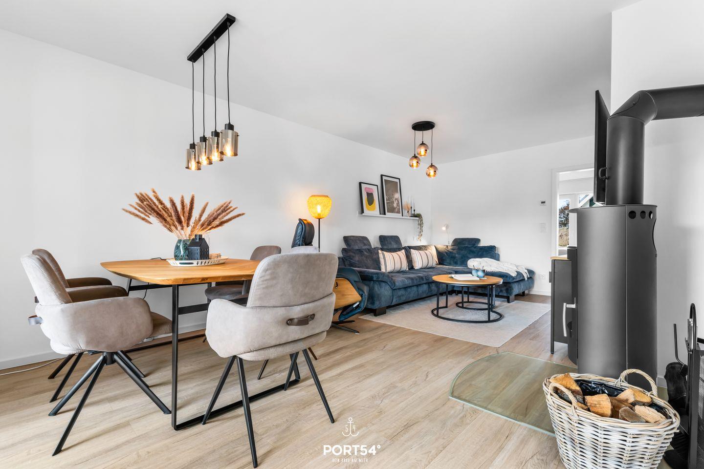 Im Wohnzimmer lädt ein gemütliches und großzügiges Relaxsofa mit verstellbaren Rückenlehnen zum Verweilen ein. Hier finden alle Gäste Platz. Die Schlafsofafunktion mit einer Liegefläche von ca. 2,19 m x 1,32 m bietet zudem die Möglichkeit der Unterbringung von 1-2 weiteren Personen. Zusätzlich sorgt ein komfortabler Leder-Relaxsessel mit Liegefunktion im Wohnzimmer für ultimative Entspannung. Für gemeinsame Filmabende bietet der 65 Zoll Fernseher mit Magenta-TV und Glasfaseranschluss alle Möglichkeiten für Kinofeeling. Ein Kaminofen für eine behagliche Atmosphäre und eine hochwertige und großzügige Sitzgruppe (mit bis zu 6 Plätzen) sowie eine Spieleauswahl für gesellige Abende runden die Ausstattung ab.