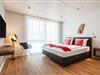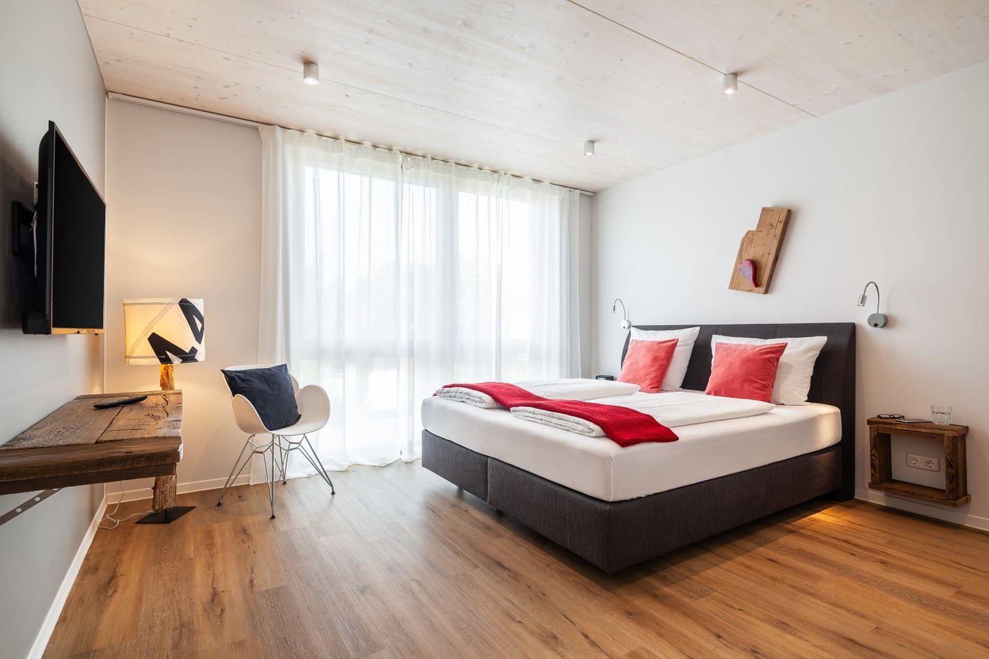 Boxspringdoppelnett mit durchgehender Matratze (160x200cm), Nachttische + Lampen, Kleiderschrank, Flachbild-TV, Fliegengitter