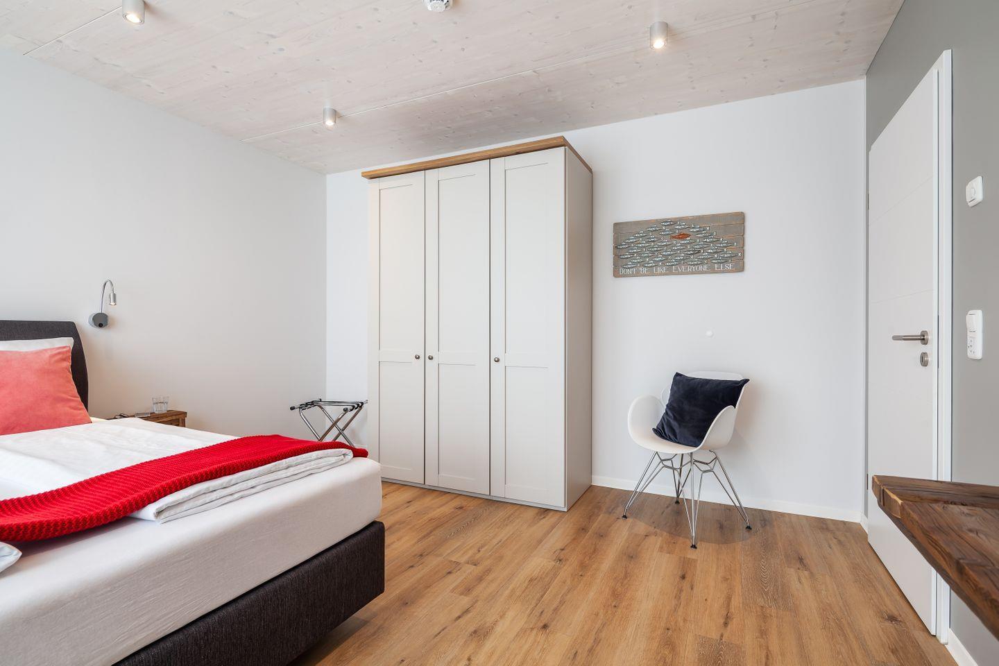 Zwei Schlafzimmer mit TV bieten ruhige Rückzugsorte, das Duschbad mit ebenerdiger Dusche und Fußbodenheizung sorgt für einen angenehmen Start in den Urlaubstag. Die Küchenzeile ist hochwertig ausgestattet – ideal für das schnelle Frühstück ebenso wie für den gemütlichen Kochabend nach Strand und Hafenbummel.