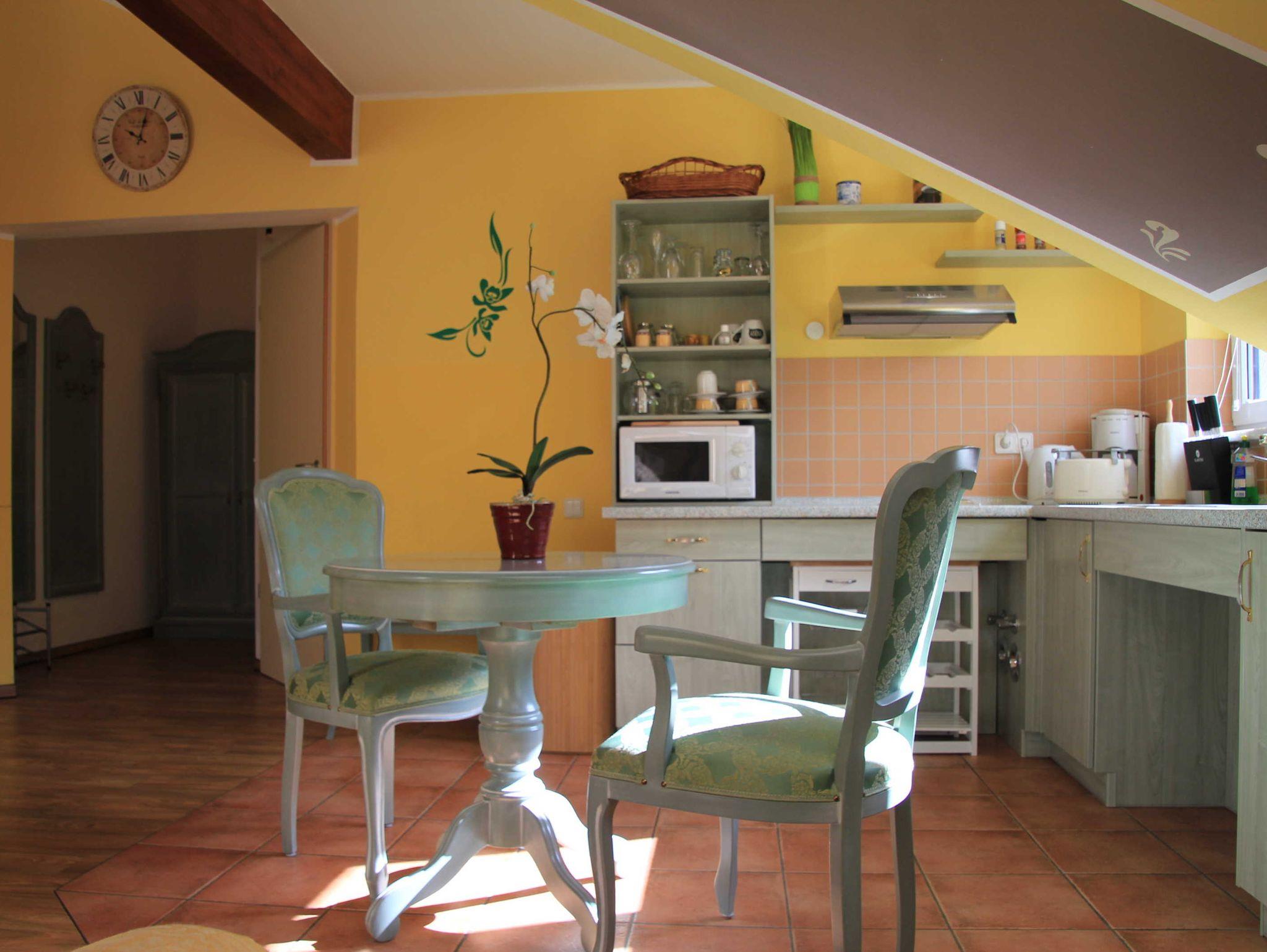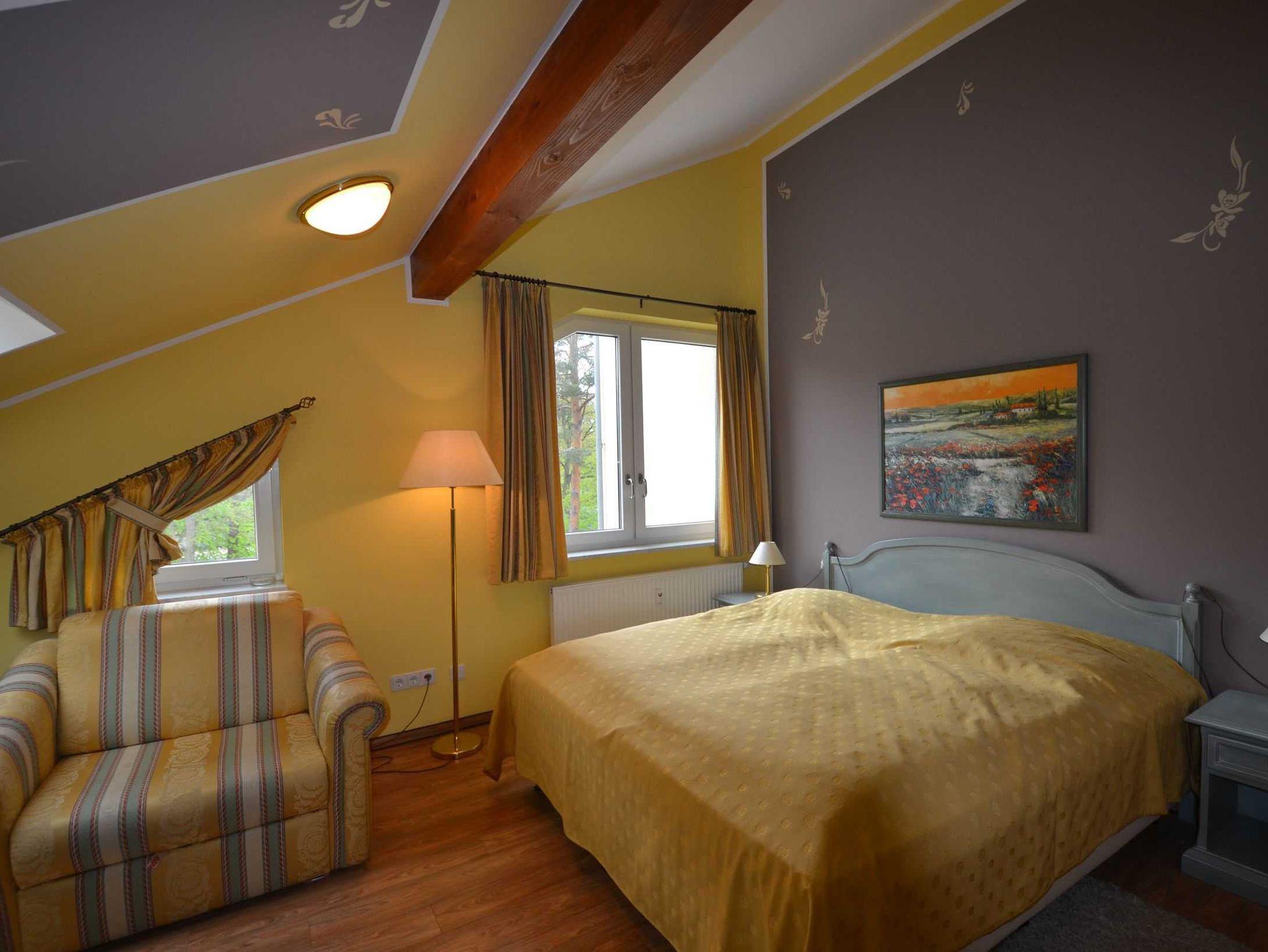 Das lichtdurchflutete Appartement Nr. 8 Sommertraum befindet sich im Dachgeschoss der Villa Wauzi und lädt dazu ein, den Tag gemütlich zu beginnen und ausklingen zu lassen. Der Wechsel von hohen Decken, Balken und Dachschrägen lässt die fast 40 qm große Ferienwohnung nicht nur sehr geräumig wirken, sondern sorgt für echte Wohlfühlatmosphäre. Die hochwertige und farblich komplett aufeinander abgestimmte Ausstattung lässt es an nichts fehlen und bietet Platz für 2 Erwachsene (im Boxspring-Doppelbett) mit Kind oder wahlweise 3. Erwachsenen (ausziehbarer Schlafsessel) plus Aufbettung auf Wunsch für ein Kleinkind bis 2 Jahre (im Reisebett).