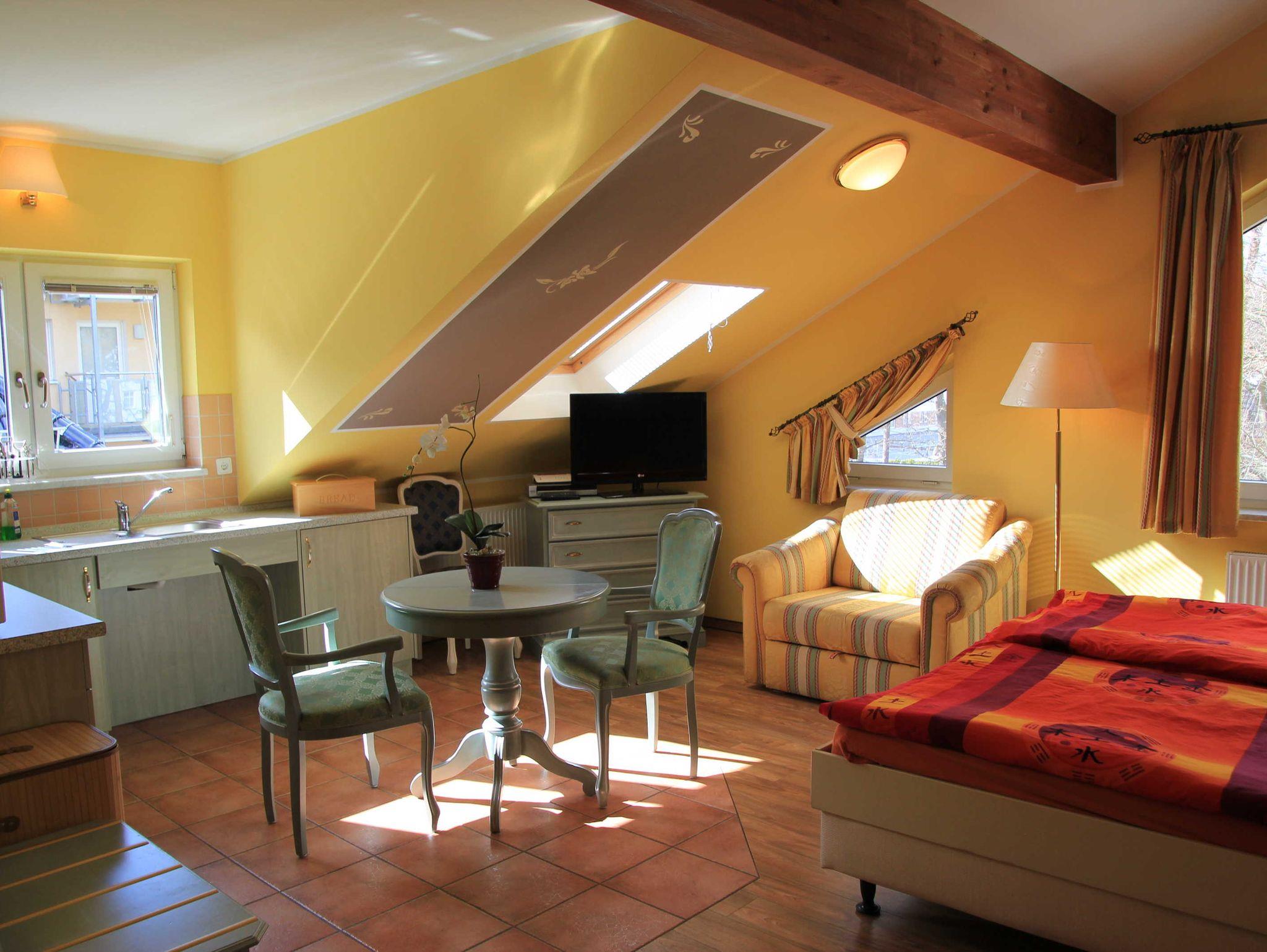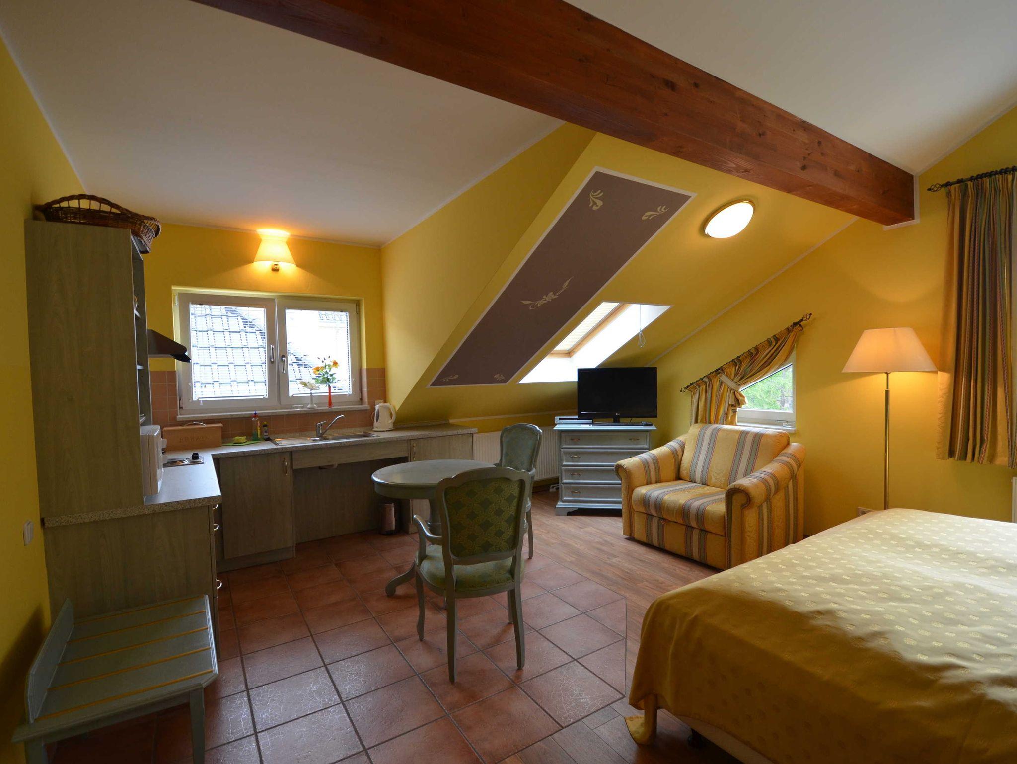 Gemütliche und geräumige 1-Zimmer Dachgeschoss-Ferienwohnung, rollstuhlgerecht, kostenfreies WLan, Waschmaschine, Küchenzeile, TV-Flatscreen, kostenfreier KFZ-Stellplatz, 150m zum Strand.