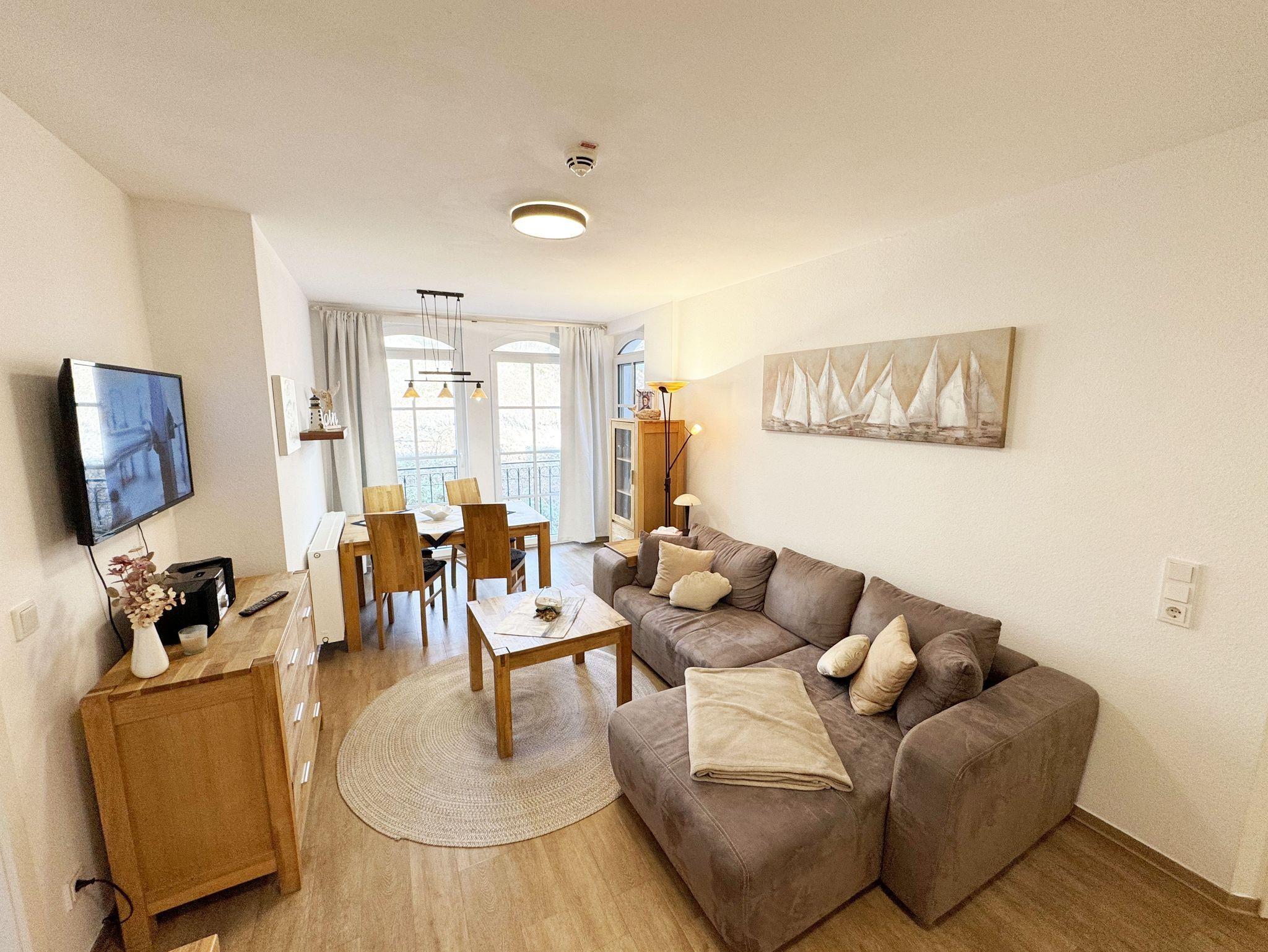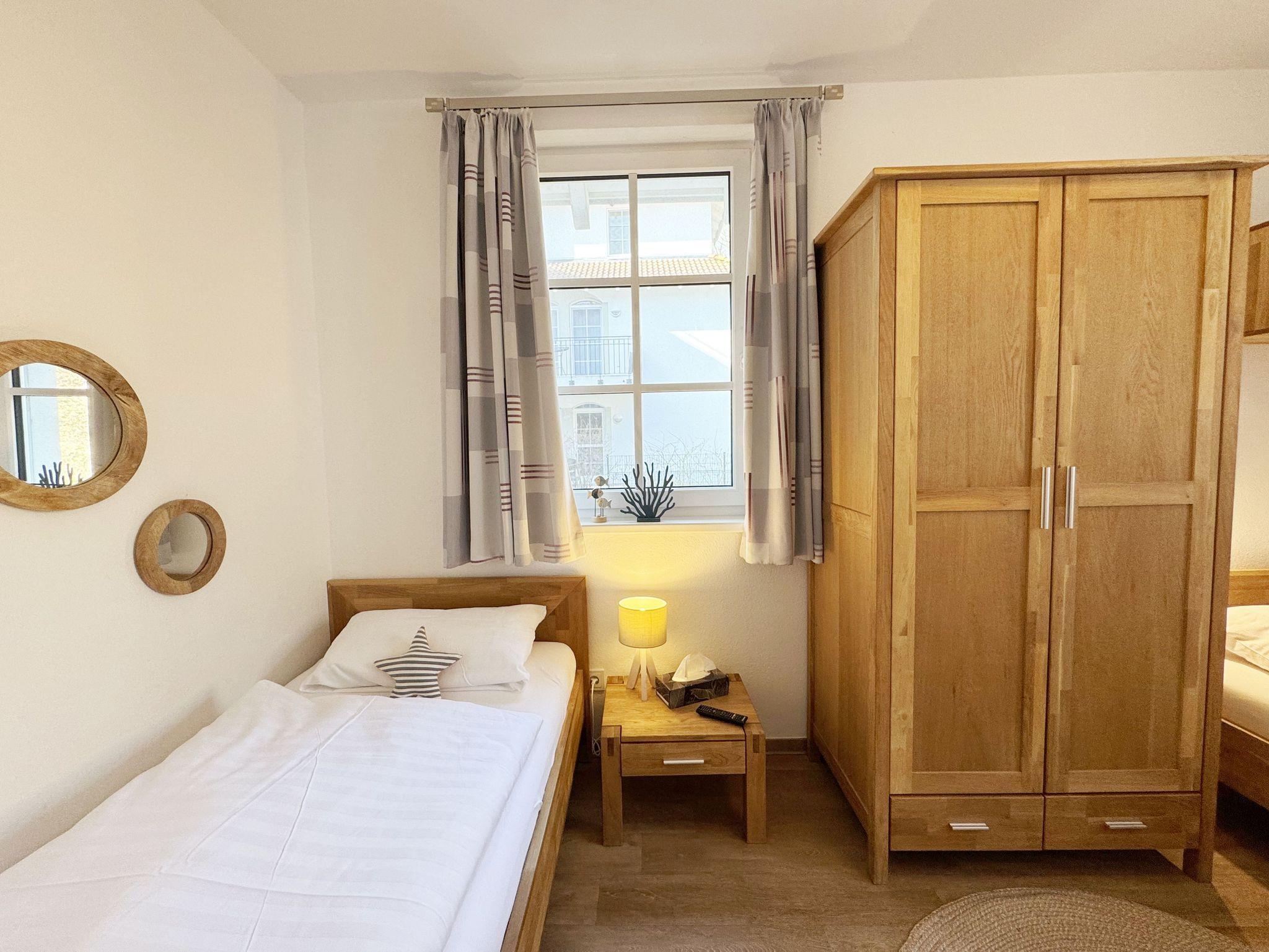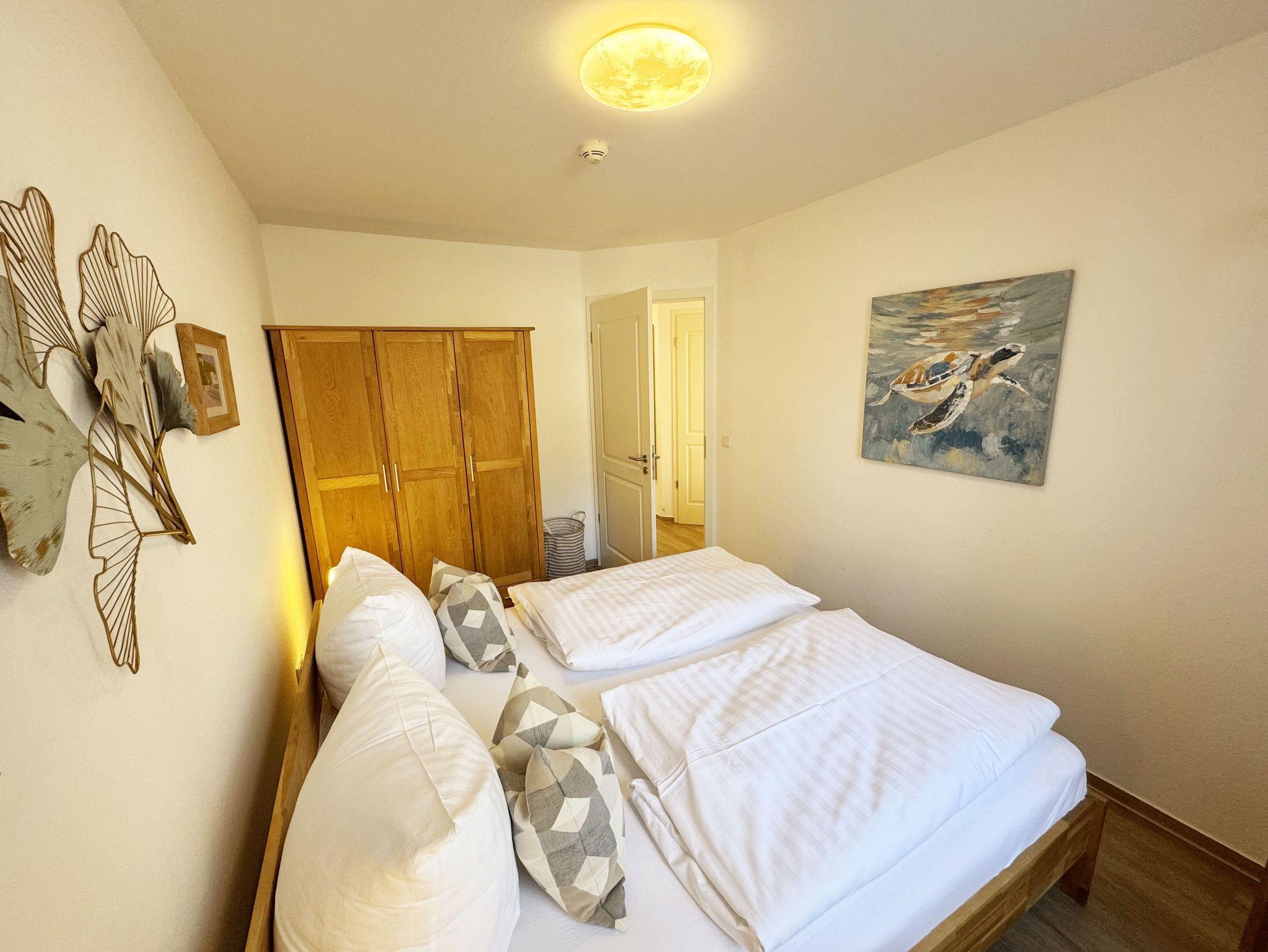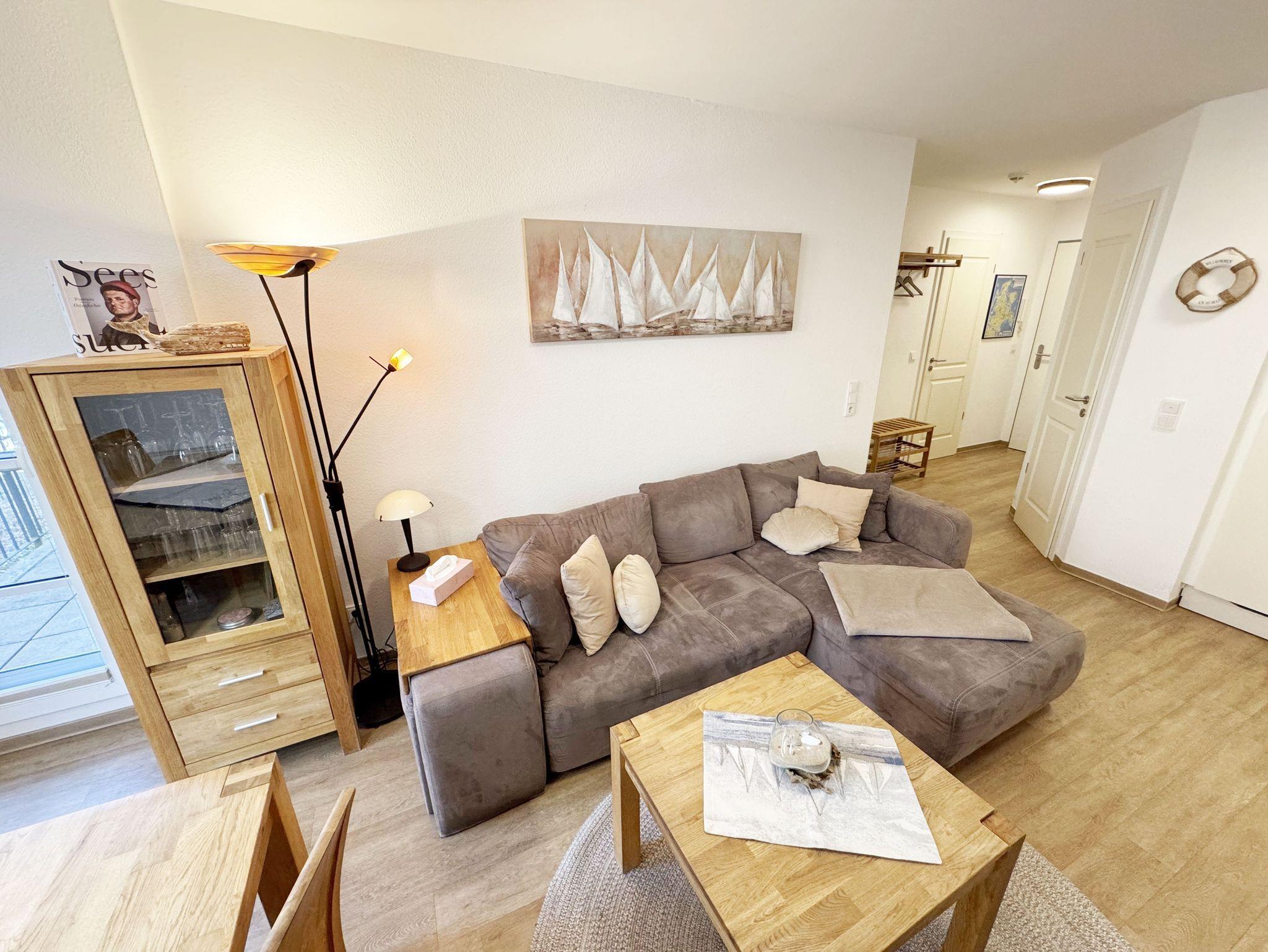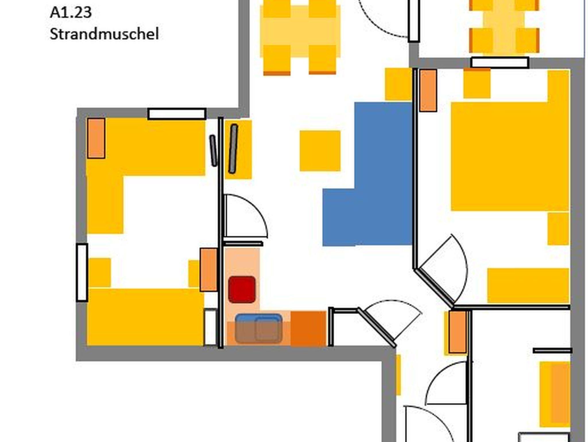Ihre Nichtraucher/Ferienwohnung ist mit viel Liebe zum Detail ausgestattet und eingerichtet worden. Sie wohnen in einer ca. 50 qm Dreizimmerwohnung, die für 2 bis 4 Personen ausgelegt ist. Ein Kleinkind bis 3 Jahre kann zusätzlich im mitgebrachten bzw. dazu gebuchten Kinderreisebett untergebracht werden. Die Wohnung A 1.23 befindet sich in der 1. Etage und ist per Fahrstuhl bequem zu erreichen. In der Wohnung finden Sie einen kombinierten Wohn-/Koch- und Essbereich. Die integrierte moderne Küchenzeile lässt mit einer eingebauten Mikrowelle mit Grillfunktion, Ceran-Kochfeld, Dunstabzugshaube, Geschirrspüler, Kühlschrank mit Eisfach, Kaffeemaschine und anderen praktischen Helfern keine kulinarischen Wünsche offen. Der offene Wohnbereich ist geschmackvoll mit Massivholzmöbeln, Leder-Ecksofa, Stehlampe und einer Vitrine eingerichtet. Abgerundet wird der Wohnbereich mit einer Musikanlage mit CD und DVD sowie einem Smart-TV. Auch auf einen Internetanschluss (WLAN) müssen Sie im Urlaub nicht verzichten. Dieser ist für Sie inklusive! Direkt vor den großen Balkonfenstern finden Sie einen Esstisch mit 4 Stühlen, der Ihnen genügend Platz bietet. Der Balkon (mit eingeschränktem Meerblick) verfügt über einen Massivholzesstisch und vier Stühle. Begehbar ist der Balkon von dem Wohn-/Essbereich. Das 1. Schlafzimmer ist mit einem Doppelbett (1,80 m x 2,00 m), Nachttischkonsolen und Kleiderschrank ausgestattet. Das 2. Schlafzimmer verfügt über 2 Einzelbetten (0,90 m x 2,00 m), Kleiderschrank und einem 23 Zoll LCD-TV mit integrierten DVD-Player. Verdunkelungsgardinen schützen in der Wohnung vor fremden Blicken von außerhalb. Insektenschutzgitter sorgen zusätzlich für einen ruhigen Schlaf. In der Abstellkammer der Wohnung finden Sie einen Staubsauger, Wäschetrockner für den Balkon und ein wenig Abstellfläche. Das hochwertige Bad ist mit einer ebenerdigen Echtglasdusche, Waschtischkombination mit integriertem Waschbecken, beleuchtetem Spiegelschrank, Kosmetikspiegel, Fön, WC und einem Handtuchheizkörper versehen. Ein eigener PKW-Stellplatz (Nr. 106, Einfahrtshöhe 2,00m) befindet sich in der Tiefgarage des Hauses. 1 Hund (klein bis mittel) kann gegen eine Gebühr mitgebracht werden. Im Keller des Hauses haben Sie die Möglichkeit eine Waschmaschine/Trockner gegen Gebühr zu nutzen. Mit dem Fahrstuhl des Hauses A gelangen sie in das Untergeschoss der Meeresblickanlage, wo Sie ein großzügiger und heller Wellnessbereich erwartet. Hier können sie in einem Pool kleine Bahnen schwimmen, in 2 Saunen Ihren Kreislauf in Schwung bringen, in einem dazugehörigen Ruheraum Ihren Körper wieder beruhigen, in einer Schneckendusche sowie weiteren Duschen das kühle Nass genießen und auf einer Außenterrasse mit Außendusche die frische Luft einatmen. Die Erstausstattung eines Wäschepaketes (komplette Bettwäsche, 1 Duschhandtuch, 2 kleine Handtücher) können Sie bis 14 Tage vor Anreise gegen einen Aufpreis dazu buchen oder durch eigene ergänzen. Ab 2 gebuchten Paketen erhalten Sie einmalig 1 Geschirrhandtuch und 1 Duschvorleger hinzu.