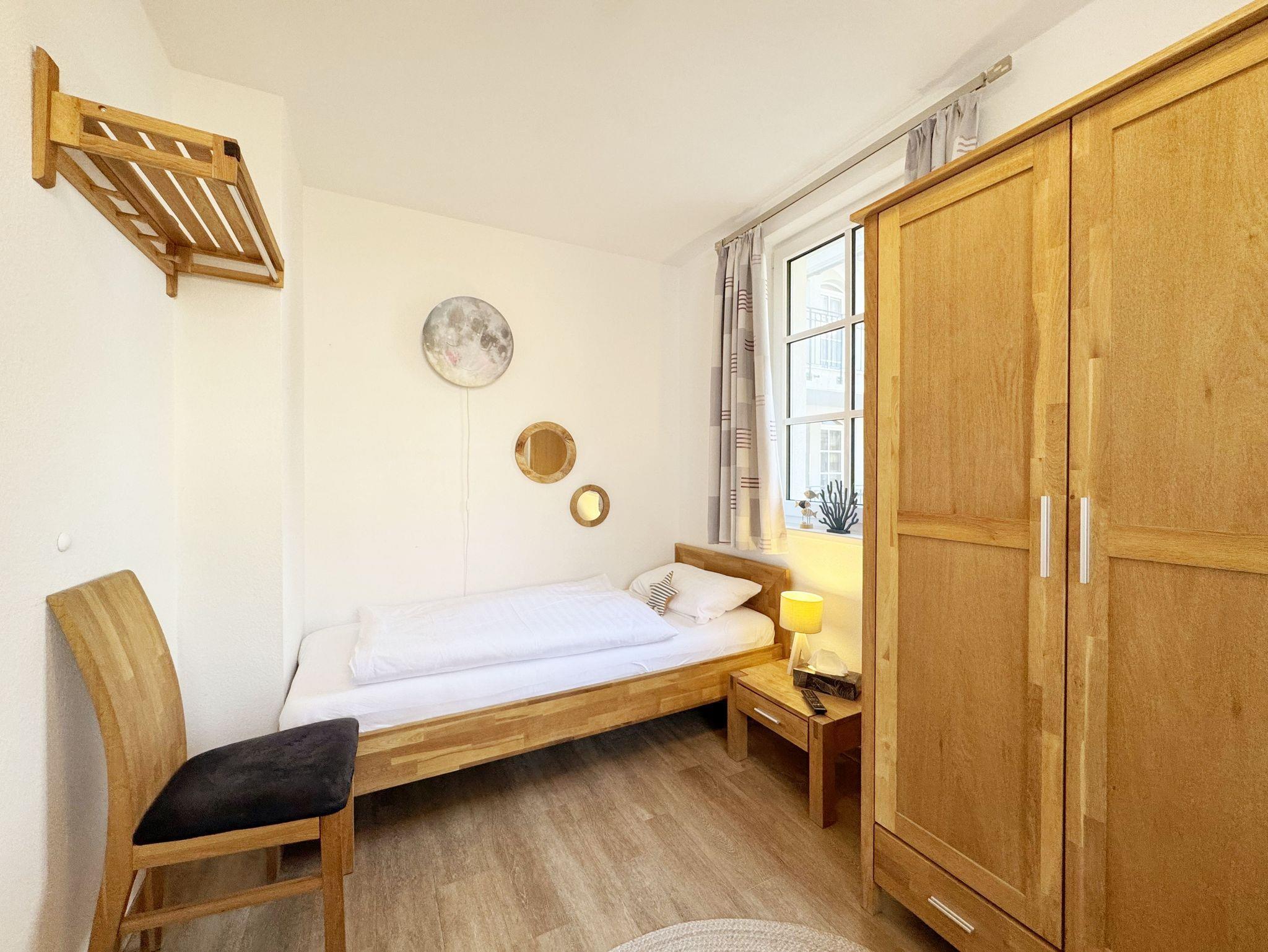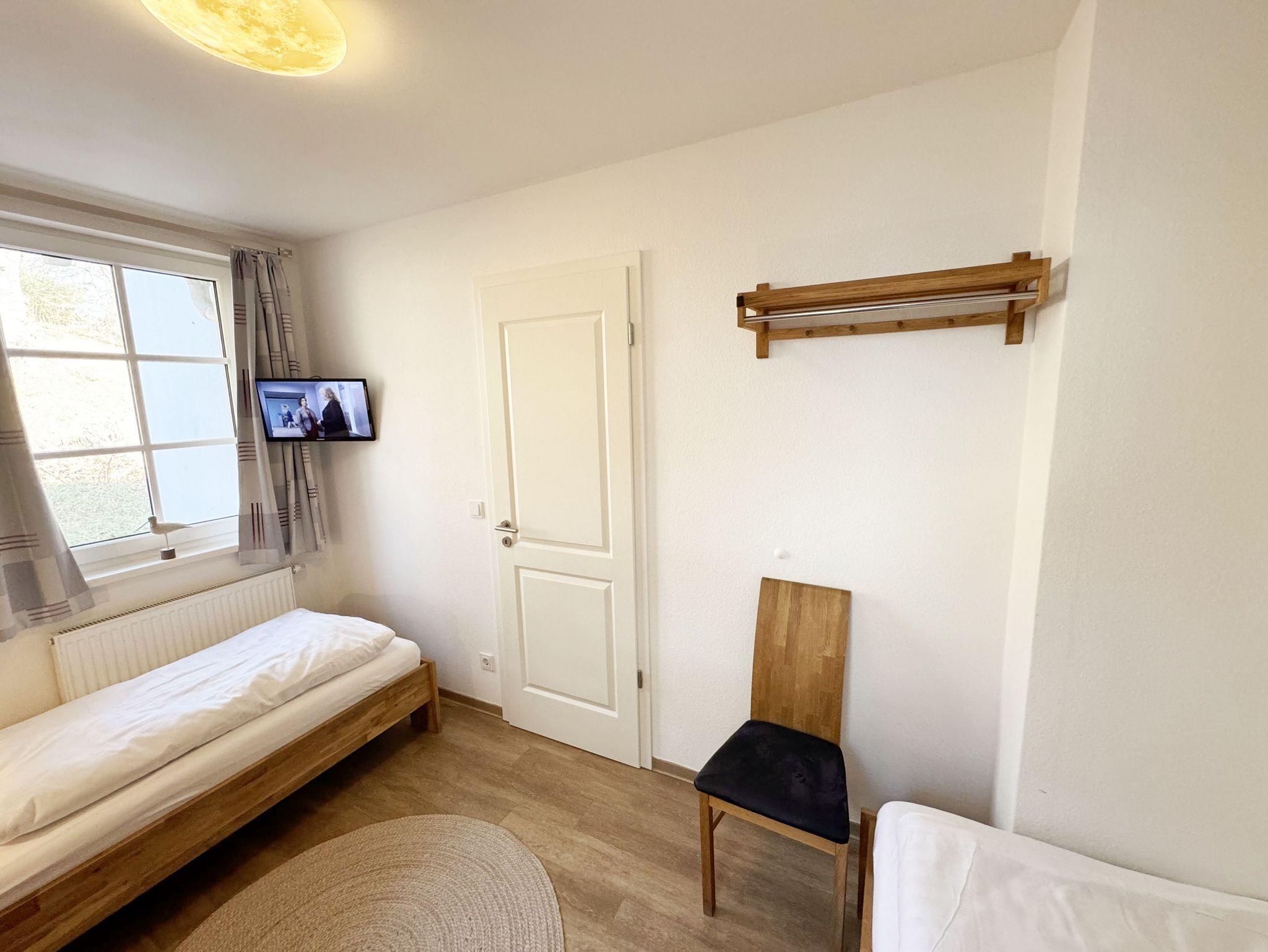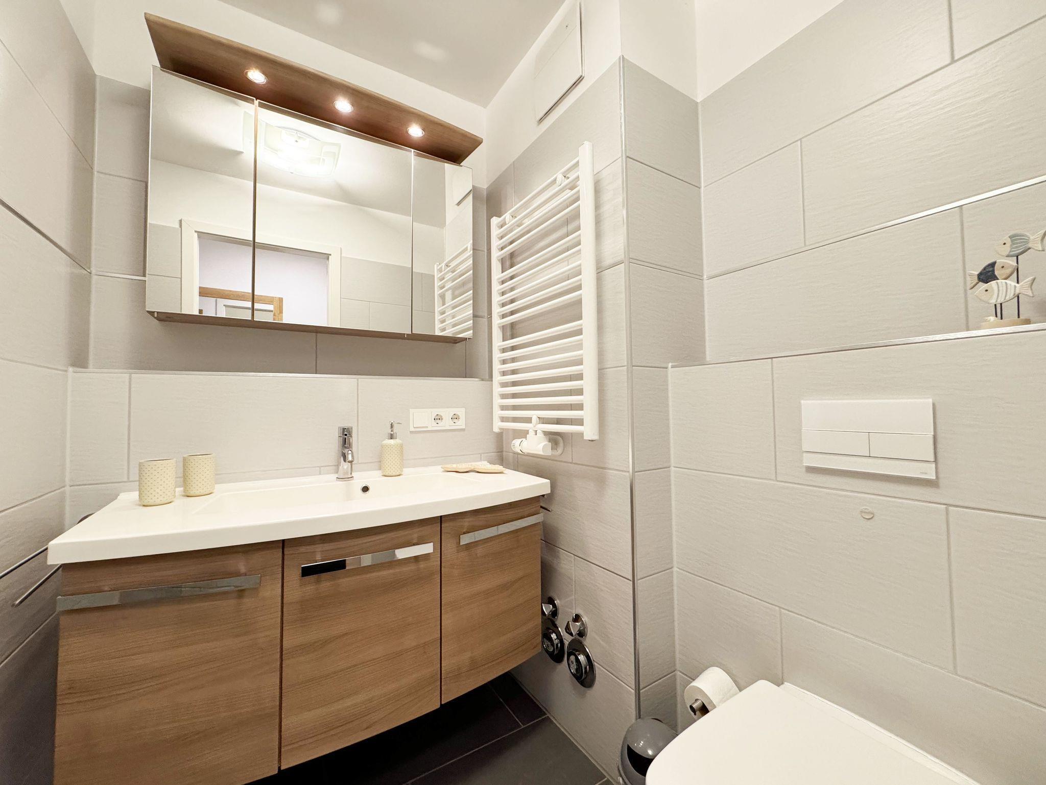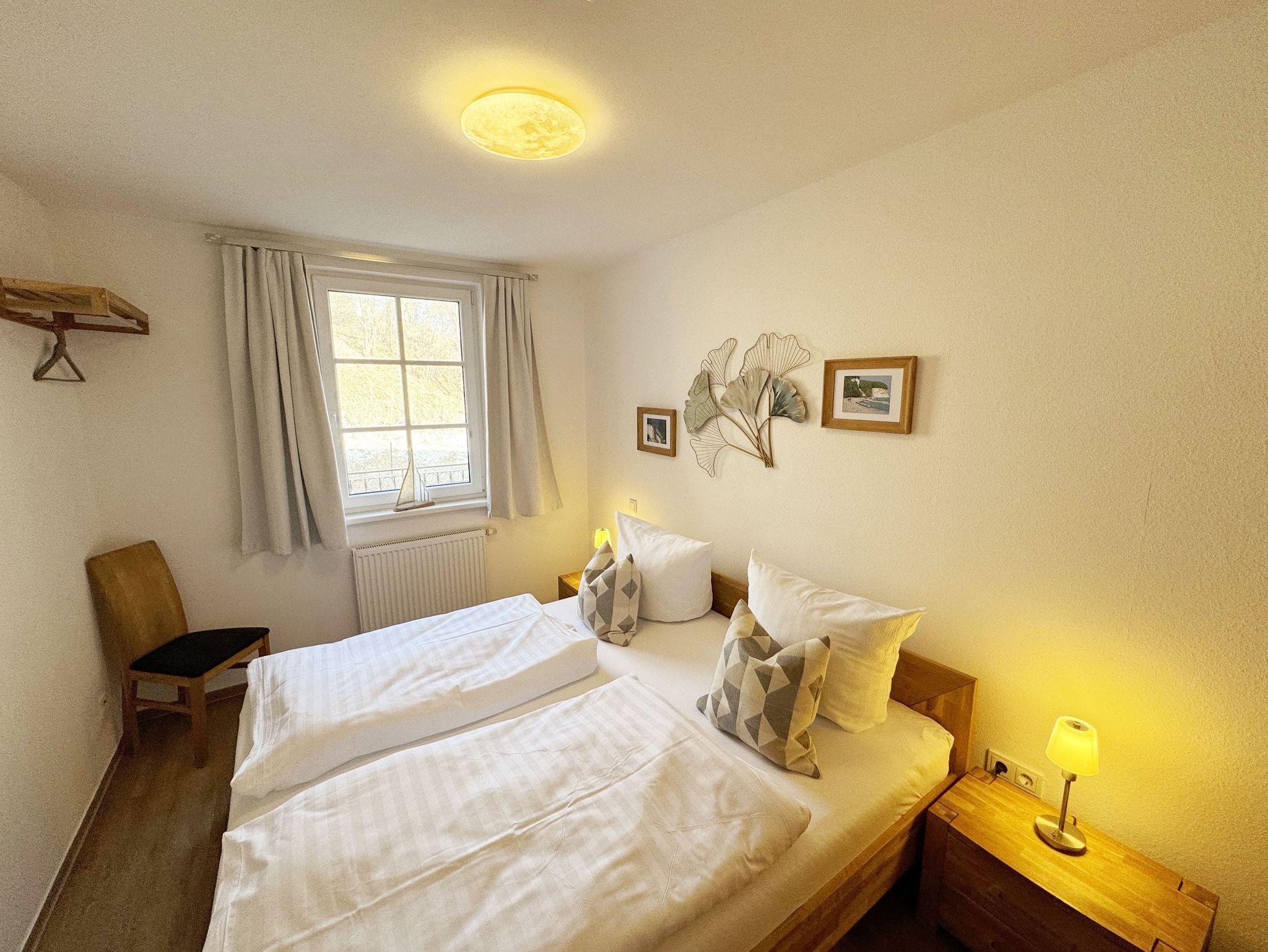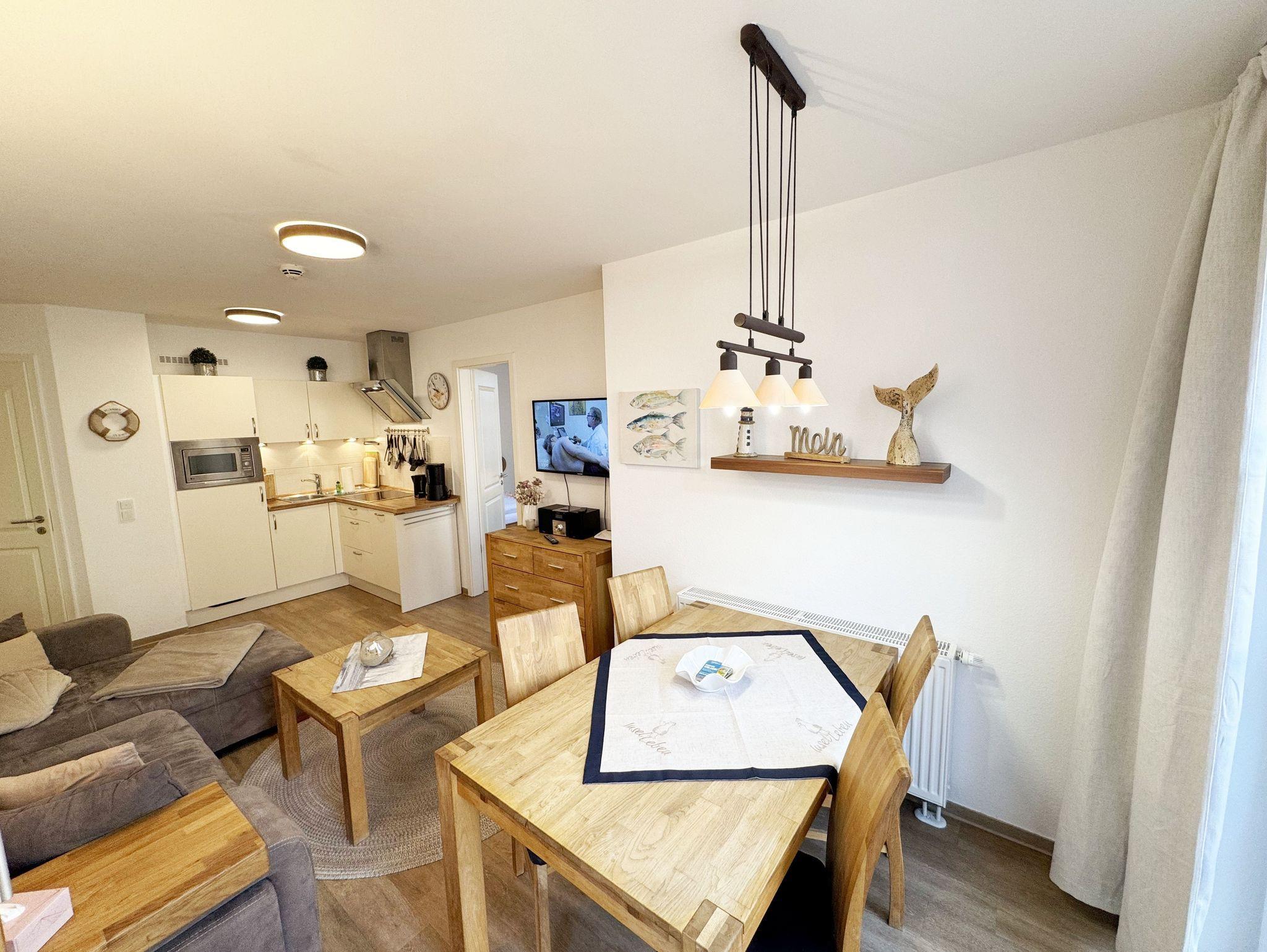 Ihre Nichtraucher/Ferienwohnung ist mit viel Liebe zum Detail ausgestattet und eingerichtet worden. Sie wohnen in einer ca. 50 qm Dreizimmerwohnung, die für 2 bis 4 Personen ausgelegt ist. Ein Kleinkind bis 3 Jahre kann zusätzlich im mitgebrachten bzw. dazu gebuchten Kinderreisebett untergebracht werden. Die Wohnung A 1.23 befindet sich in der 1. Etage und ist per Fahrstuhl bequem zu erreichen. In der Wohnung finden Sie einen kombinierten Wohn-/Koch- und Essbereich. Die integrierte moderne Küchenzeile lässt mit einer eingebauten Mikrowelle mit Grillfunktion, Ceran-Kochfeld, Dunstabzugshaube, Geschirrspüler, Kühlschrank mit Eisfach, Kaffeemaschine und anderen praktischen Helfern keine kulinarischen Wünsche offen. Der offene Wohnbereich ist geschmackvoll mit Massivholzmöbeln, Leder-Ecksofa, Stehlampe und einer Vitrine eingerichtet. Abgerundet wird der Wohnbereich mit einer Musikanlage mit CD und DVD sowie einem Smart-TV. Auch auf einen Internetanschluss (WLAN) müssen Sie im Urlaub nicht verzichten. Dieser ist für Sie inklusive! Direkt vor den großen Balkonfenstern finden Sie einen Esstisch mit 4 Stühlen, der Ihnen genügend Platz bietet. Der Balkon (mit eingeschränktem Meerblick) verfügt über einen Massivholzesstisch und vier Stühle. Begehbar ist der Balkon von dem Wohn-/Essbereich. Das 1. Schlafzimmer ist mit einem Doppelbett (1,80 m x 2,00 m), Nachttischkonsolen und Kleiderschrank ausgestattet. Das 2. Schlafzimmer verfügt über 2 Einzelbetten (0,90 m x 2,00 m), Kleiderschrank und einem 23 Zoll LCD-TV mit integrierten DVD-Player. Verdunkelungsgardinen schützen in der Wohnung vor fremden Blicken von außerhalb. Insektenschutzgitter sorgen zusätzlich für einen ruhigen Schlaf. In der Abstellkammer der Wohnung finden Sie einen Staubsauger, Wäschetrockner für den Balkon und ein wenig Abstellfläche. Das hochwertige Bad ist mit einer ebenerdigen Echtglasdusche, Waschtischkombination mit integriertem Waschbecken, beleuchtetem Spiegelschrank, Kosmetikspiegel, Fön, WC und einem Handtuchheizkörper versehen. Ein eigener PKW-Stellplatz (Nr. 106, Einfahrtshöhe 2,00m) befindet sich in der Tiefgarage des Hauses. 1 Hund (klein bis mittel) kann gegen eine Gebühr mitgebracht werden. Im Keller des Hauses haben Sie die Möglichkeit eine Waschmaschine/Trockner gegen Gebühr zu nutzen. Mit dem Fahrstuhl des Hauses A gelangen sie in das Untergeschoss der Meeresblickanlage, wo Sie ein großzügiger und heller Wellnessbereich erwartet. Hier können sie in einem Pool kleine Bahnen schwimmen, in 2 Saunen Ihren Kreislauf in Schwung bringen, in einem dazugehörigen Ruheraum Ihren Körper wieder beruhigen, in einer Schneckendusche sowie weiteren Duschen das kühle Nass genießen und auf einer Außenterrasse mit Außendusche die frische Luft einatmen. Die Erstausstattung eines Wäschepaketes (komplette Bettwäsche, 1 Duschhandtuch, 2 kleine Handtücher) können Sie bis 14 Tage vor Anreise gegen einen Aufpreis dazu buchen oder durch eigene ergänzen. Ab 2 gebuchten Paketen erhalten Sie einmalig 1 Geschirrhandtuch und 1 Duschvorleger hinzu.