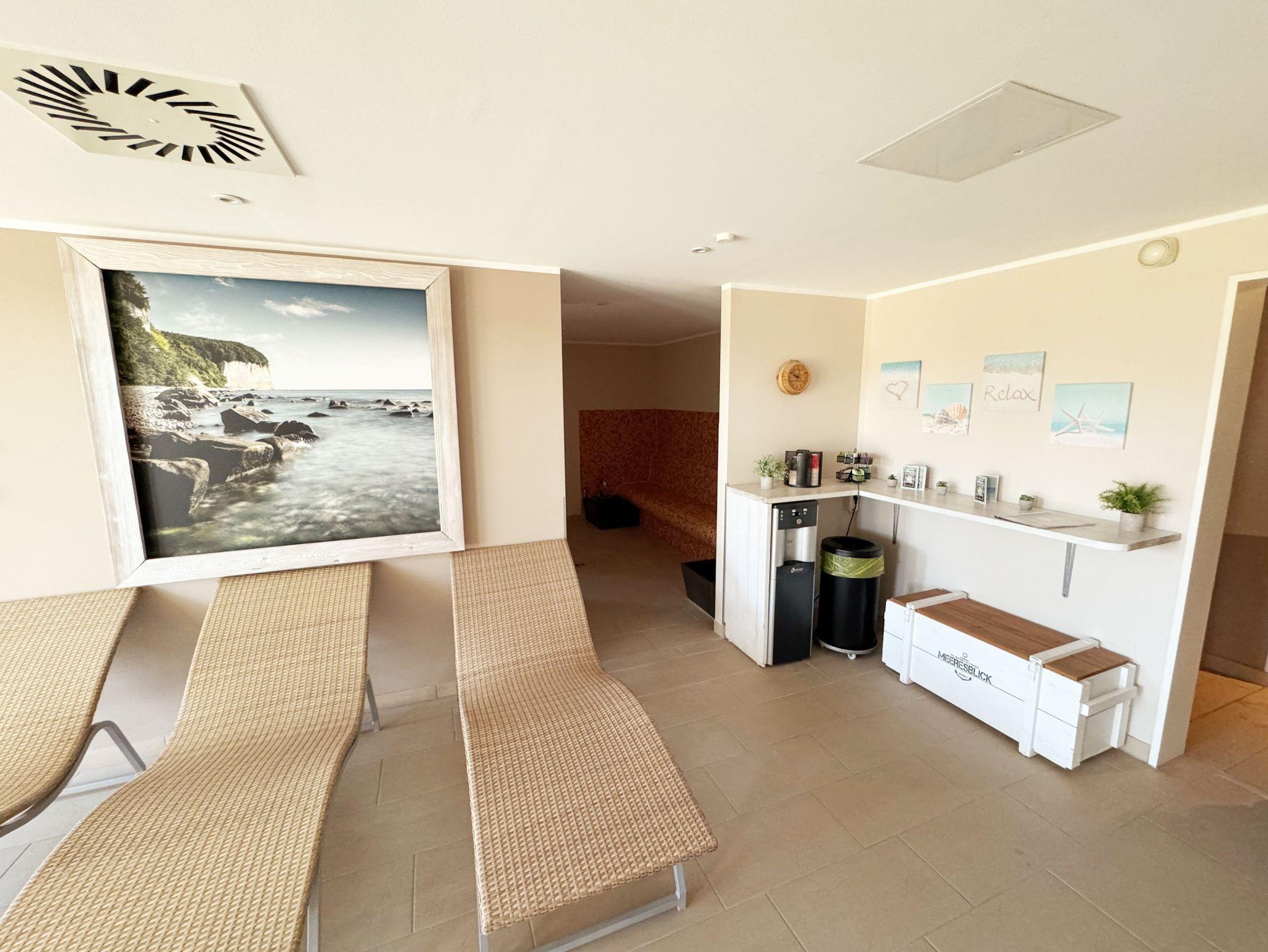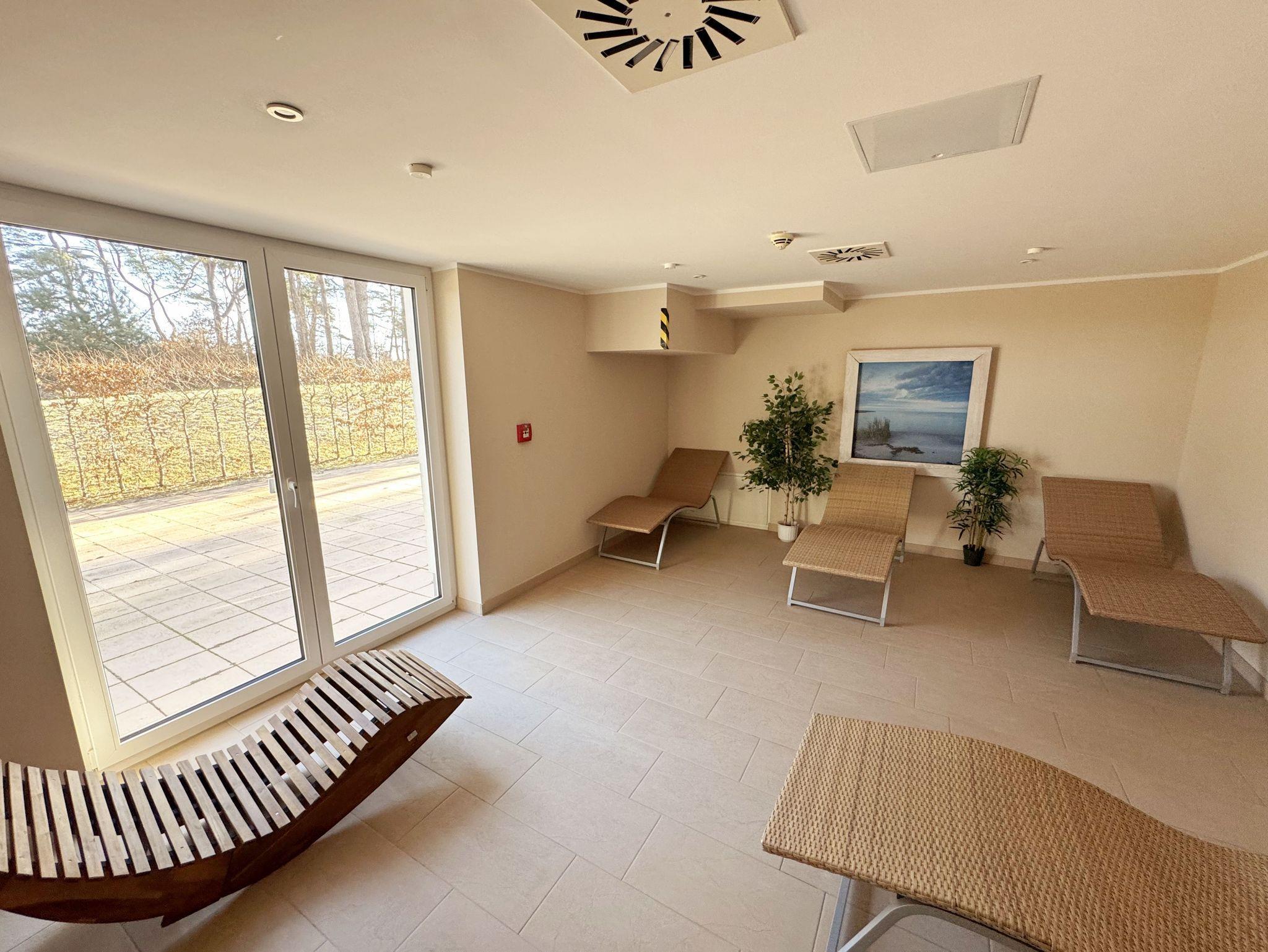 Unmittelbar am Kurpark des Ostseebades Baabe, umgeben von Kiefern befindet sich die neue Appartementanlage Meeresblick. Die Ferienanlage besteht aus 3 freistehenden Häusern und ist nur ca. 80 Meter vom feinen Sandstrand entfernt. An die hiesige Bäderarchitektur angelehnt fügt sich die Meeresblickanlage wohltuend in die Umgebung ein. Die Ferienwohnungen verfügen über einen hohen Komfort und lassen Ihren Urlaubstraum wahr werden. Im Haupthaus befindet sich ein Wellnessbereich mit Innenpool, Sauna und Ruheraum (inklusive) der zur Entspannung einlädt. Eine hauseigene Tiefgarage sorgt dafür, dass Ihr PKW sicher untergebracht ist. Cafés und Restaurants laden in der Anlage zum Verweilen ein. Ein weiteres Highlight ist der Müther Schalenbau (Restaurant Inselparadies Baabe), welches saniert, restauriert und in die Meeresblickanlage liebevoll integriert wurde. Von hier aus haben Sie einen fantastischen Blick auf die weite Ostsee. Die Wohnung Strandmuschel (A 1.23) befindet sich im Haupthaus A im 1. Obergeschoss und verfügt über einen Balkon mit eingeschränktem Meerblick.