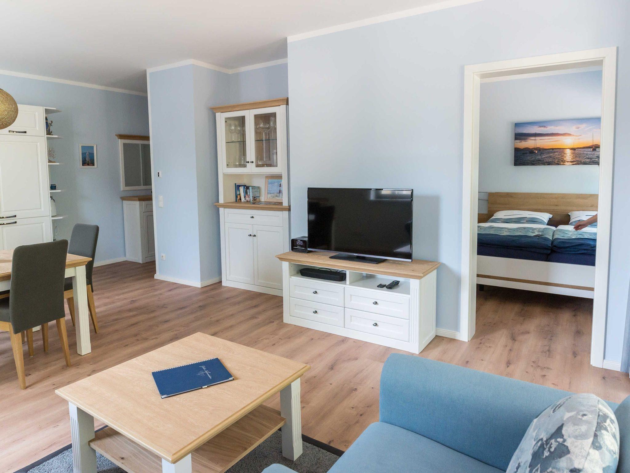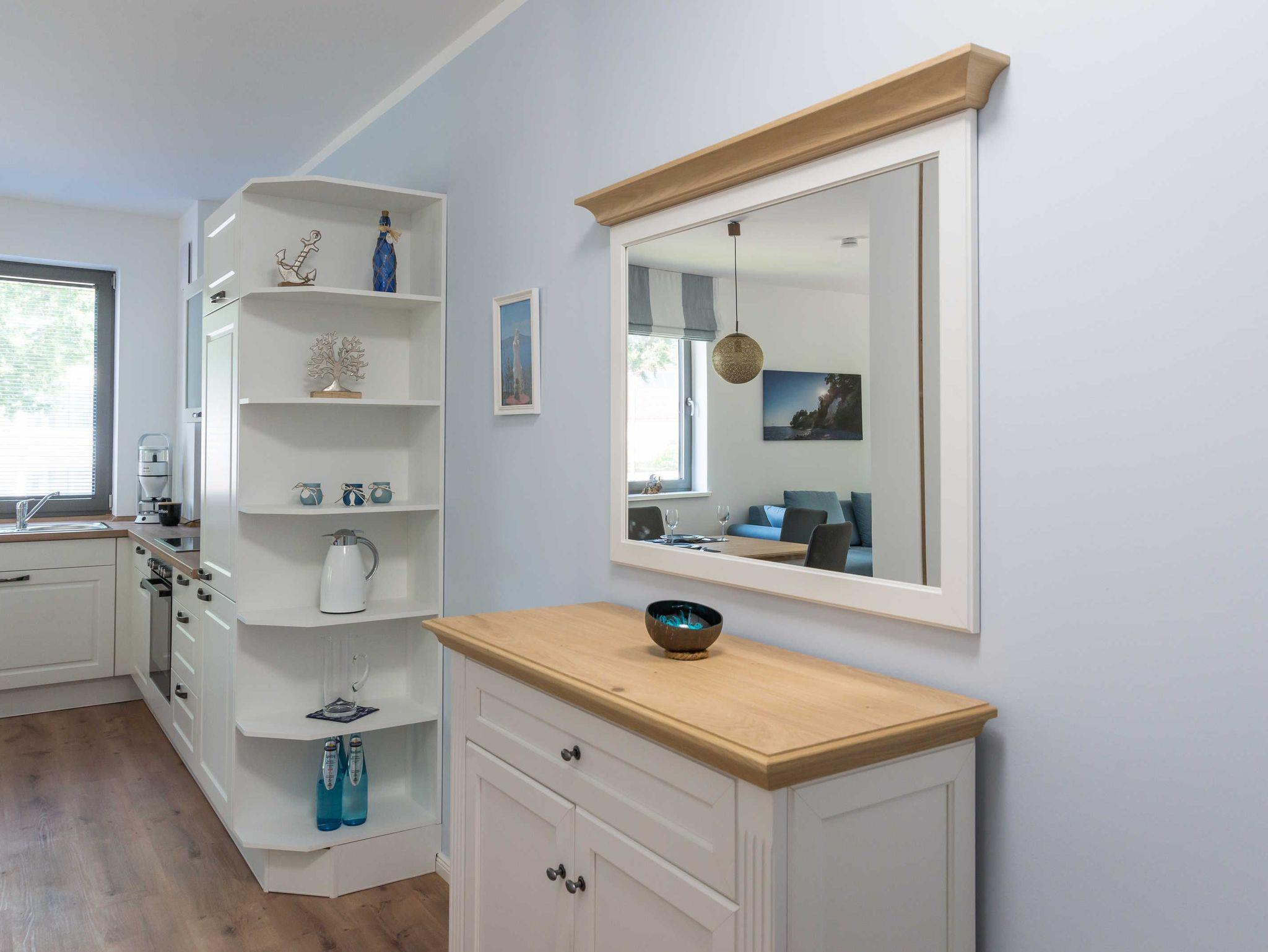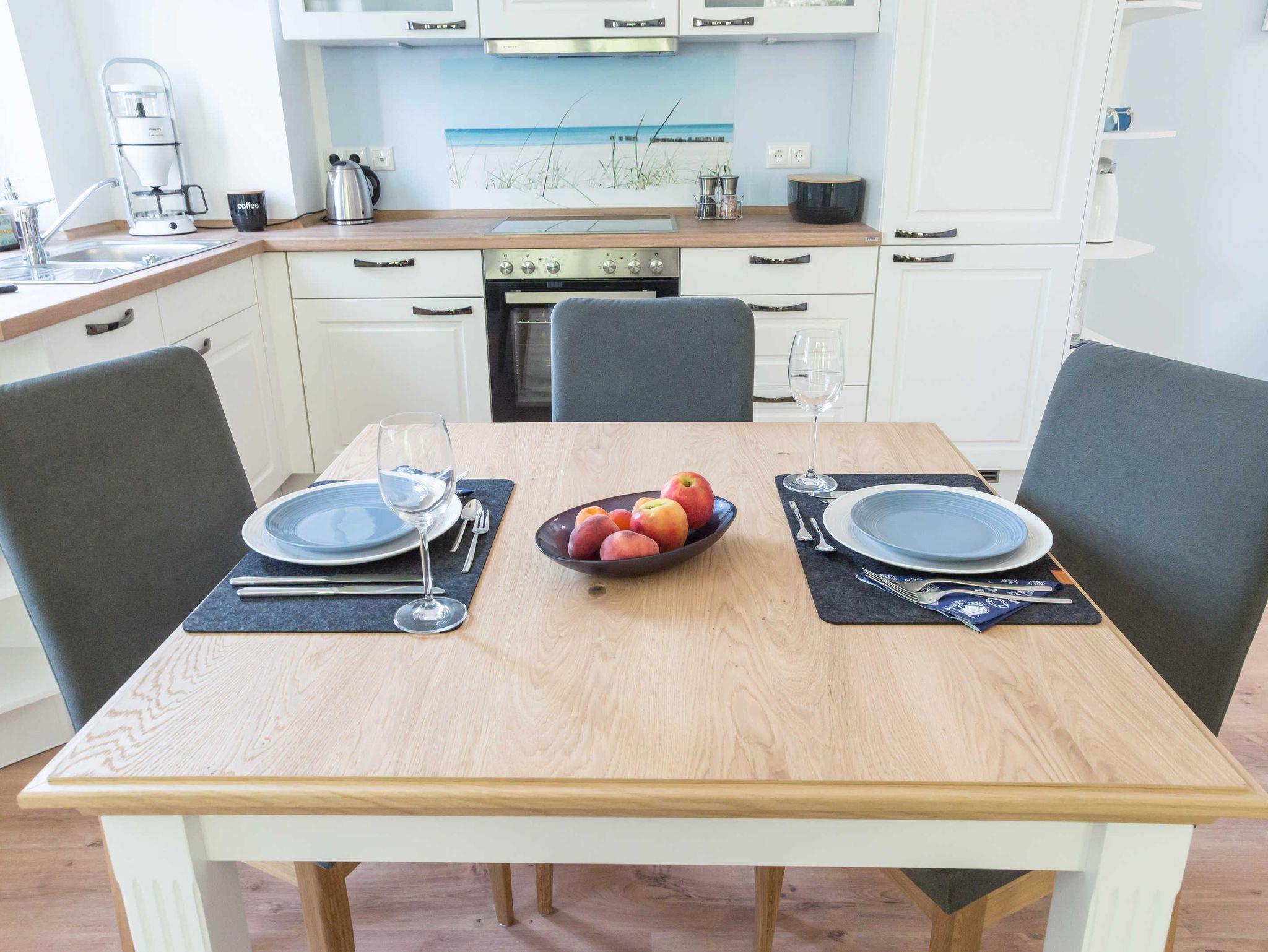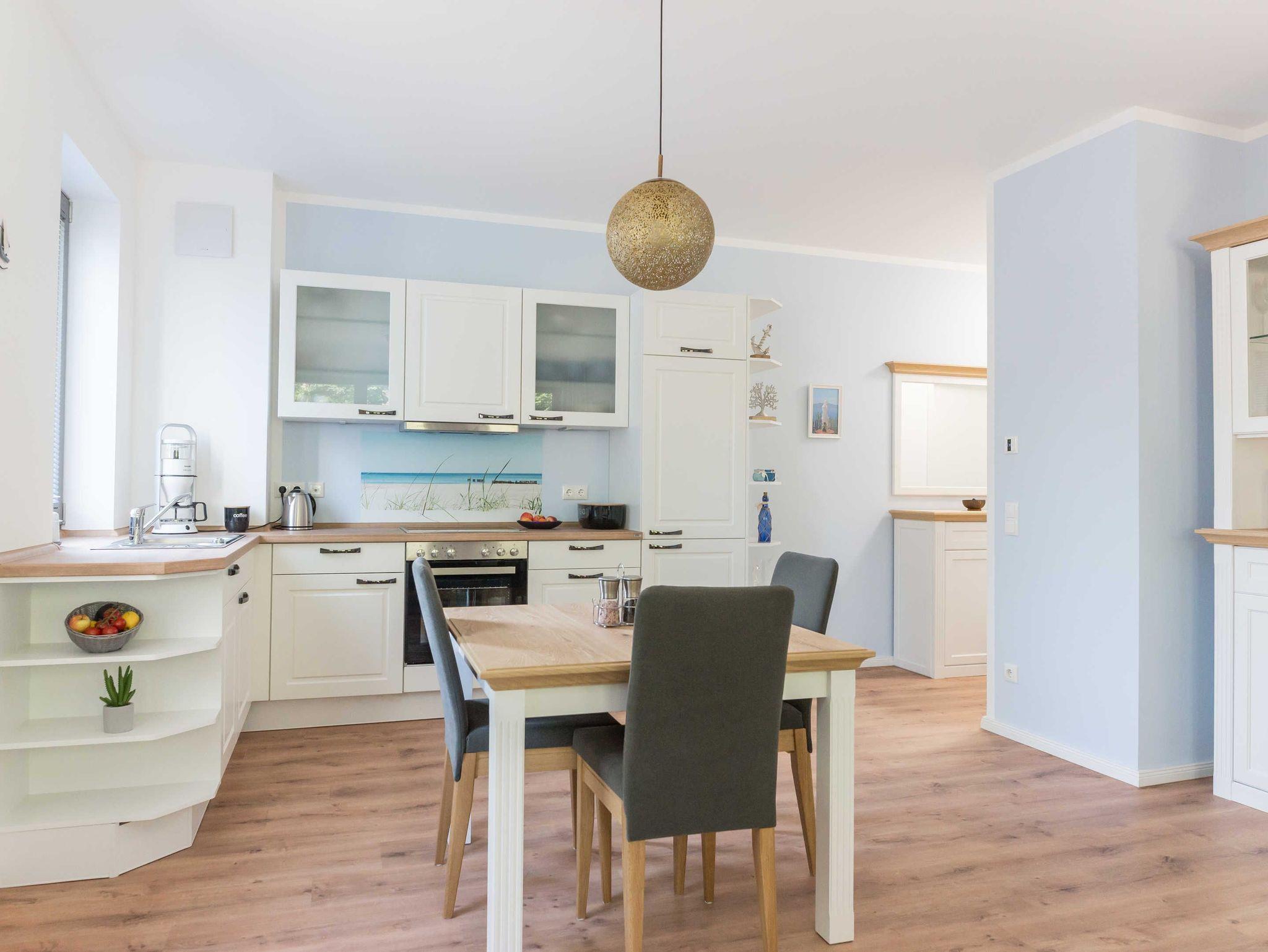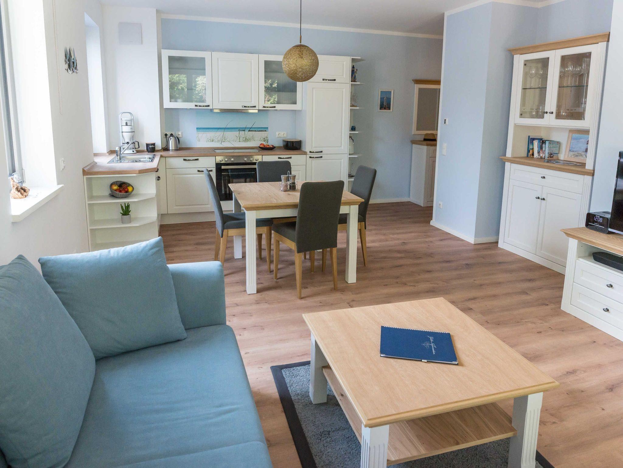 Die stilvoll und komfortabel eingerichtete Nichtraucherferienwohnung ?Blaue Oase? befindet sich in der 1. Etage des Hauses. Die Zwei-Raum-Wohnung bietet für max. 3 Erwachsene auf 51 qm Platz zum Wohlfühlen und Entspannen. Die Wohnung ist mit viel Liebe zum Detail für einen angenehmen Aufenthalt eingerichtet. Sie ist komplett mit Insektenschutz ausgestattet und Allergiker freundlich. Der offene Wohnbereich ist mit modernen Möbeln ausgestattet und verfügt über eine bequeme ausziehbare Couch (1,60m x 2,00m) in modischem Blau sowie einen Sessel, einen Couchtisch, einer Stehlampe, ein Sideboard und eine Vitrine. Für die Unterhaltung stehen Ihnen ein Smart-TV und ein DAB-Radio mit Bluetooth zur Verfügung sowie ein kostenloser Internetanschluss (WLAN). Von hier gelangen Sie auch auf den überdachten Balkon (Norden), wo Ihnen eine Sitzgarnitur für einen gemütlichen Tagesausklang in der Abendsonne zur Verfügung steht. Dabei genießen Sie einen entspannenden Blick auf den Park. Die hochwertig eingerichtete Einbauküchenzeile im Landhausstil besitzt ein Cerankochfeld, Backofen, Kühlschrank mit Gefrierfach, Toaster, Wasserkocher, Kaffeemaschine, Eierkocher sowie umfangreiche Küchenutensilien. Der Essbereich schließt sich an und besteht aus einem Esstisch und gepolsterten Stühlen. Die Fenster sind hier nach Osten gerichtet, so dass Sie zum Frühstück die Morgensonne genießen können. Für einen erholsamen Schlaf steht Ihnen ein bequemes Doppelbett (1,80m x 2,00m) mit verstellbaren Lattenrosten zur Verfügung. Nachttisch mit Leuchten, ein großzügiger Kleiderschrank und eine Verdunklungsmöglichkeit ergänzen die Ausstattung im Schlafzimmer. Alle Räume haben hochwertige Böden aus Vinyl in schöner Eichenoptik. Eine Fußbodenheizung sorgt an kühleren Tagen für wohlige Wärme. Im innenliegenden Bad finden Sie einen Waschtisch, ein Wandspiegel, eine ebenerdige Regendusche, ein WC, ein Fön sowie ein Handtuchtrockner. Der Flurbereich ist mit einer Kommode, einem Spiegel und einem Wandschrank ausgestattet. Die Wohnung verfügt über einen Staubsauger, einen Wäscheständer und Reinigungsutensilien. Ihre eigenen oder gemieteten Fahrräder können Sie in einen Fahrradständer im begrünten Außenbereich abstellen und sichern. In der Tiefgarage (Einfahrtshöhe 2,15m) steht Ihnen ein PKW-Stellplatz (Nr. 95) zur Verfügung. Von dort können Sie mit Ihren Koffern und Einkäufen bequem mit dem Fahrstuhl zur Wohnung ?Blaue Oase? im 1. OG fahren. Haustiere sind nicht erlaubt. Die Erstausstattung eines Wäschepaketes (komplette Bettwäsche, 1 Duschhandtuch, 2 kleine Handtücher) können Sie bis 14 Tage vor der Anreise gegen einen Aufpreis dazu buchen oder durch eigene ergänzen. Ab 2 gebuchten Paketen erhalten Sie einmalig 1 Geschirrtuch und einen Duschvorleger dazu. Genießen Sie Ihren Aufenthalt in der Blauen Oase ? einfach ein Ort des Wohlfühlens.