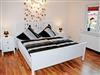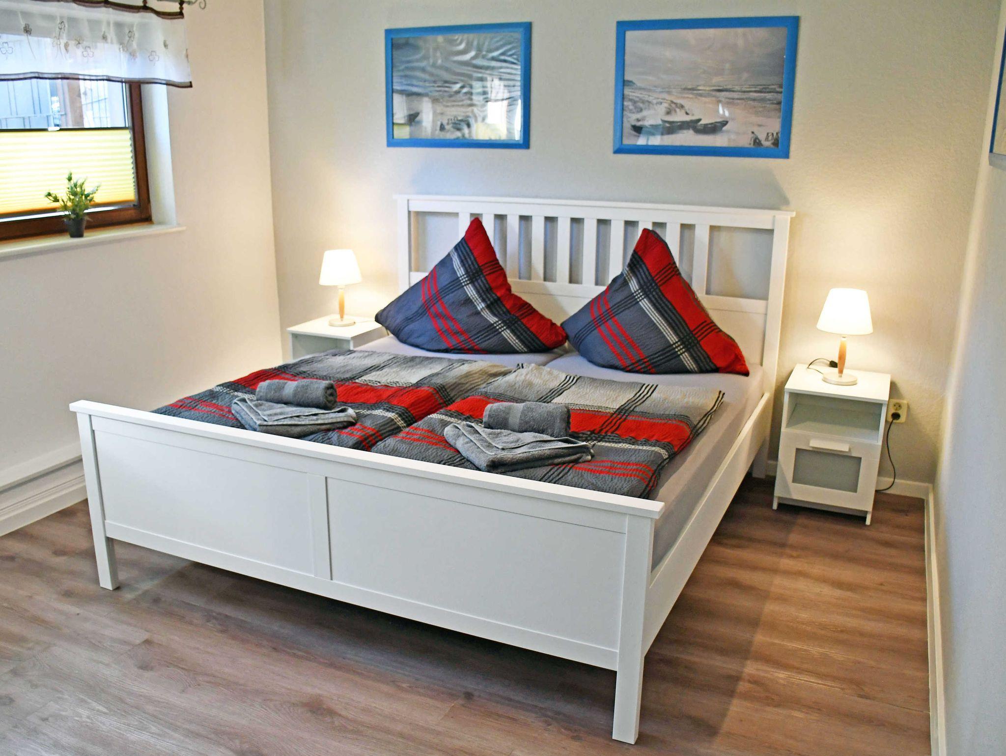 Im Schlafzimmer stehen ein Doppelbett mit Nachttischen und Leselampen und ein Kleiderschrank. Ein kleines Kinderreisebett und ein Hochstuhl können auf Wunsch kostenlos bereitgestellt werden.