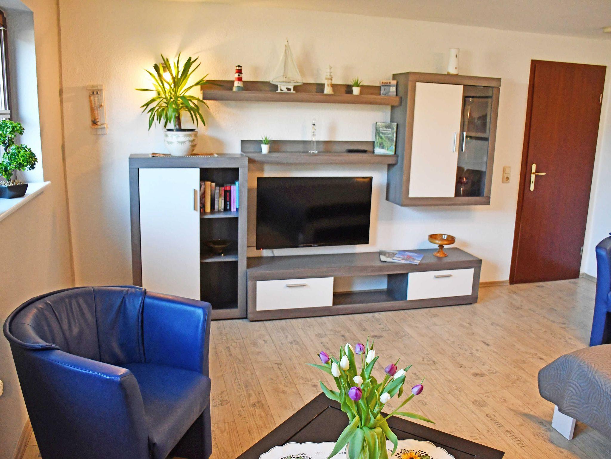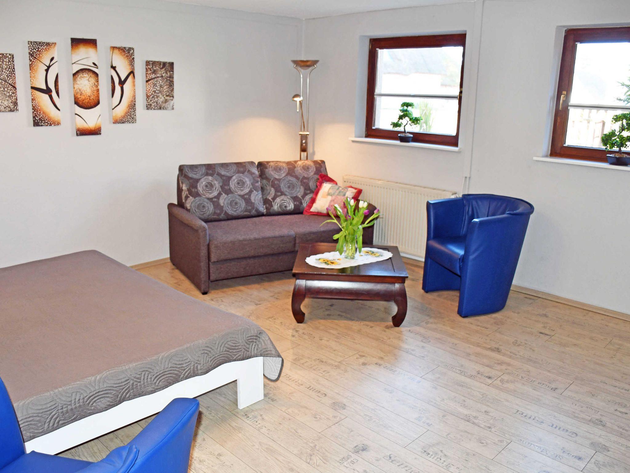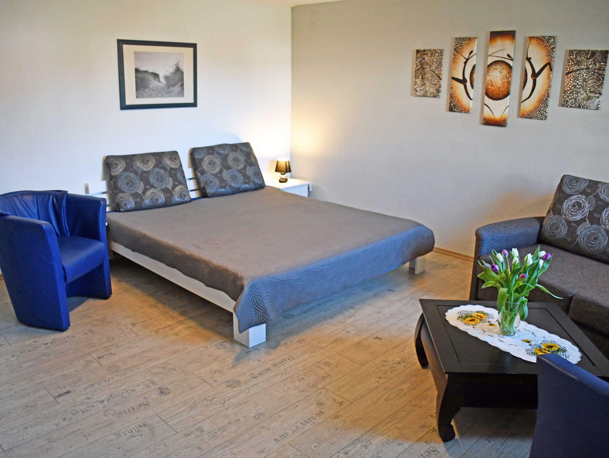 Im großen Wohn-Schlafraum befinden sich ein Kleiderschrank, eine Sitzecke mit Schlafcouch für 2 Gäste und Stühle sowie ein modernes Flachbild-TV-Gerät. Die Wohnung verfügt über WLAN-Internet.