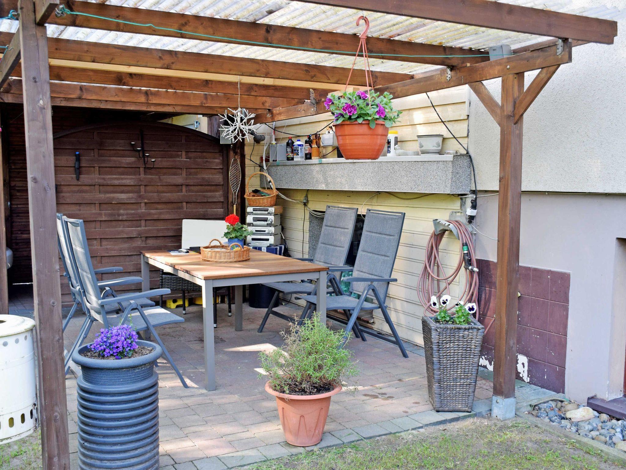 Zu dieser Ferienwohnung gehört auch eine schöne Terrasse mit Gartenmöbeln im Garten hinter dem Haus.