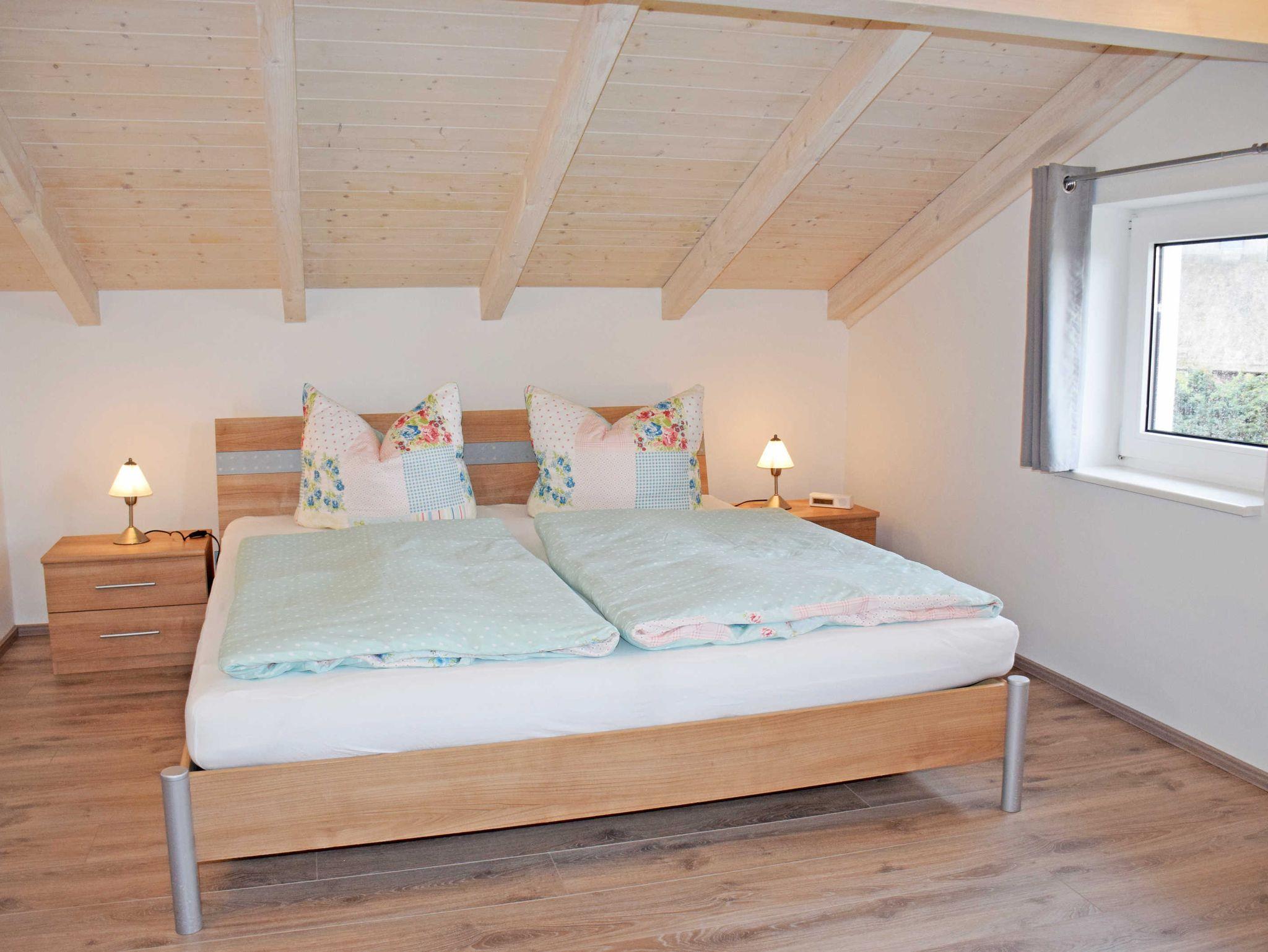 Im Flur erreicht man über eine Treppe das Obergeschoss. Hier befinden sich 2 Schlafzimmer und ein weiteres Bad mit WC und Waschbecken. Das erste Schlafzimmer ist mit einem bequemen Doppelbett (1,80m x 2,00 m) mit Nachttisch und Leselampen und ein Kleiderschrank ausgestattet. Das zweite Schlafzimmer verfügt auch über ein Doppelbett (1,80m x 2,00m) mit Nachttischen und Leselampen sowie Kommode.