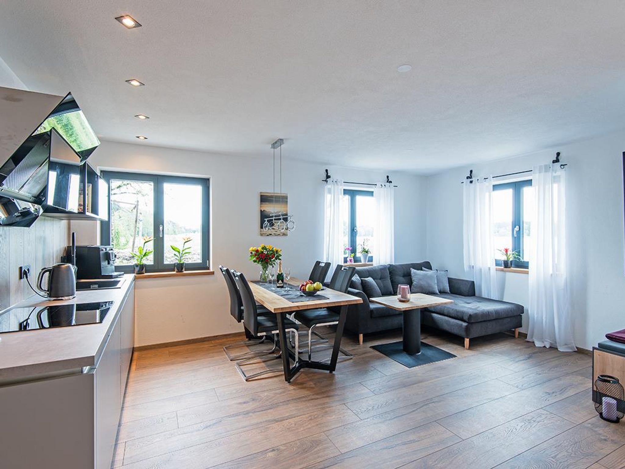 Die Ferienwohnung befindet sich im Erdgeschoss. Der Eingangsbereich besteht aus einem urigen sowie modernen open Space Bereich mit Wohnlandschaft sowie Essecke und einer modernen und voll ausgestatteten Einbauküche.