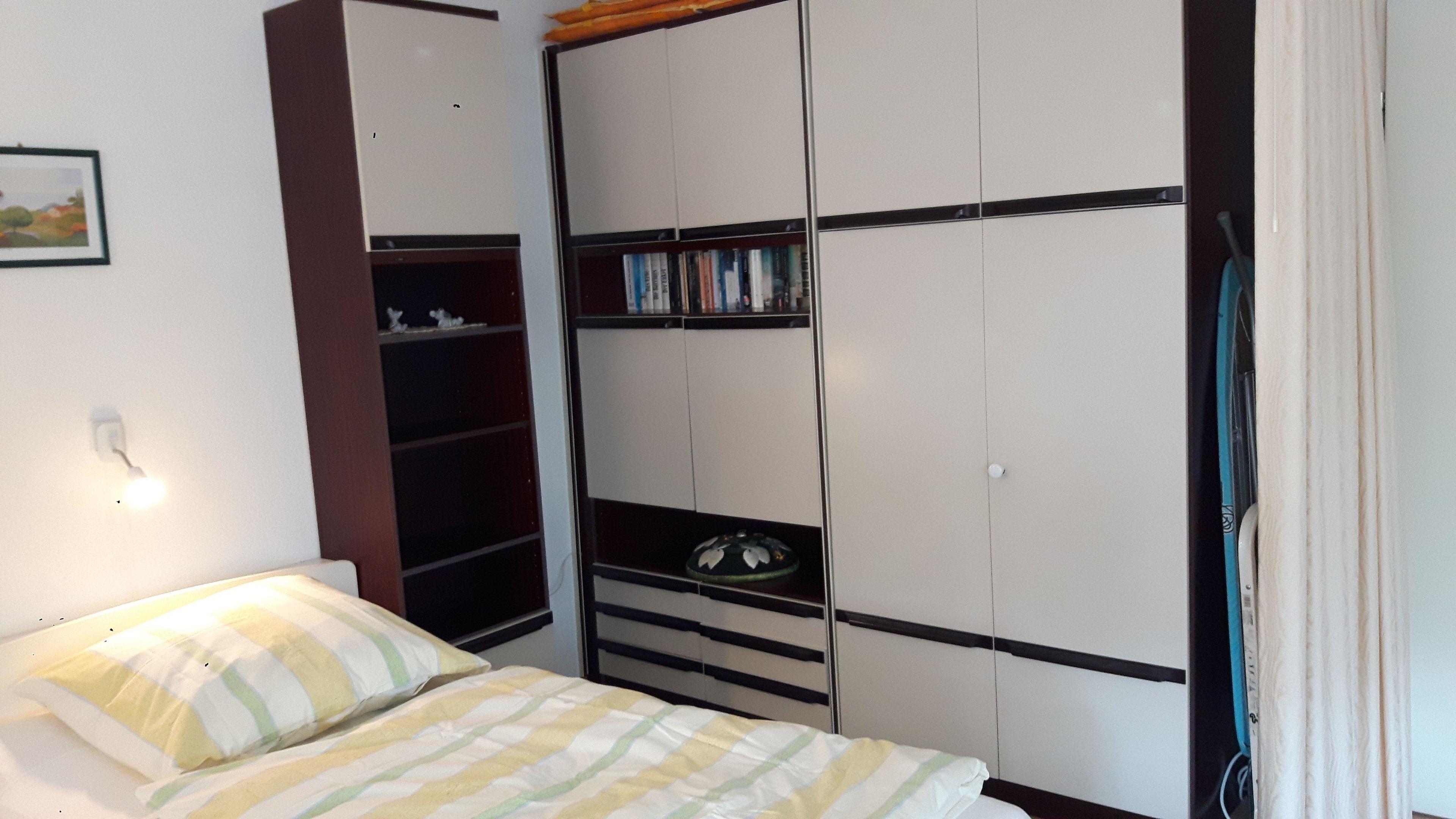 Ein geräumiger Kleiderschrank mit genügend Stauraum ist vorhanden.